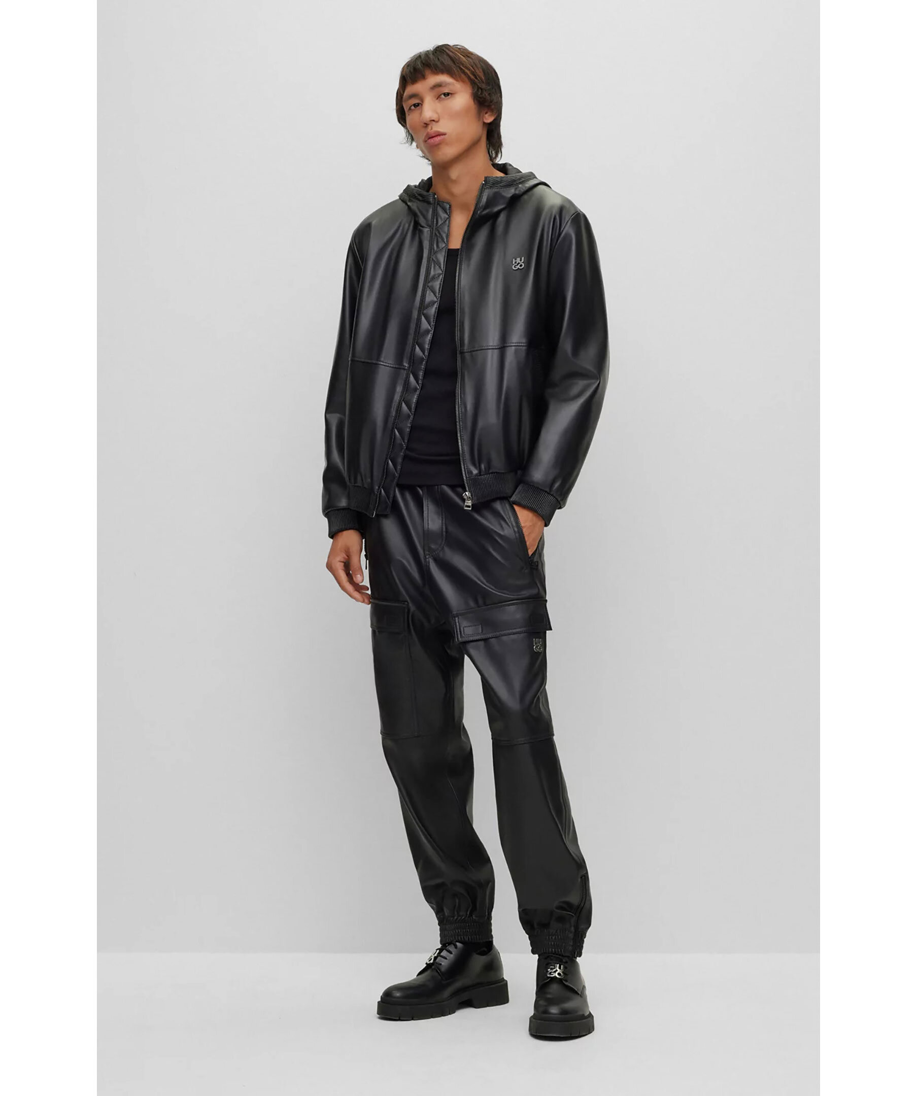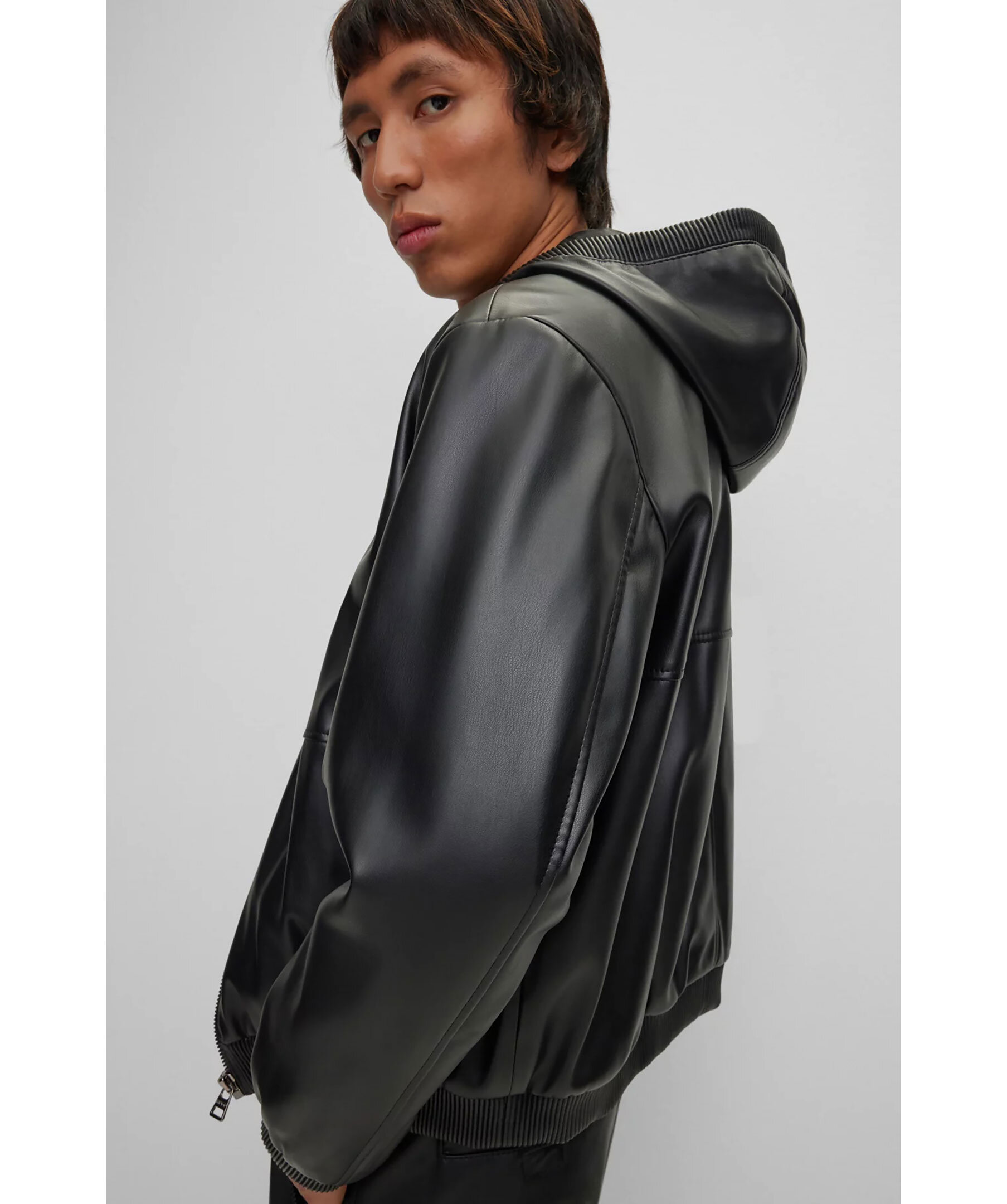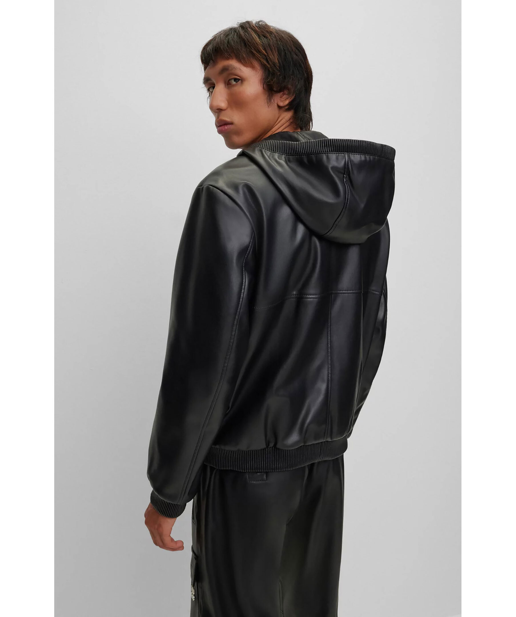 En svart modern huvjacka från HUGO Herr, designad i syntetmaterial med dragkedja framtill och en staplad logga. Jackan har två sidfickor och ribbade muddar vid ärm- och plaggslut. Syntetmaterial, som ibland kallas ”läderimitation”, är ett material som är utformat för att likna äkta läder och/eller ha en matt, glansig, mjuk eller texturerad yta.