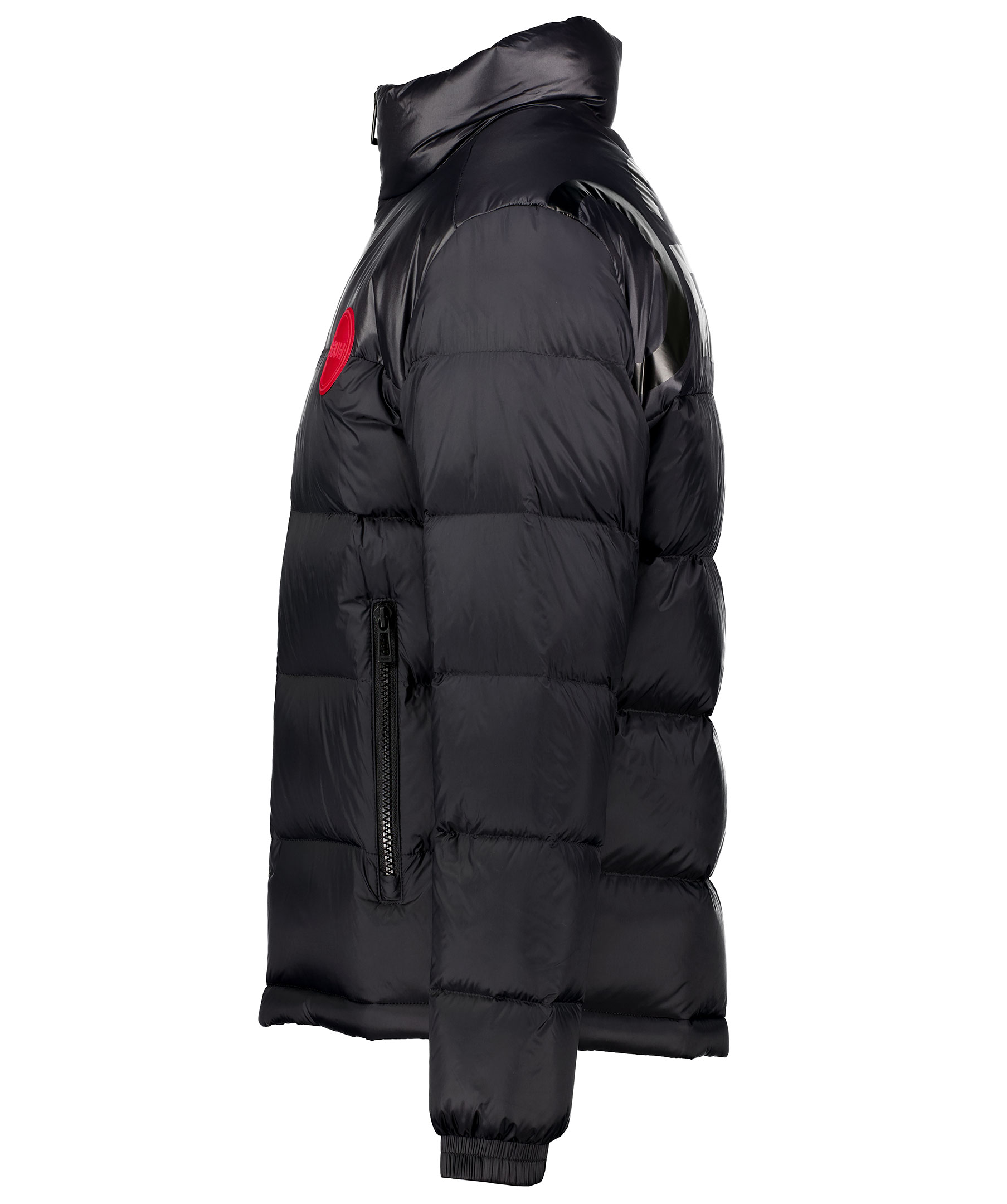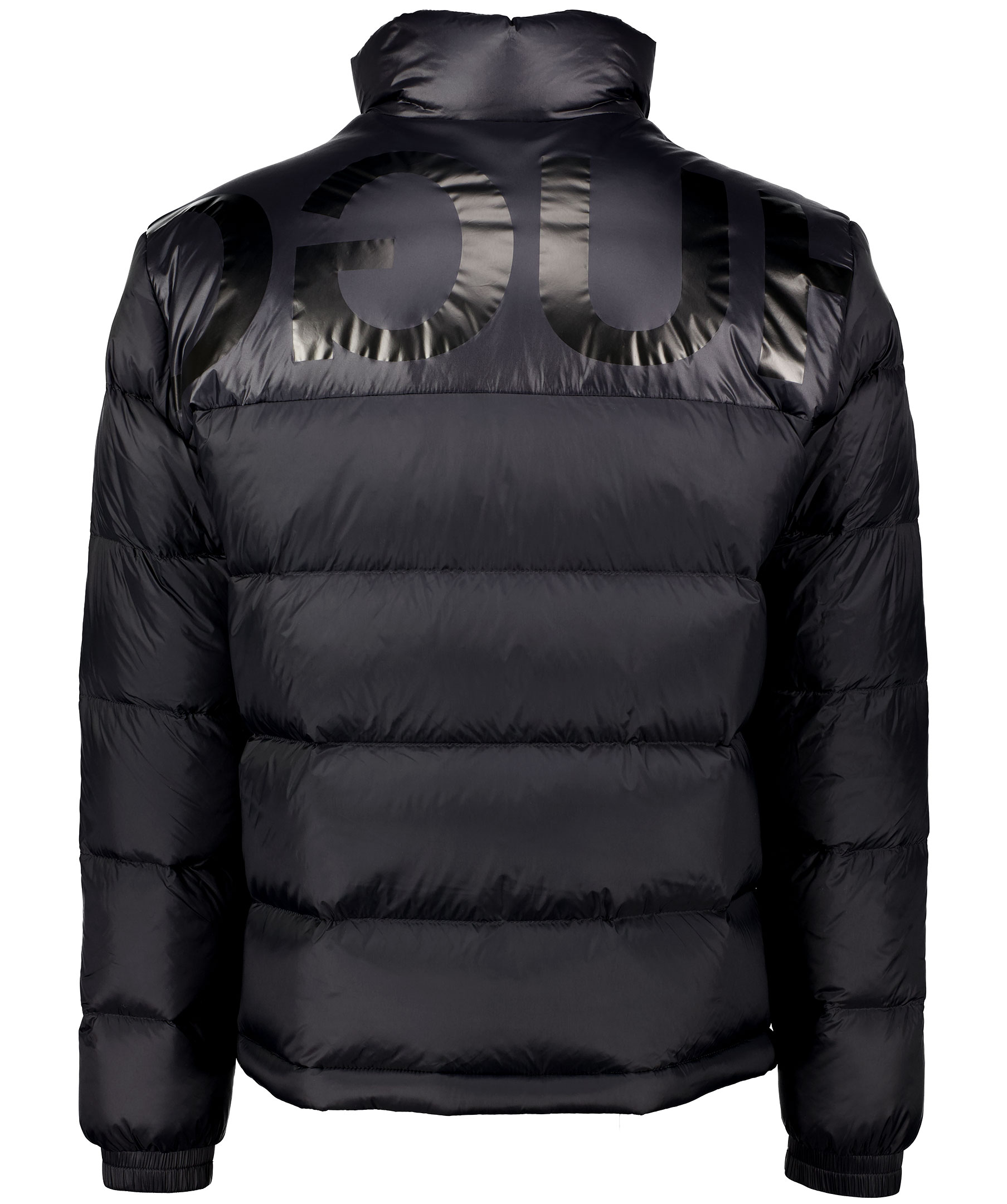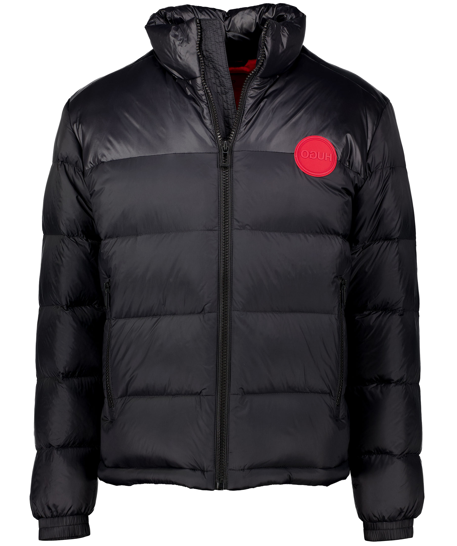 Svart dunjacka från HUGO. Gjord i ett mattsvart polyamidtyg, rött foder på jackan insida. Röd, rund gummerad logotyp på bröstet. Två framfickor med dragkedja och två innerfickor - en öppen och en som stängs med dragkedja. Justerbar dragsko nertill på jackan. Elastisk mudd i ärmslut. Stor omvänd logga tryckt längst övre ryggen på jackan.