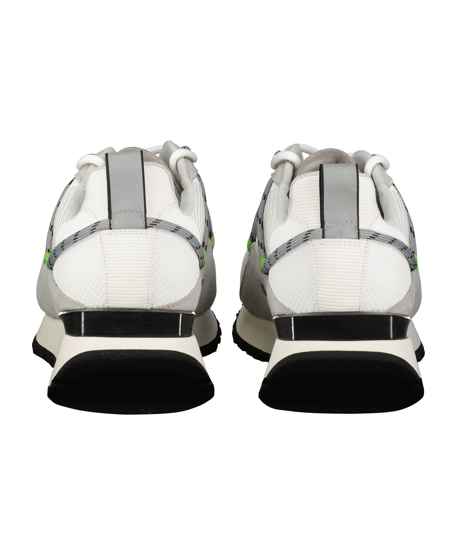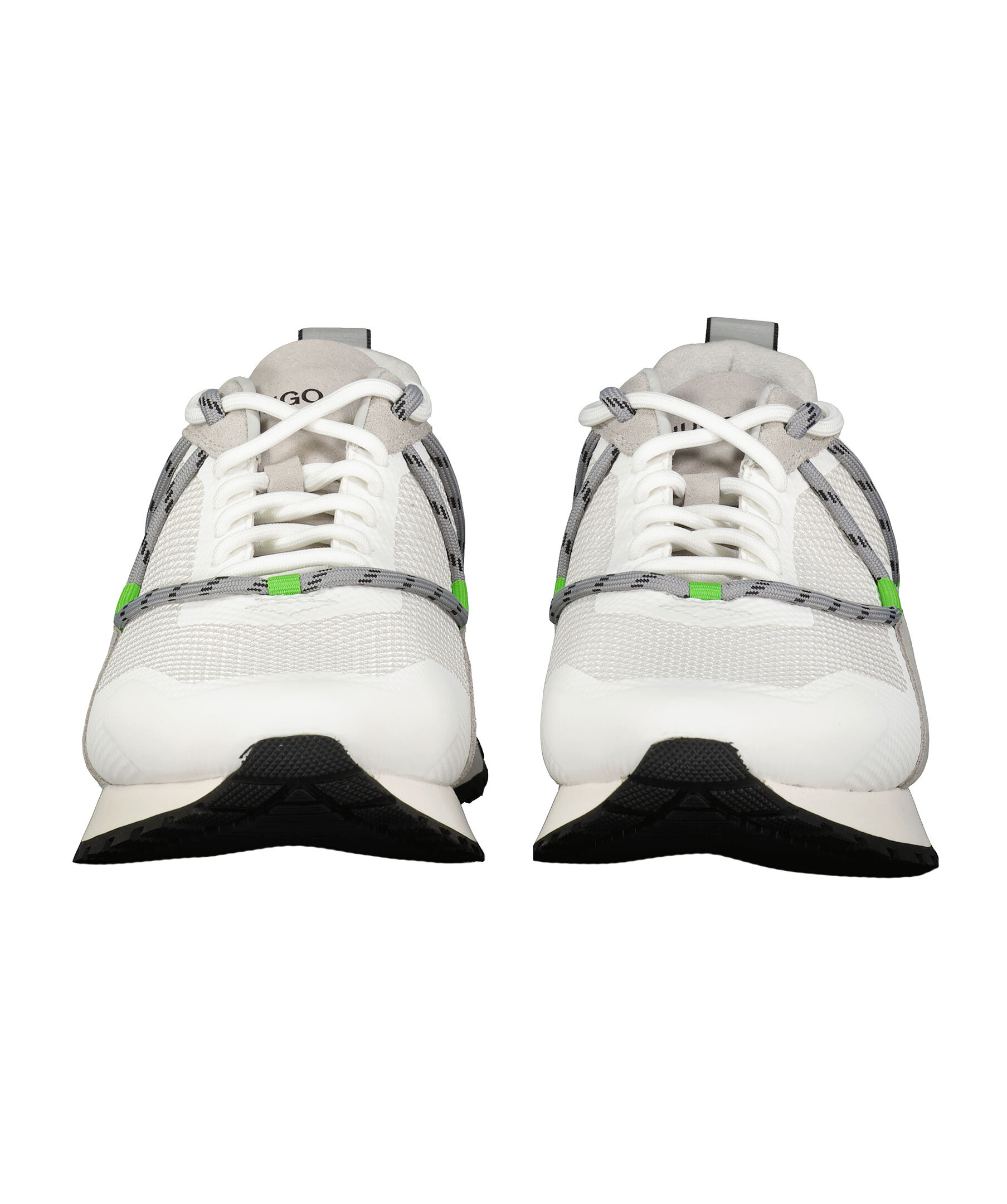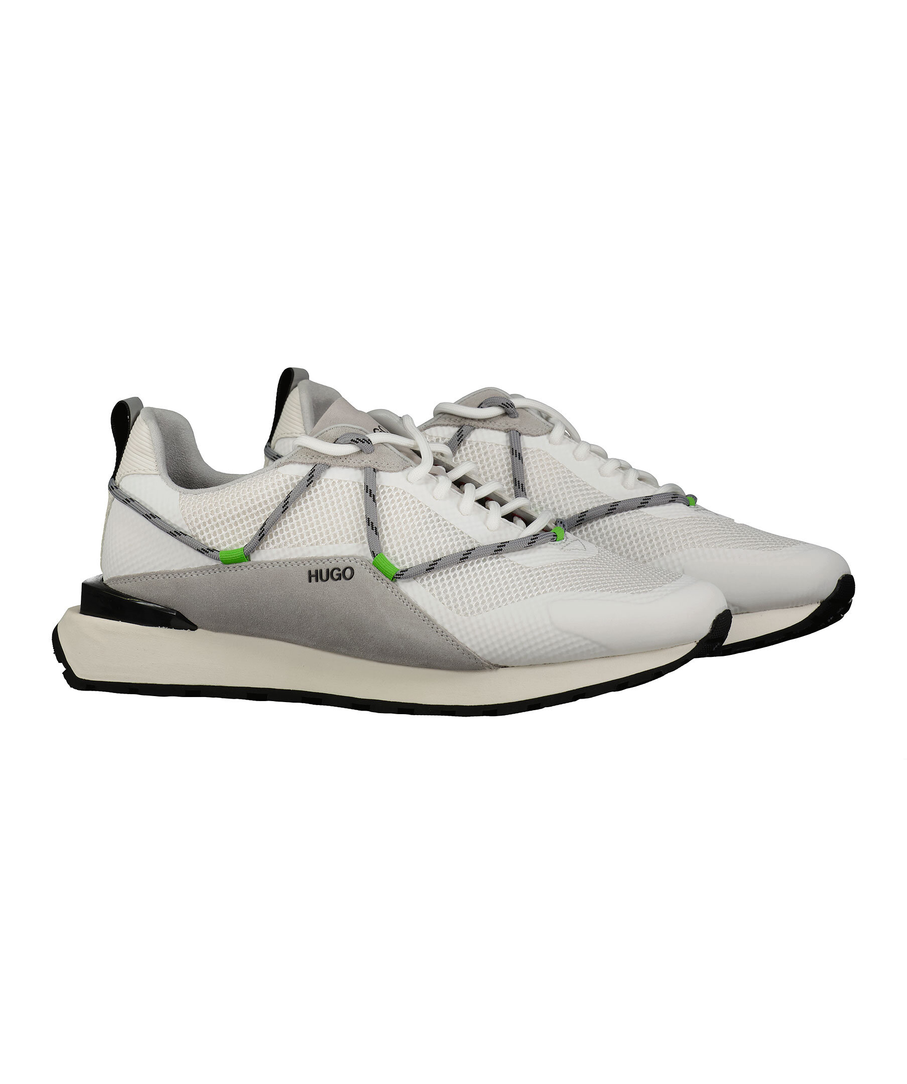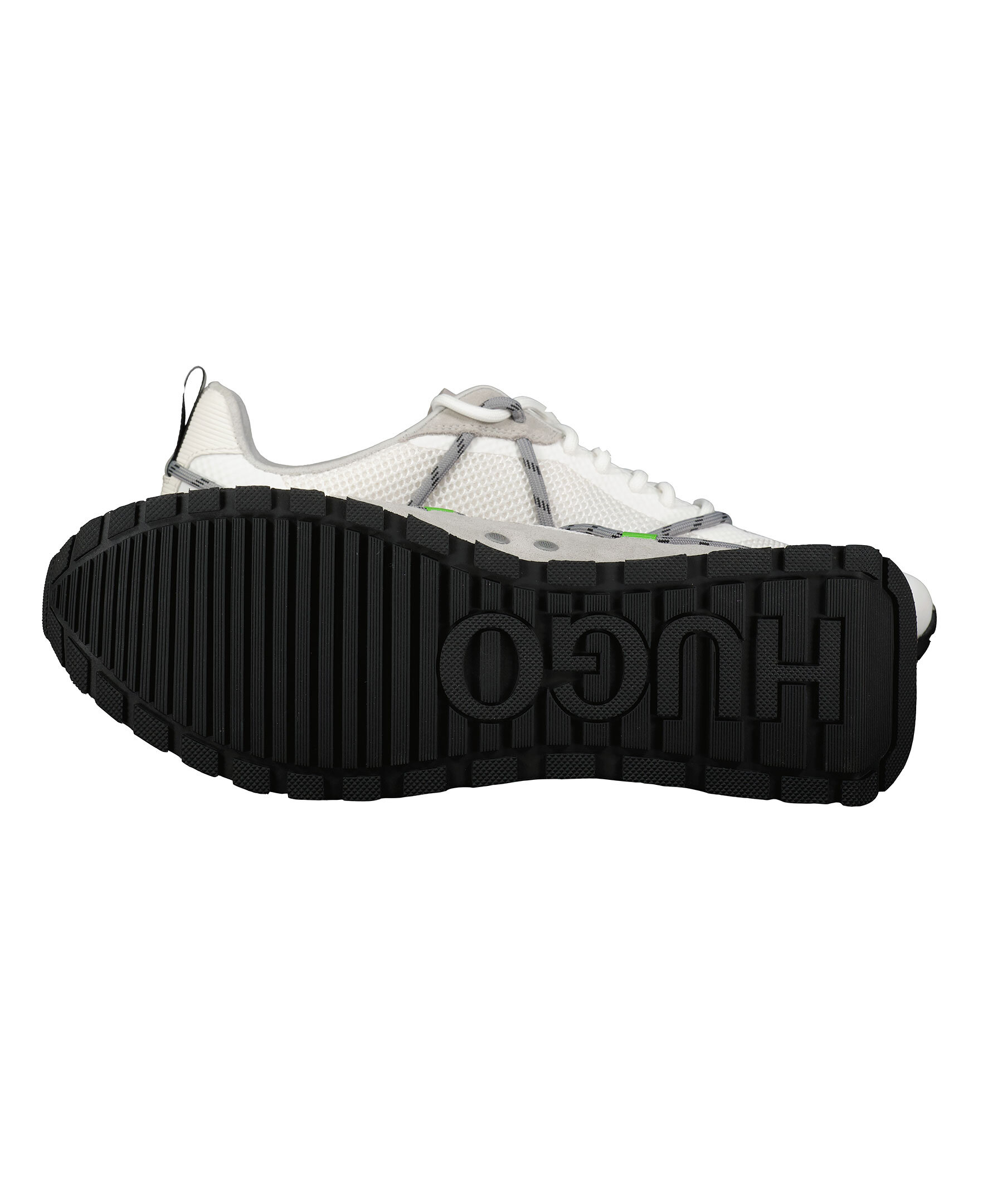 Vita sneakers i mesh från Hugo. Hög sula i gummi. Detaljer i grå mocka. Runda vita skosnören. Detalj med runda snören i svart och grått. Logotyp i svart på skons yttersida, på plösen. Ögla på hälen i reflexfärg.