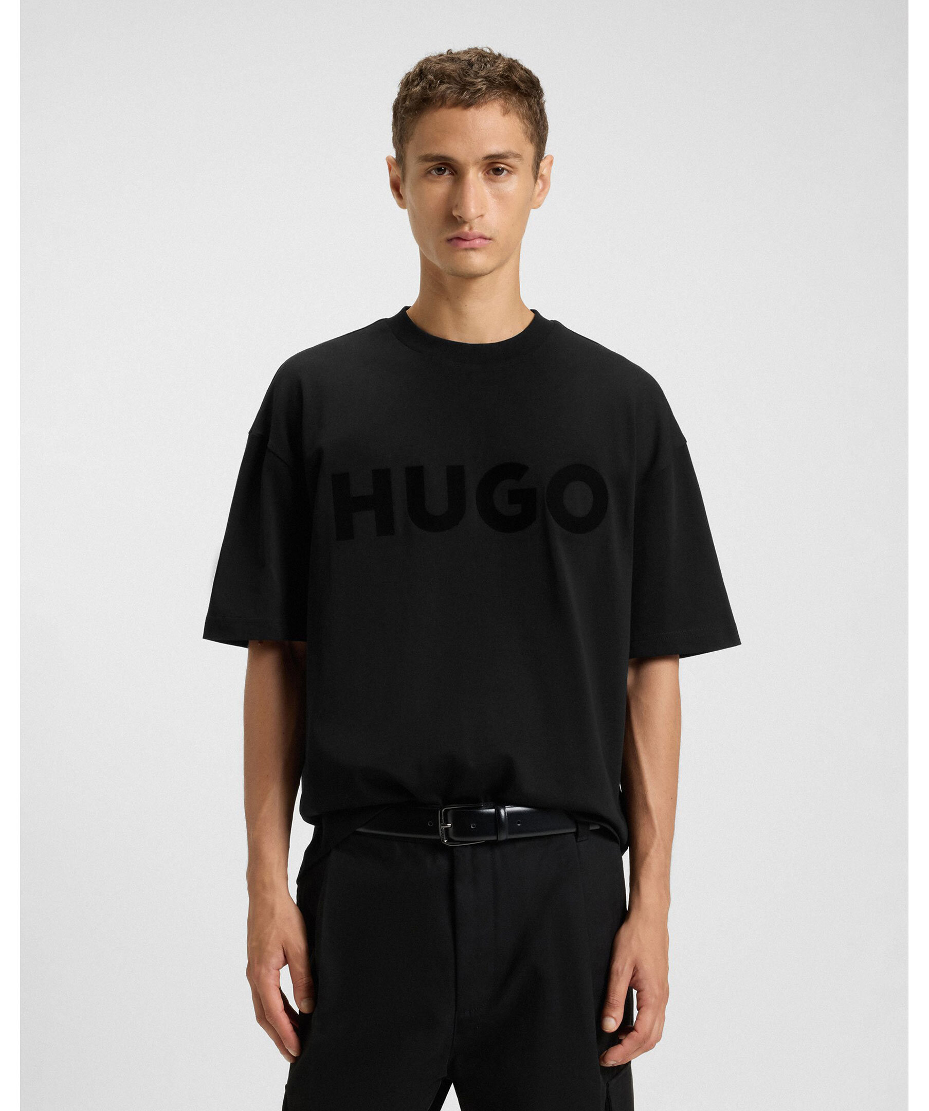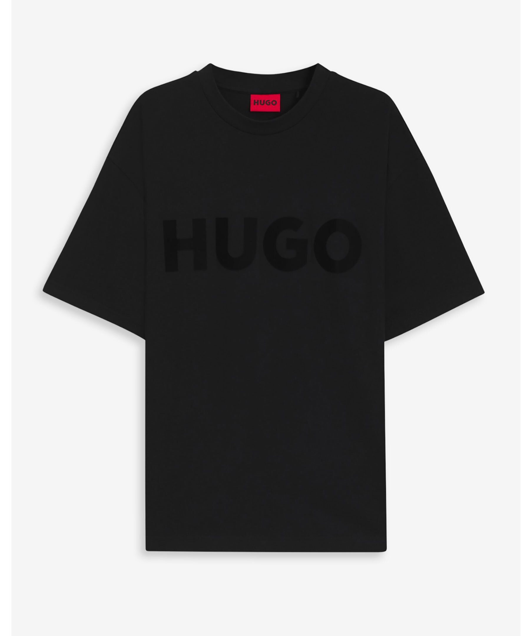 Svart HUGO-t-shirt med klassisk rund hals och korta ärmar. Den framträdande HUGO-logotypen är tryckt på framsidan, vilket ger en stilren touch.