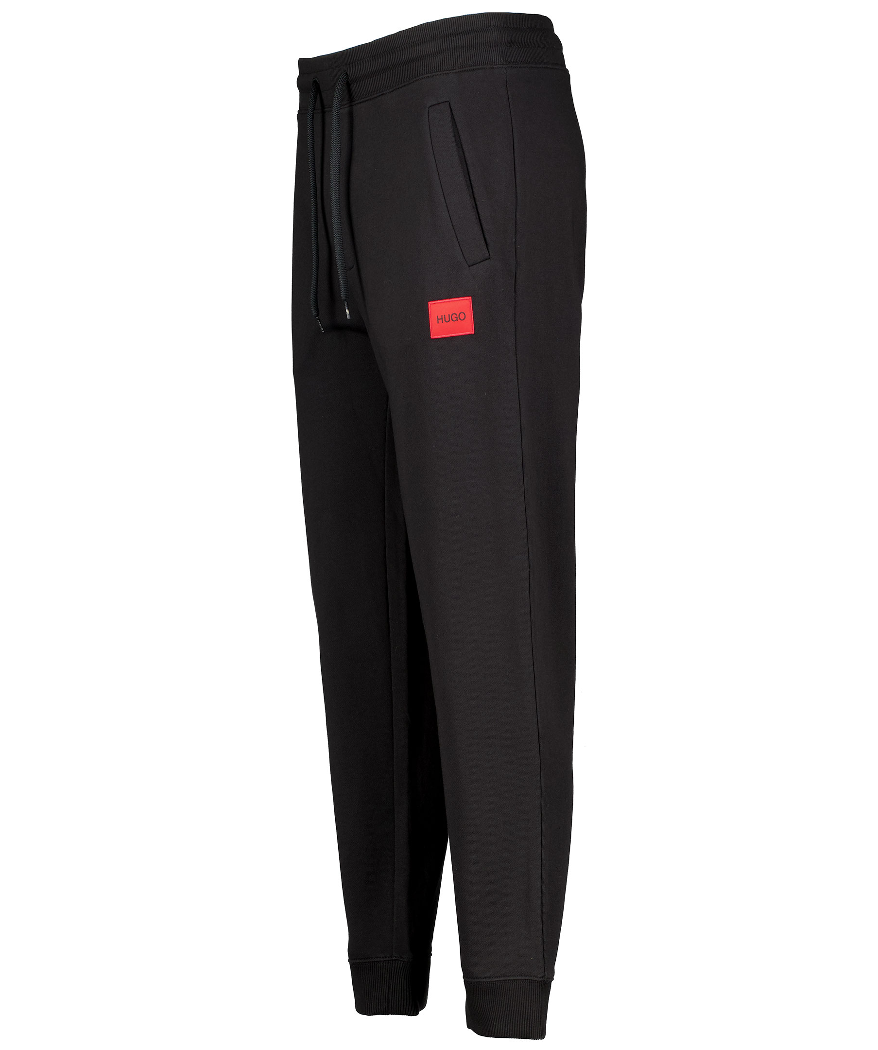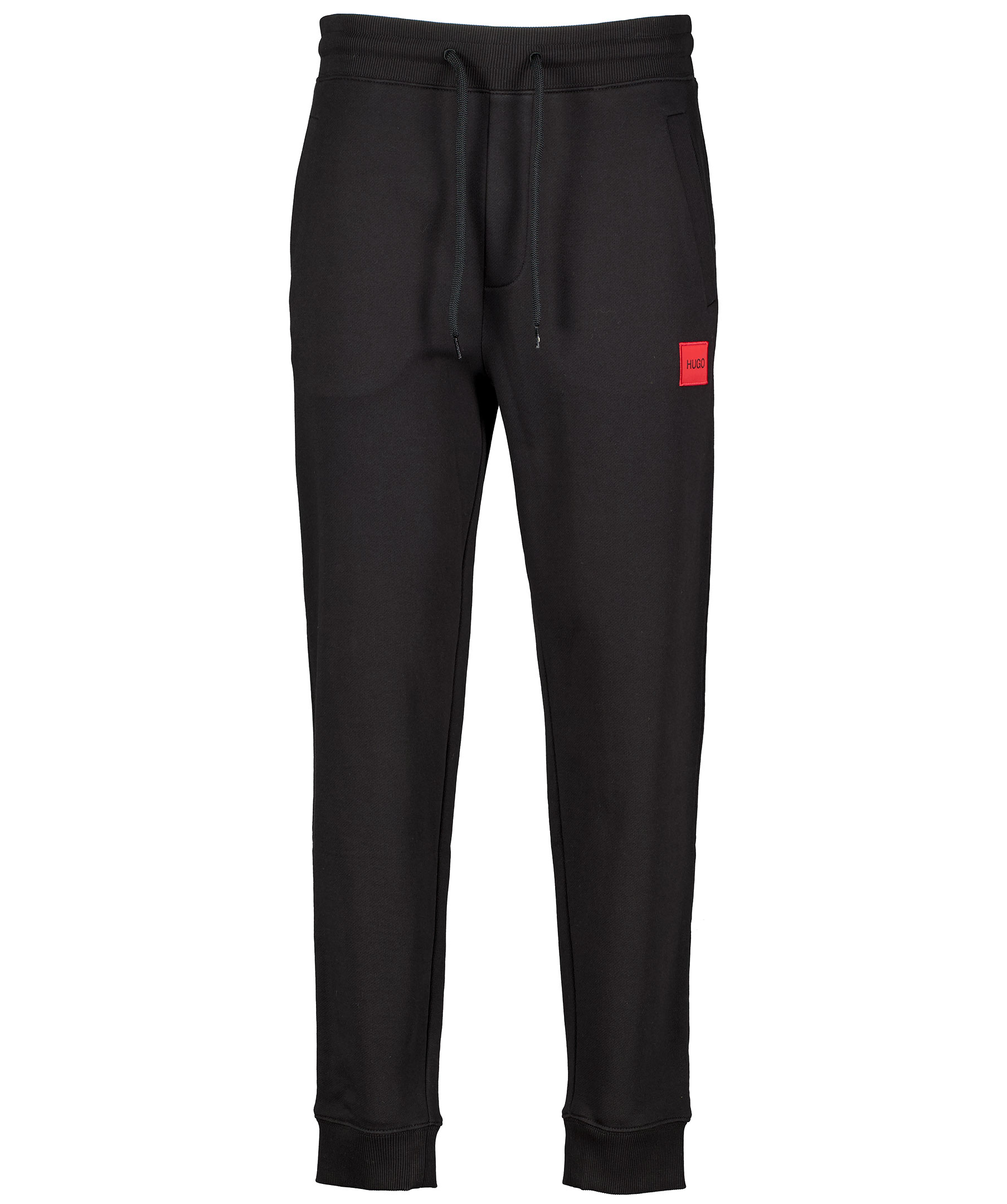 Svarta mjukisbyxor från Hugo. Tillverkade i bomull. Röd, patch med texten "HUGO" i svart, svart snörning i midjan, mudd i midja och benslut. Två sneda fickor fram och en bakficka. *100% bomull *Ribbade muddar *Bakficka och framfickor