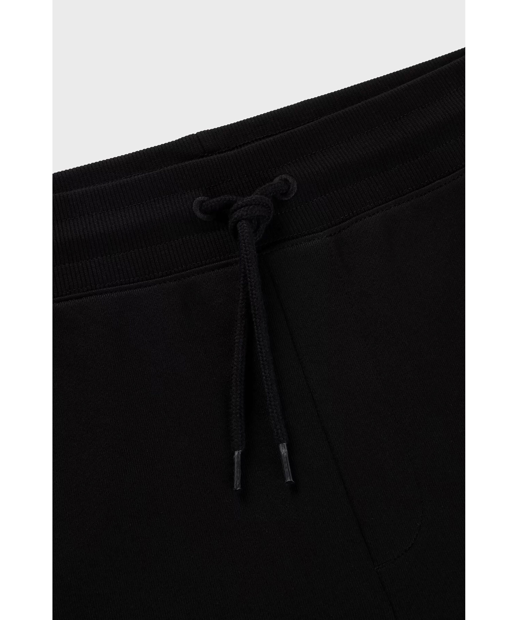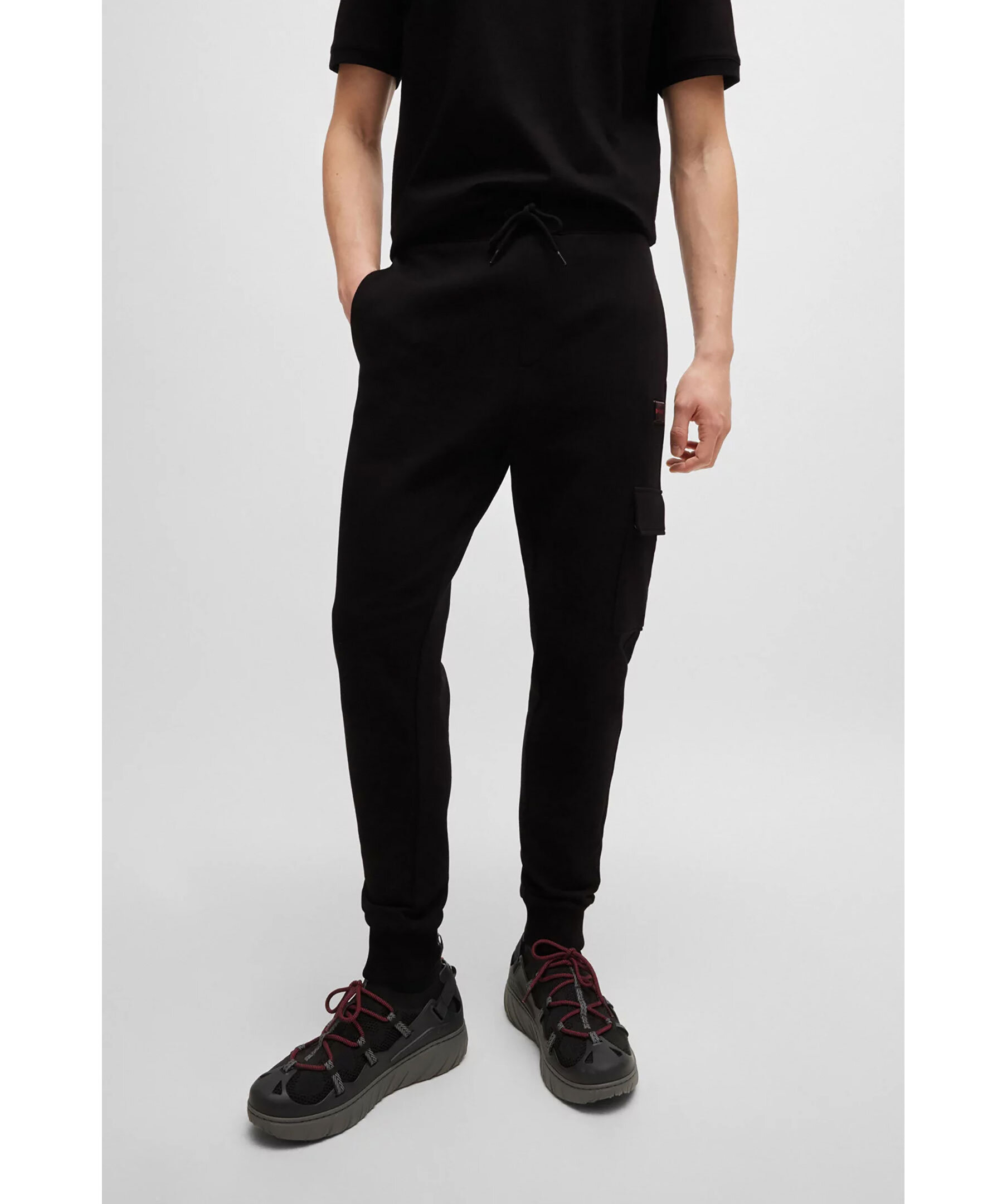 Svarta mjukisbyxor från HUGO. Byxorna har elastisk midja med snörning, två sidfickor, en bakficka samt en ficka på benet med lock och en logga i gelématerial på bröstet. Tillverkade i bomull.