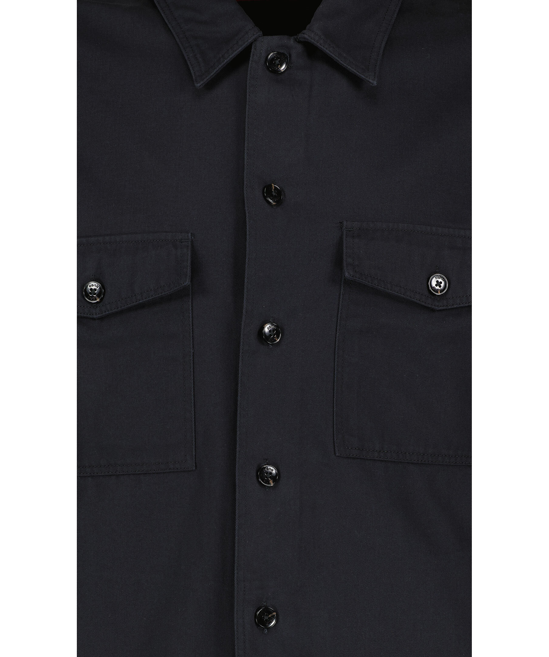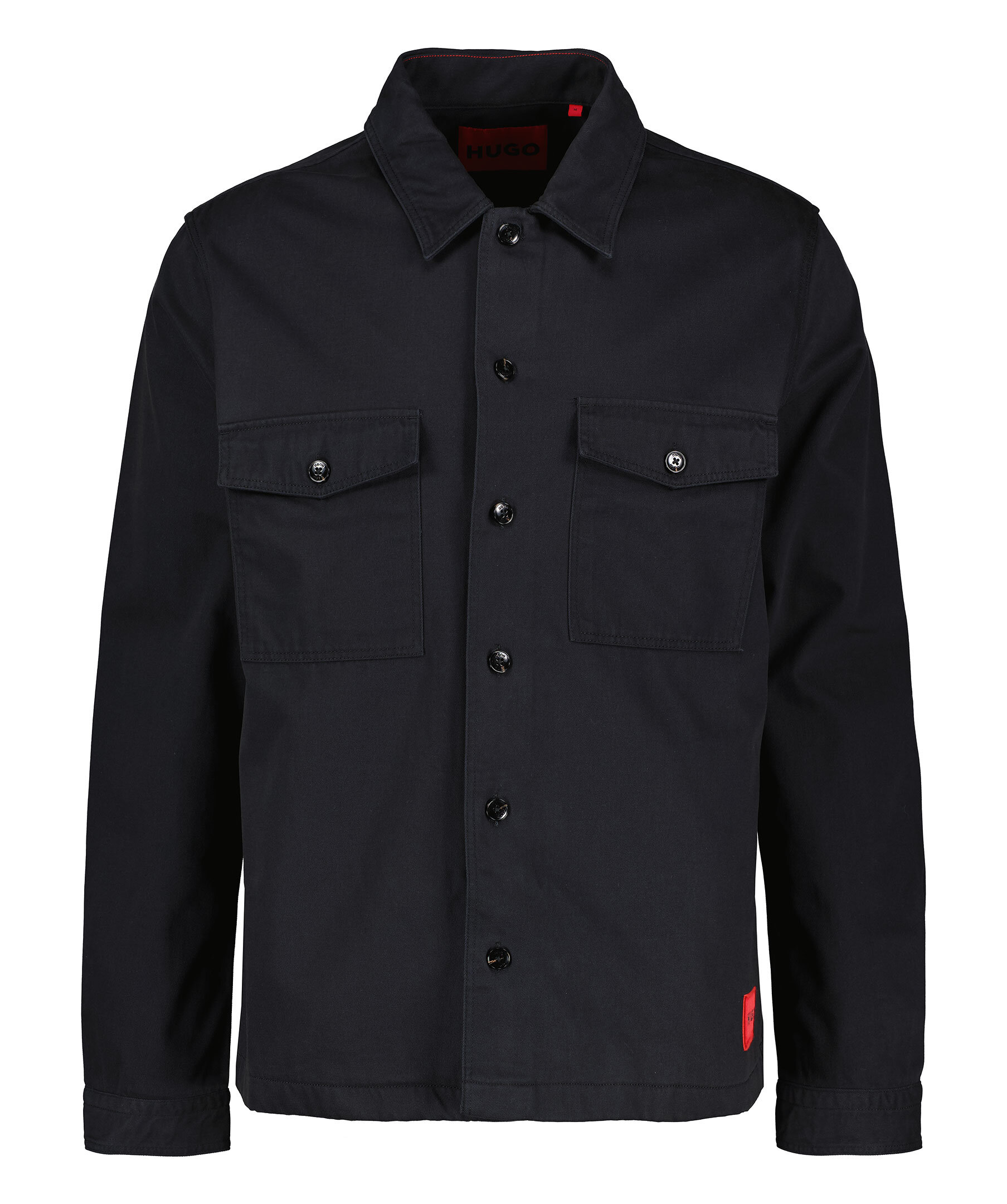Svart Jeanskjorta från HUGO. Stängs framtill med knappar. Två bröstfickor som stängs med lock och knappar. Spetsig krage. Enkla manschetter vid ärmslut. Röd patch med svart logotyp i vänstra hörnet av skjortan.
