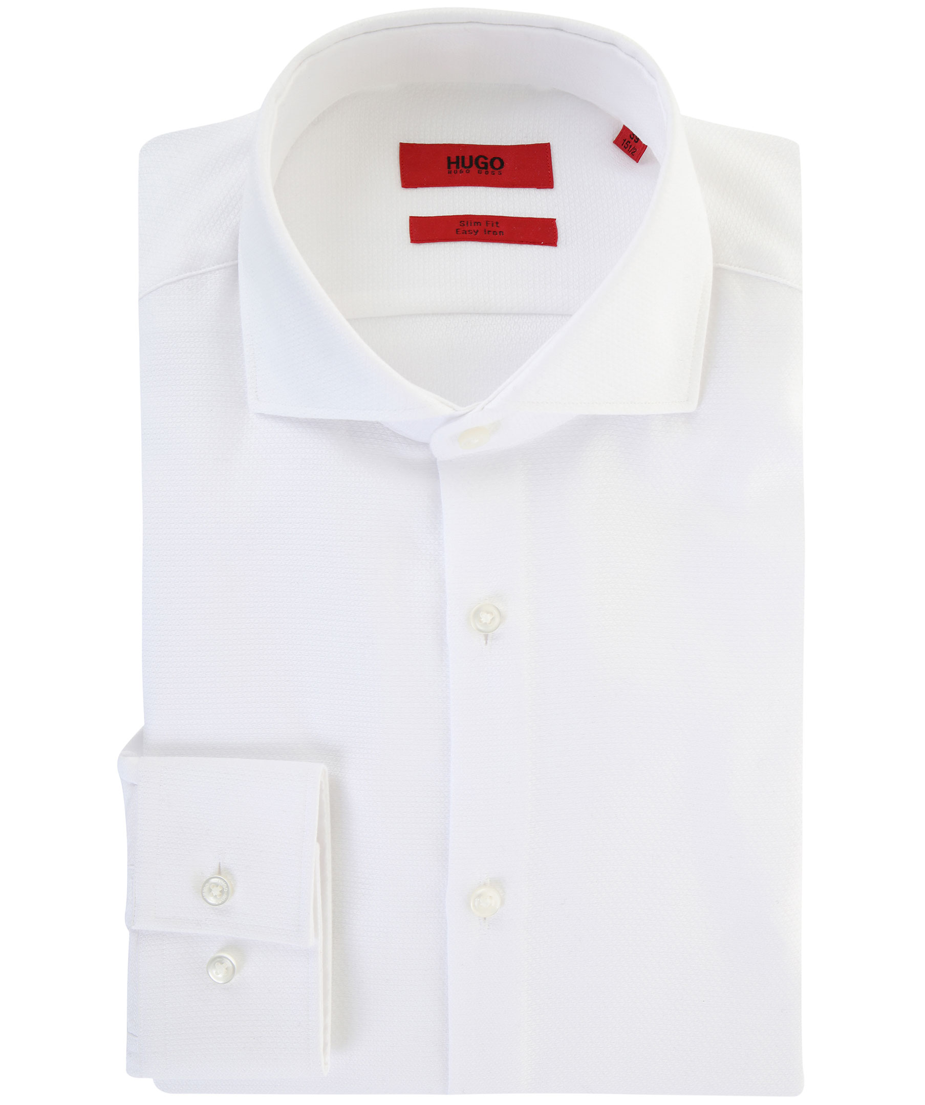 Vit skjorta i slim fit modell från Hugo Boss. Tillverkad i strukturerat, italiensk tyg i 100% bomull. Vid krage och vita knappar.