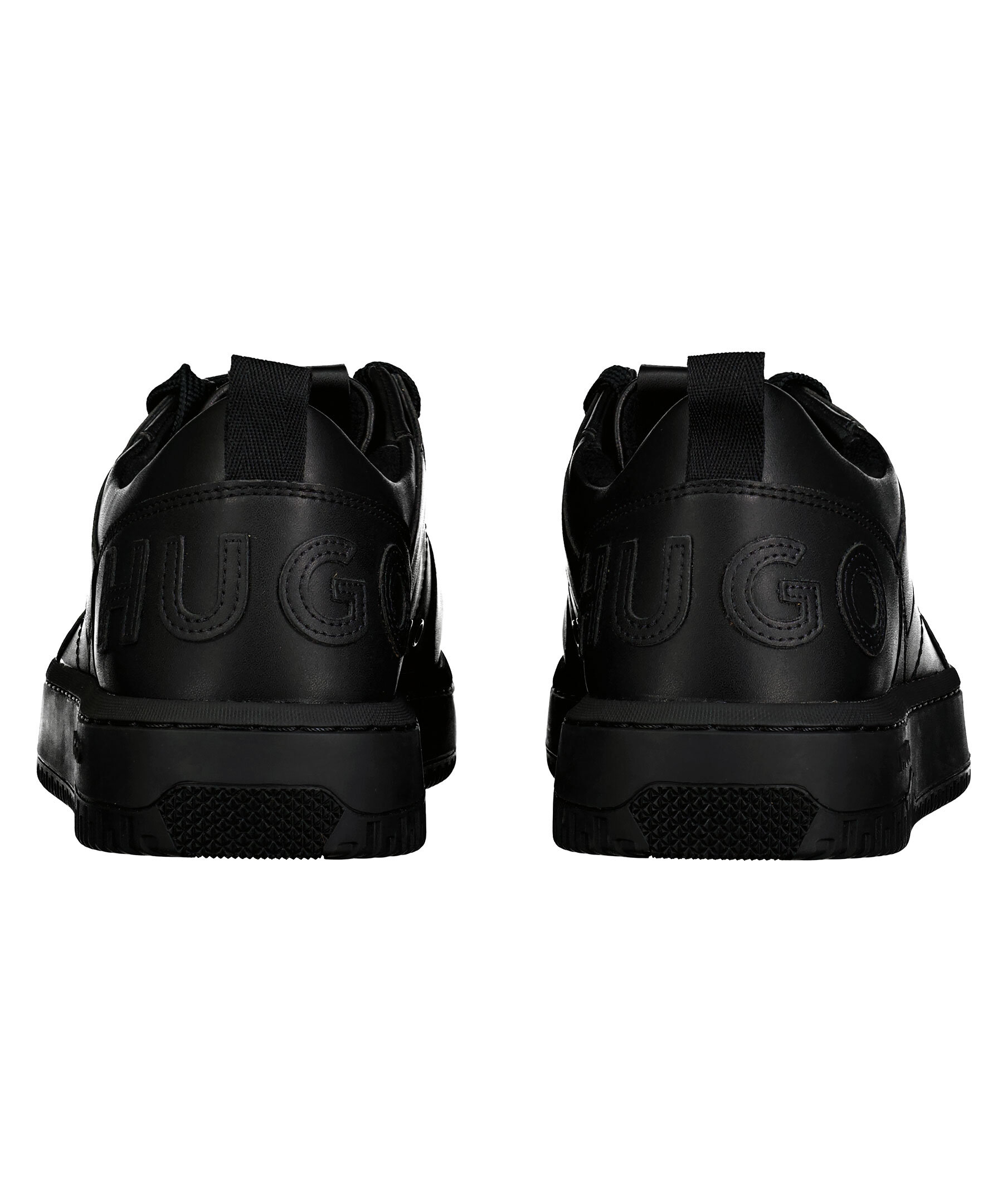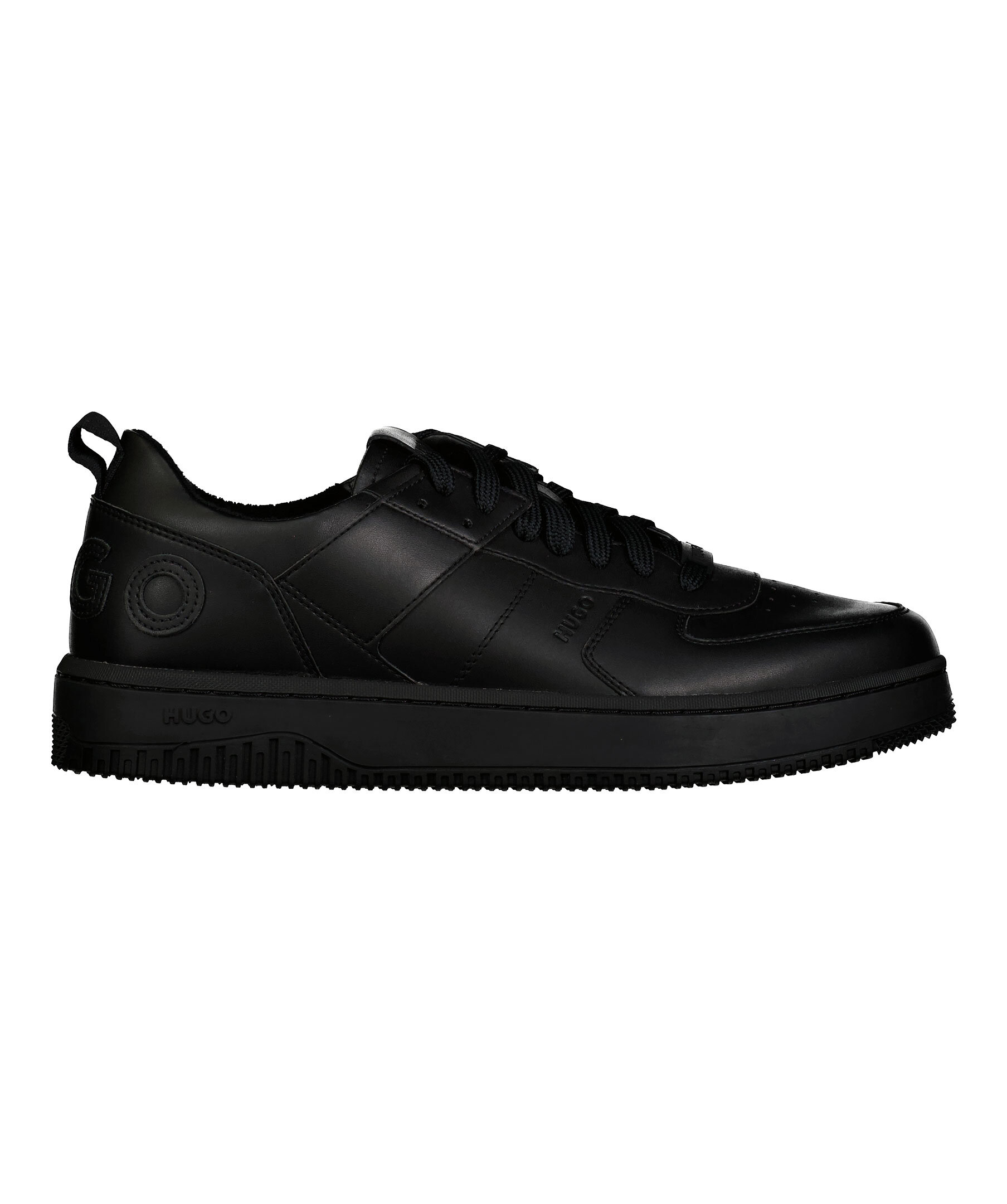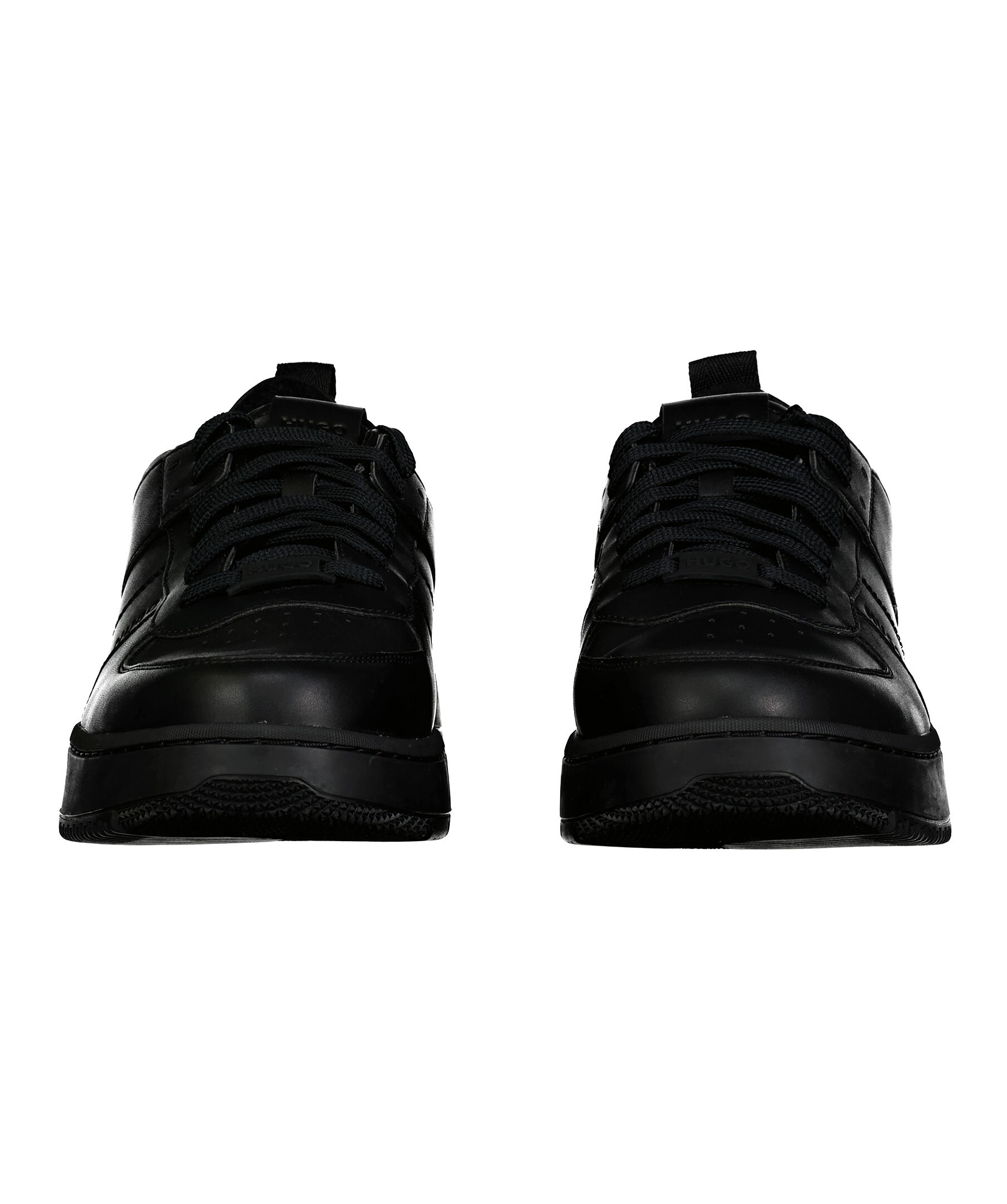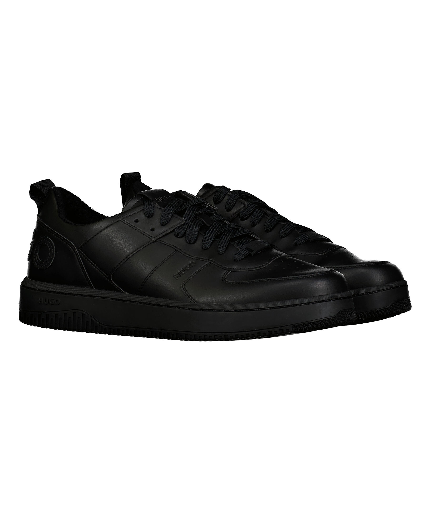 Svarta sneakers i läder från HUGO i en matt finish. Stor logotyp över hälen. stansad logotyp på skons yttersida och plösen. Grov sula i gummi. Platta skosnören med liten patch med logotyp.