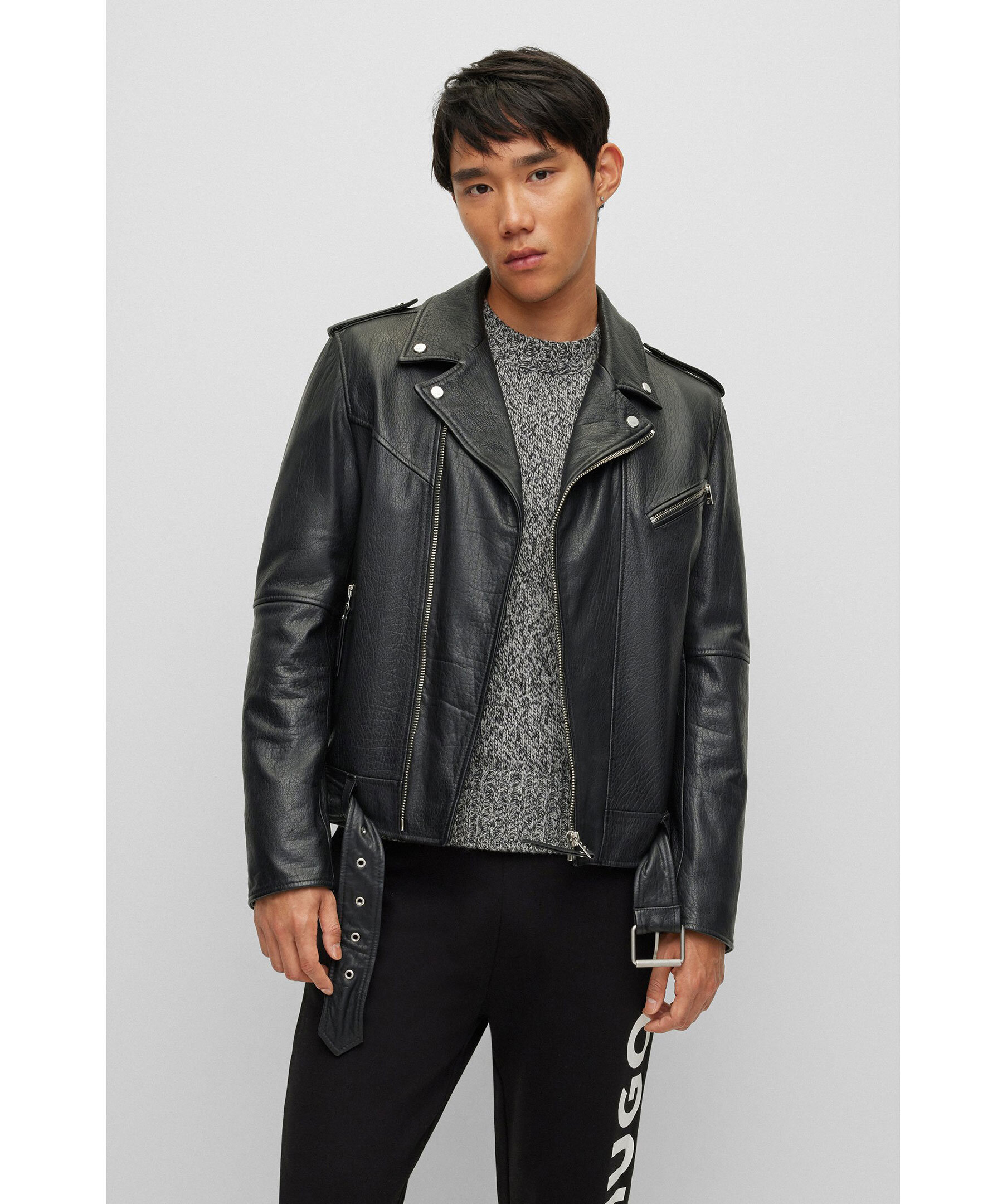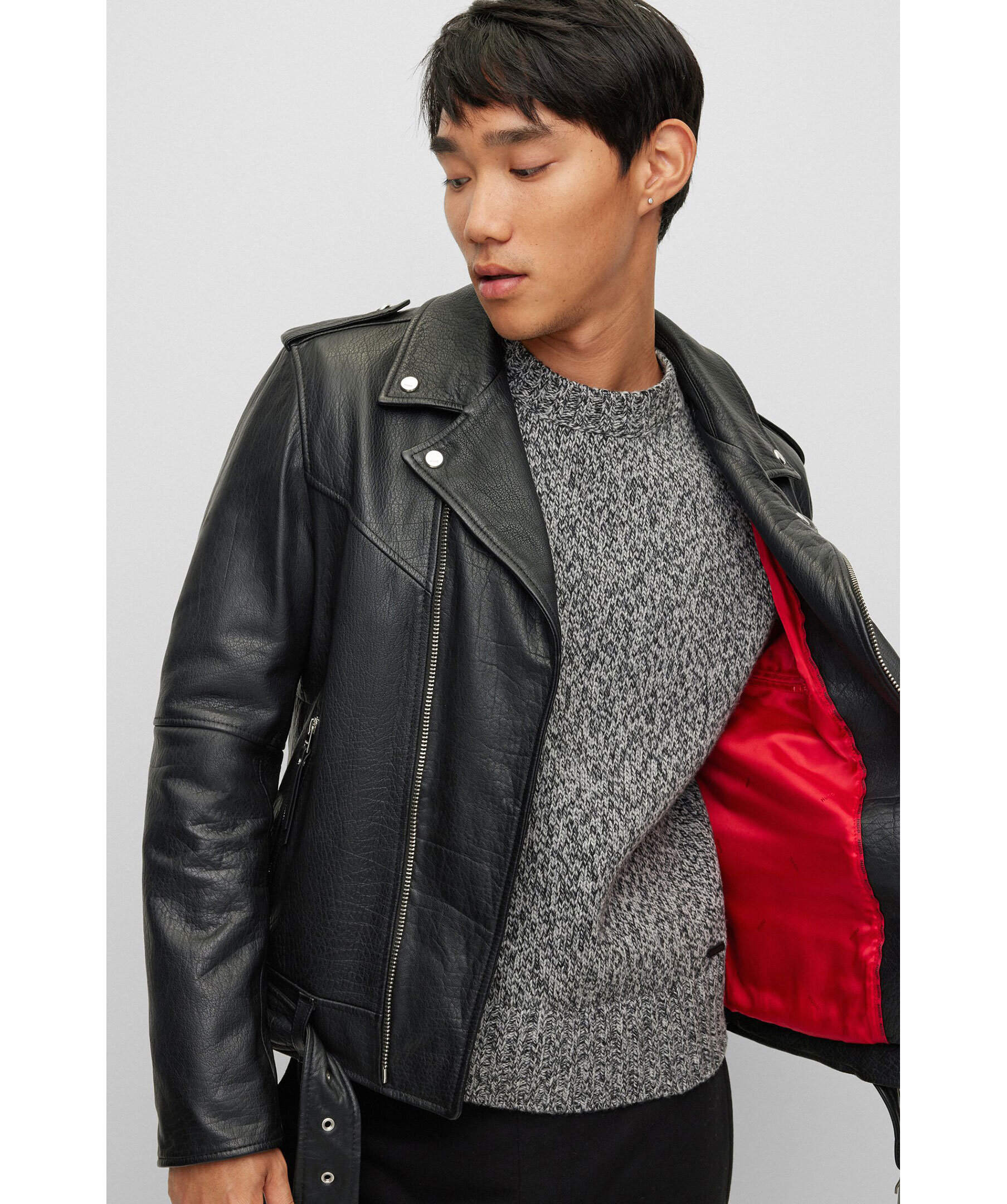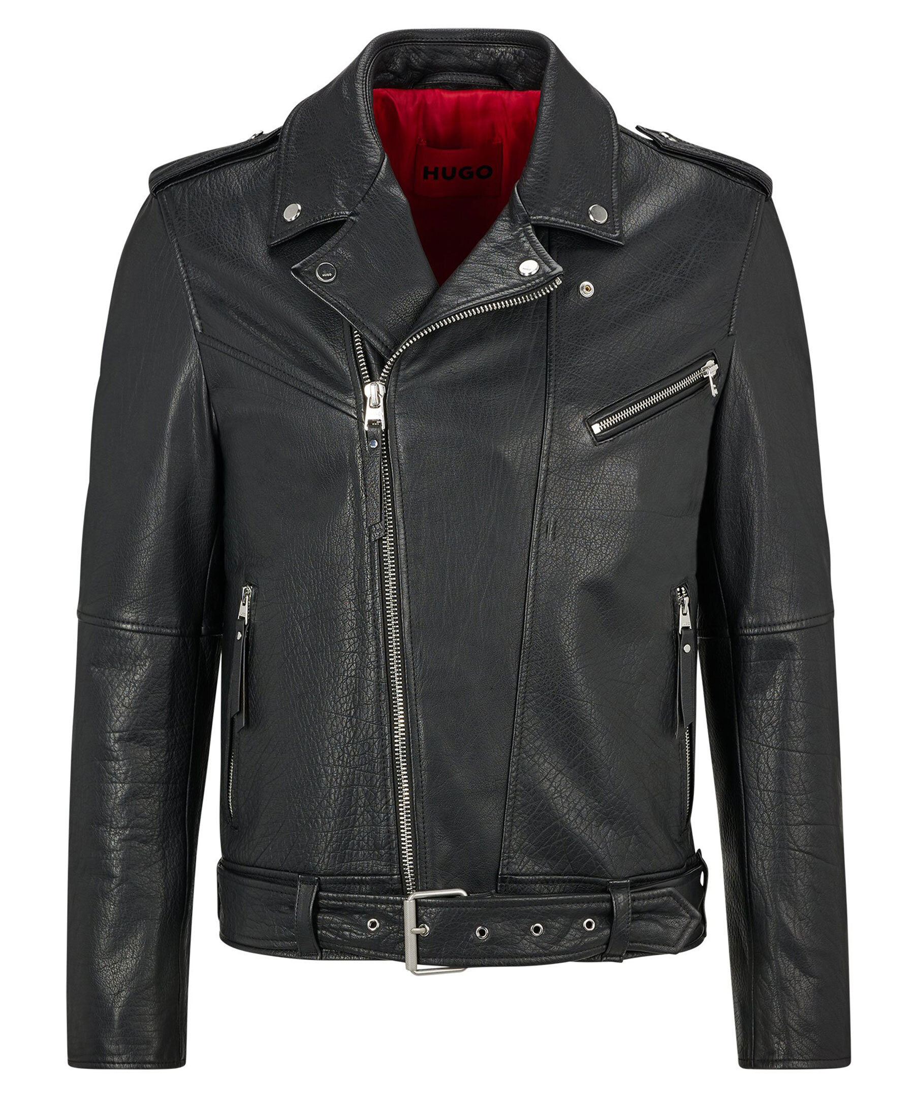 Svart bikerjacka i läder från HUGO herrkläder. Denna moderna jacka är sydd i rak passform och är fodrad med mjukt tyg i karakteristiskt rött. Spetsig krage, trubbiga kavajslag, stängs med silverfärgad dragkedja fram, har tre fickor med blixtlås och en innerficka med blixtlås. Silverfärgade tryckknappar på kragen och hällor och bälte i plaggslut.