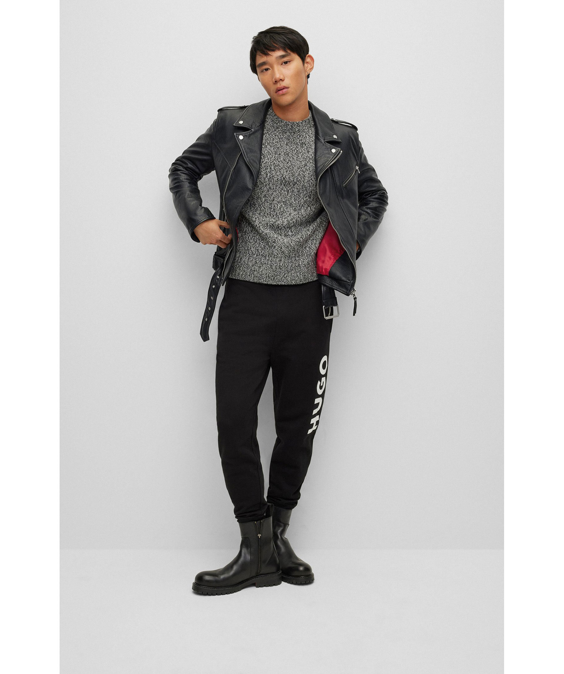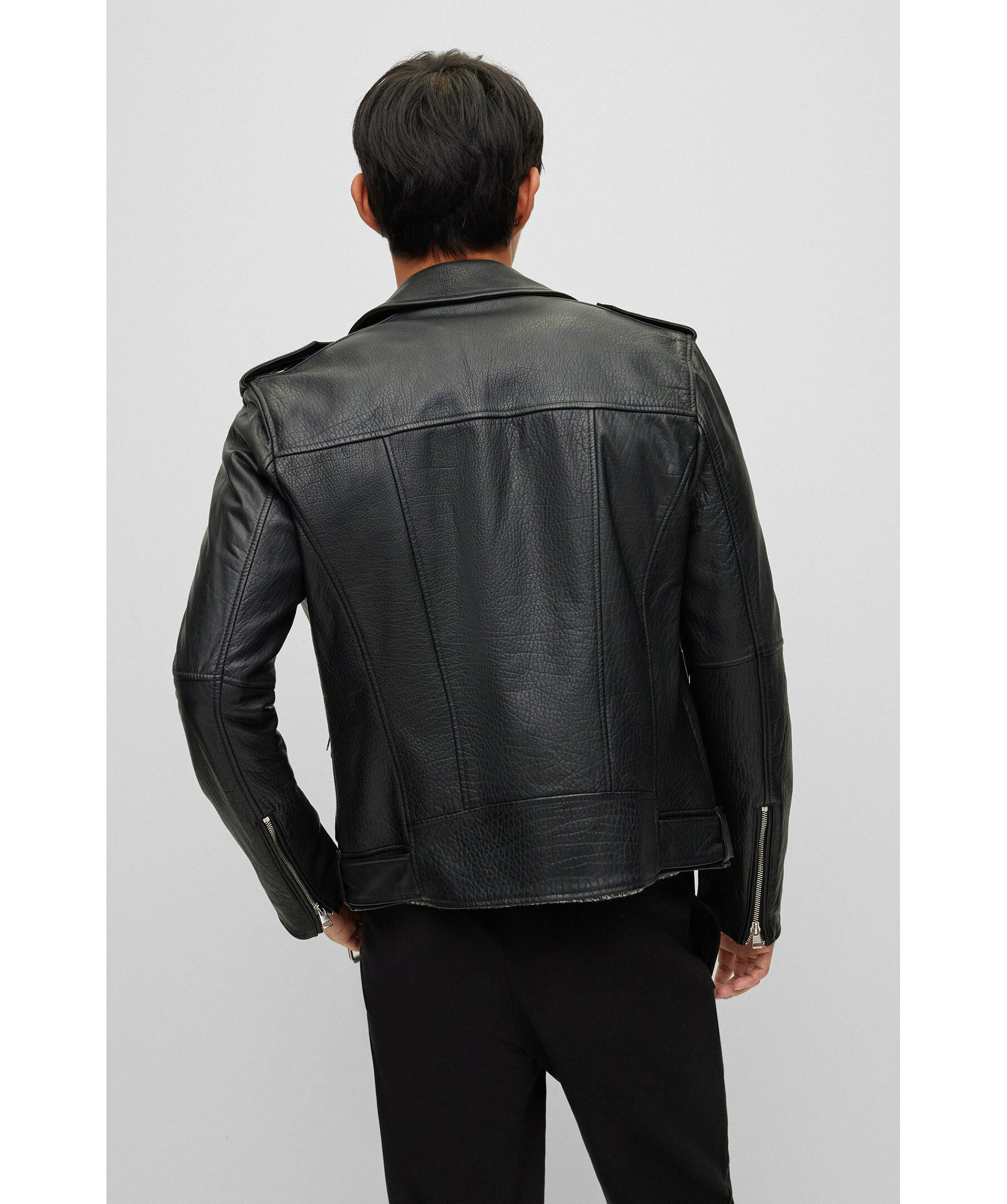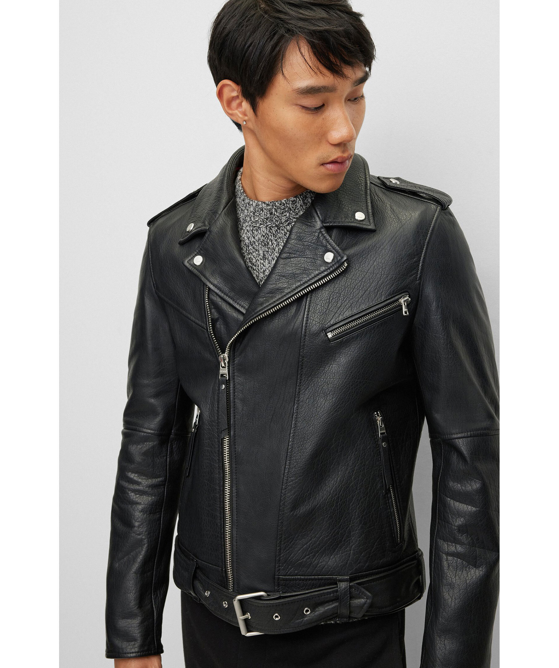 Svart bikerjacka i läder från HUGO herrkläder. Denna moderna jacka är sydd i rak passform och är fodrad med mjukt tyg i karakteristiskt rött. Spetsig krage, trubbiga kavajslag, stängs med silverfärgad dragkedja fram, har tre fickor med blixtlås och en innerficka med blixtlås. Silverfärgade tryckknappar på kragen och hällor och bälte i plaggslut.