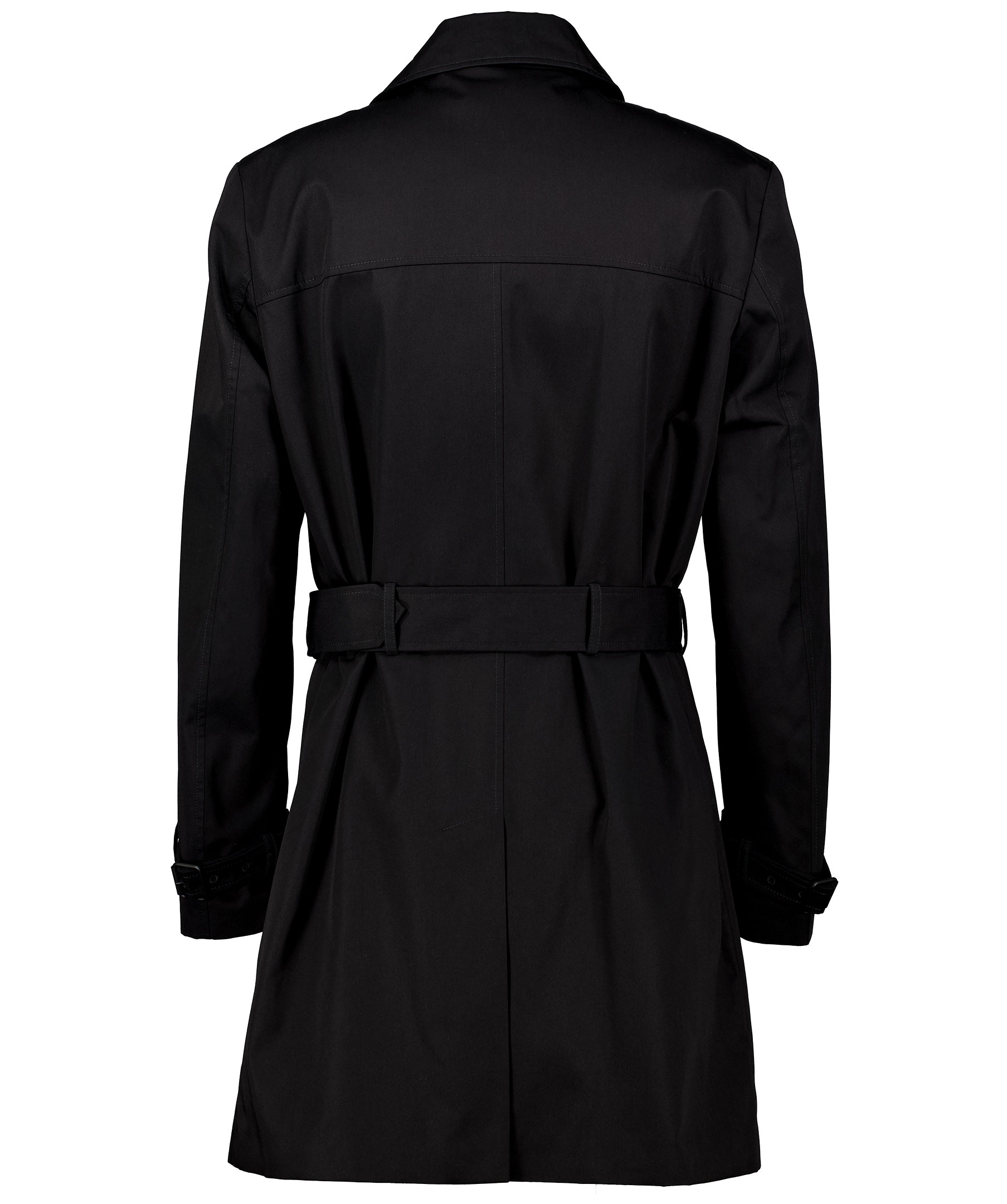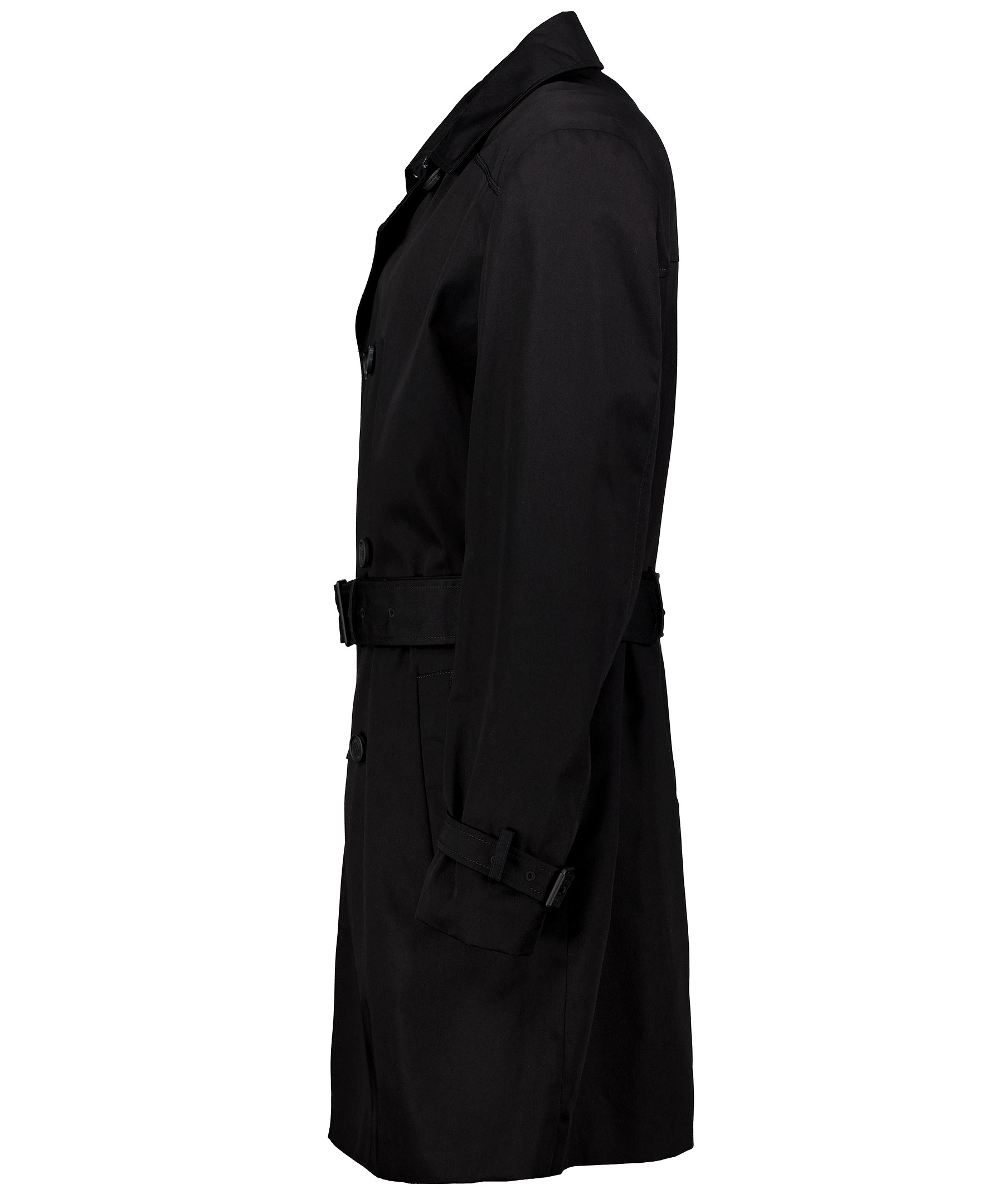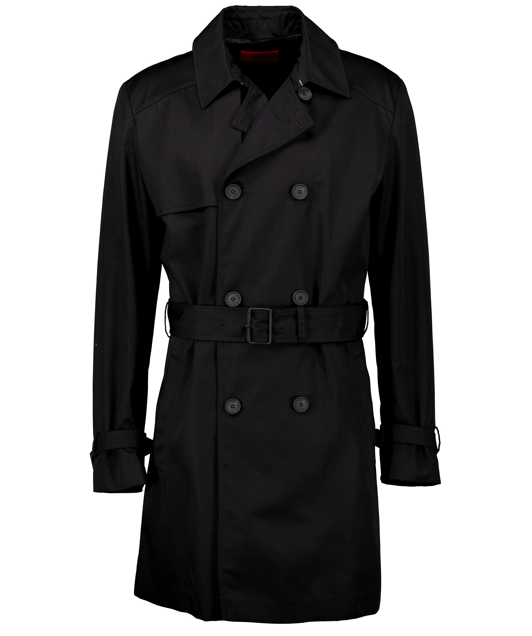 Svart trenchcoat i slim fit modell från Hugo. Rocken har ett vattenavvisande yttertyg och stängs med dubbelknäppning samt avtagbart bälte i midjan. Två fodrade framfickor och två innerfickor. Reglerbart spänne vid ärmslut. Slits baktill.