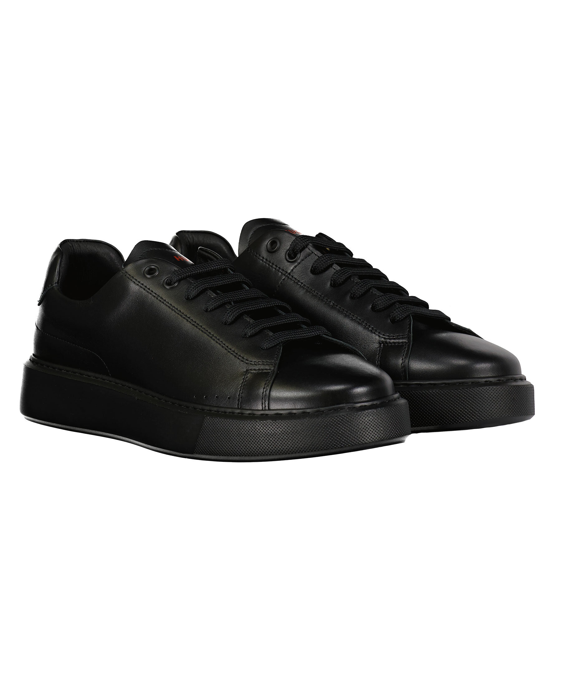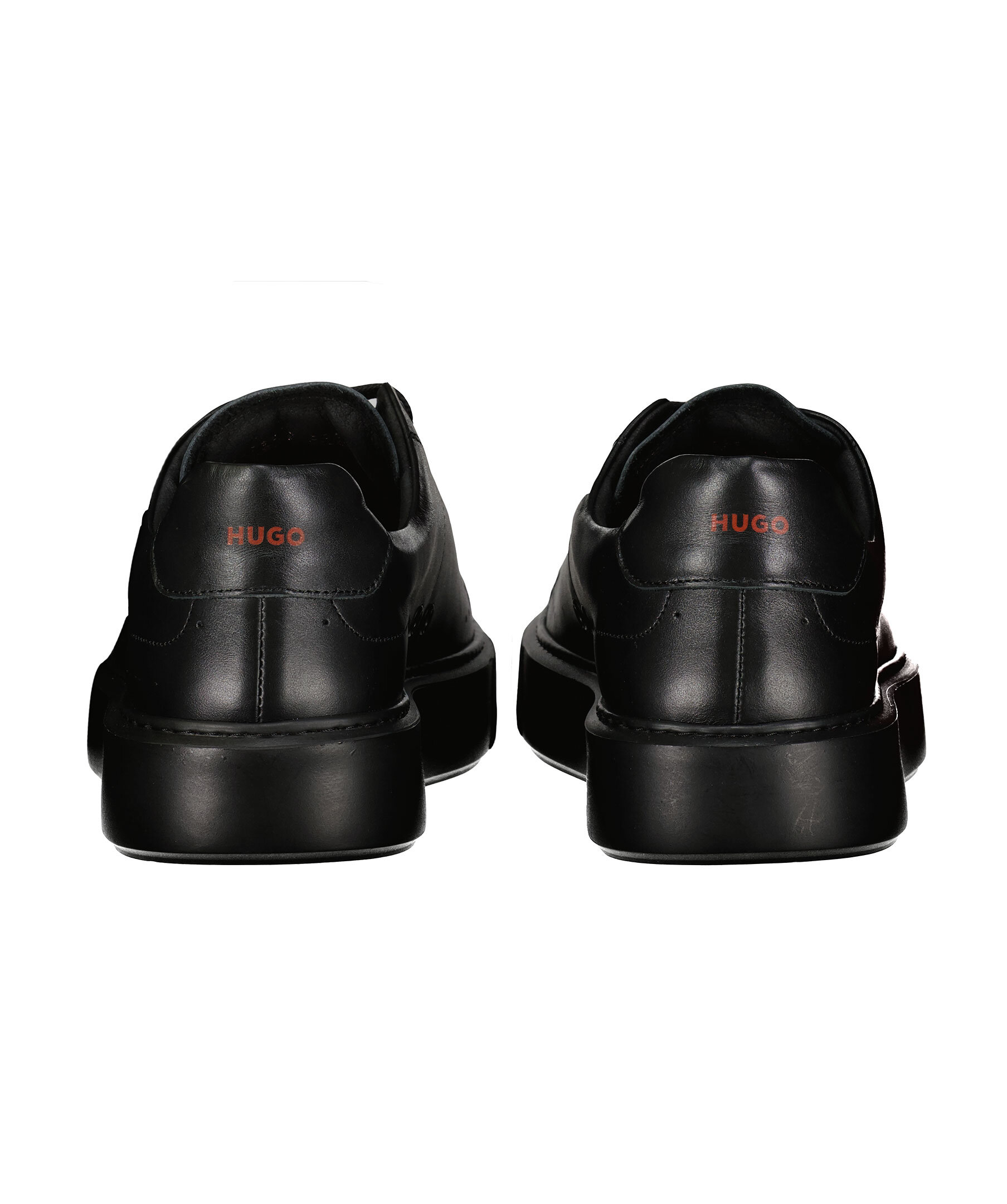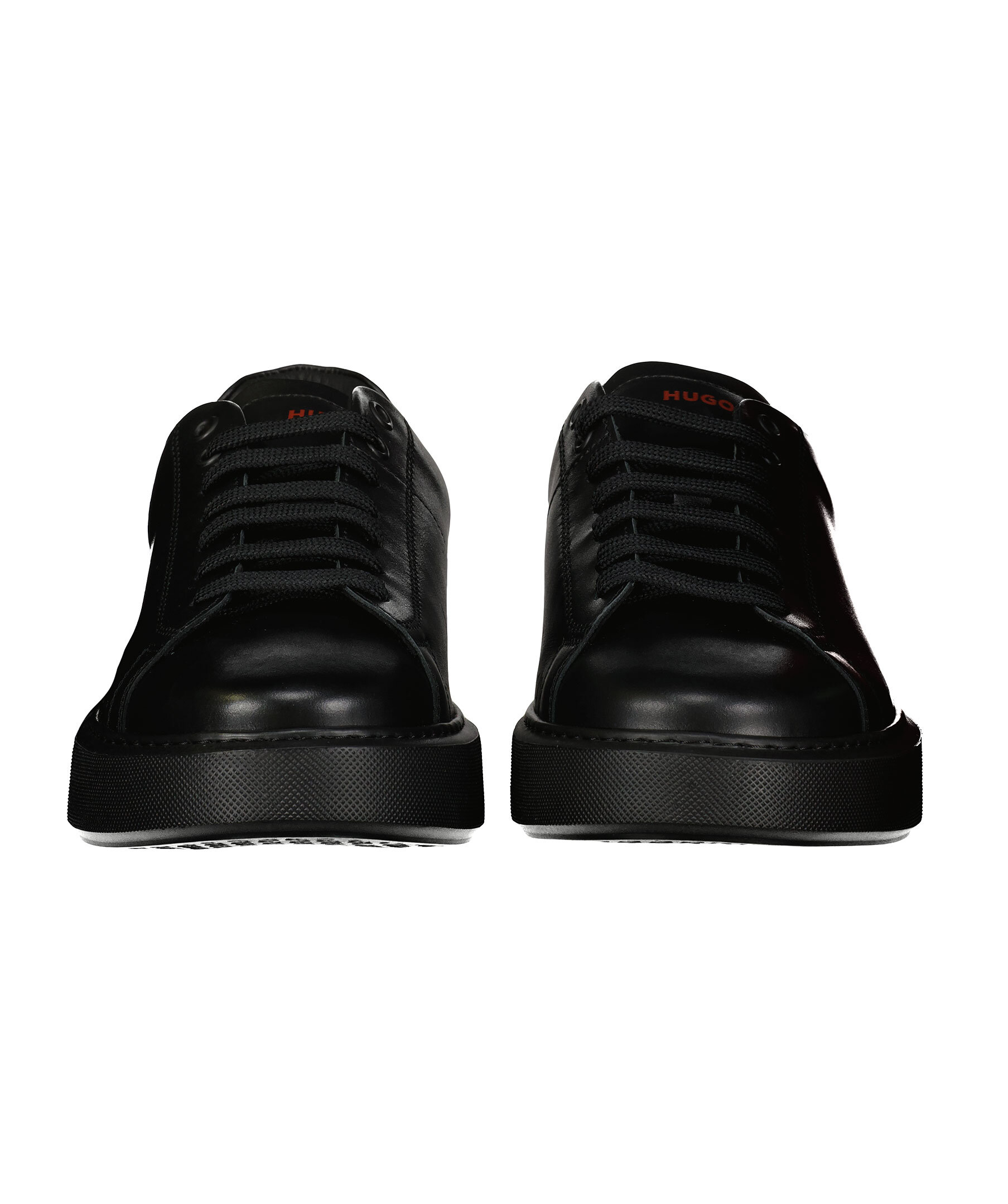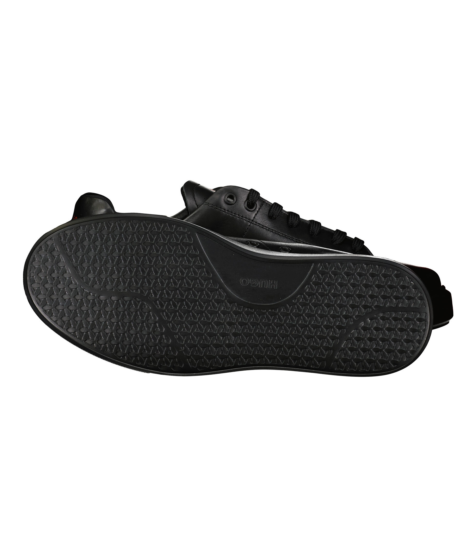 Svarta lädersneakers från HUGO Men i en halvmatt finish. Röd logotyp på plösen och hälen. Svart snörning och svart gummisula med liten platå.