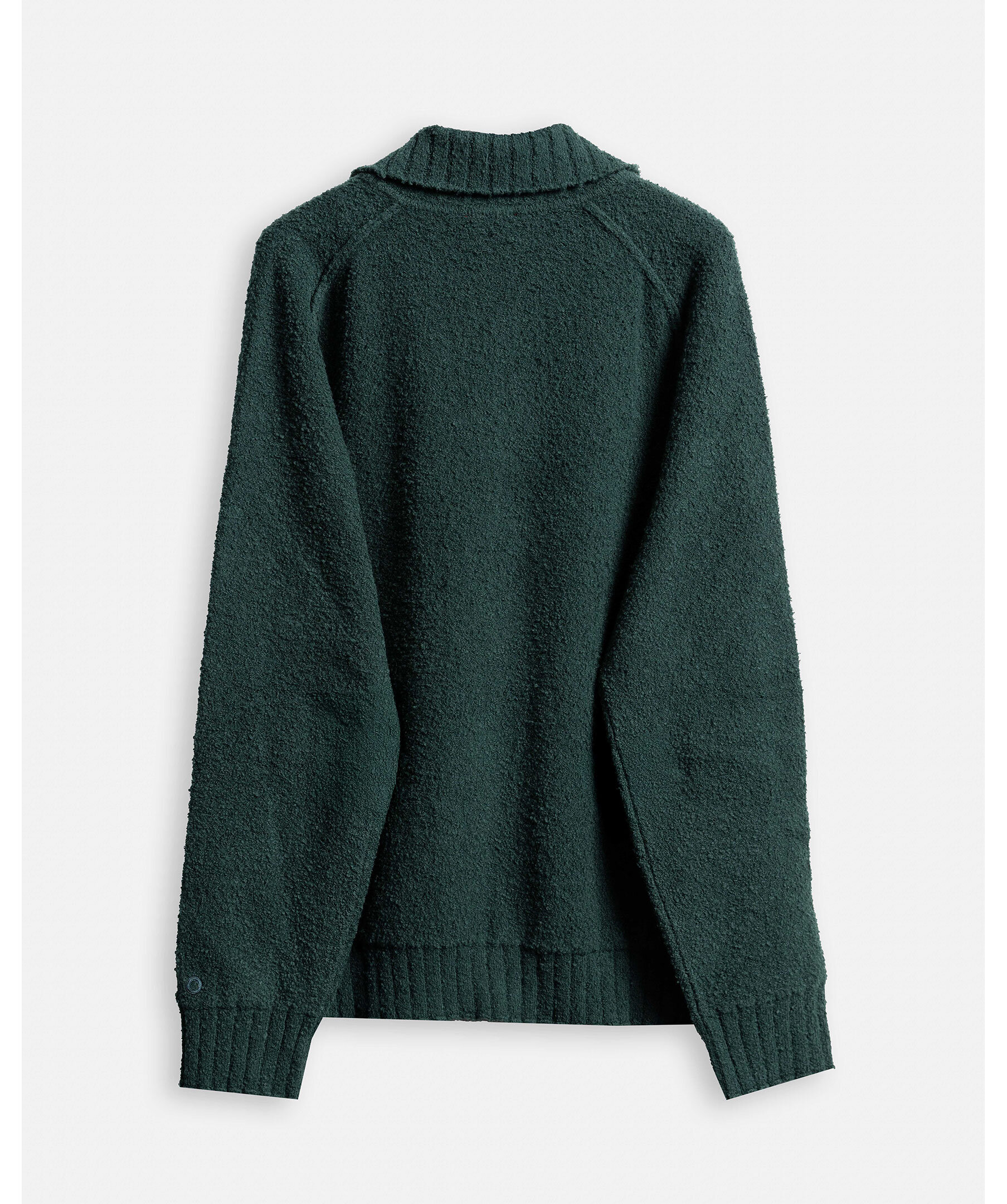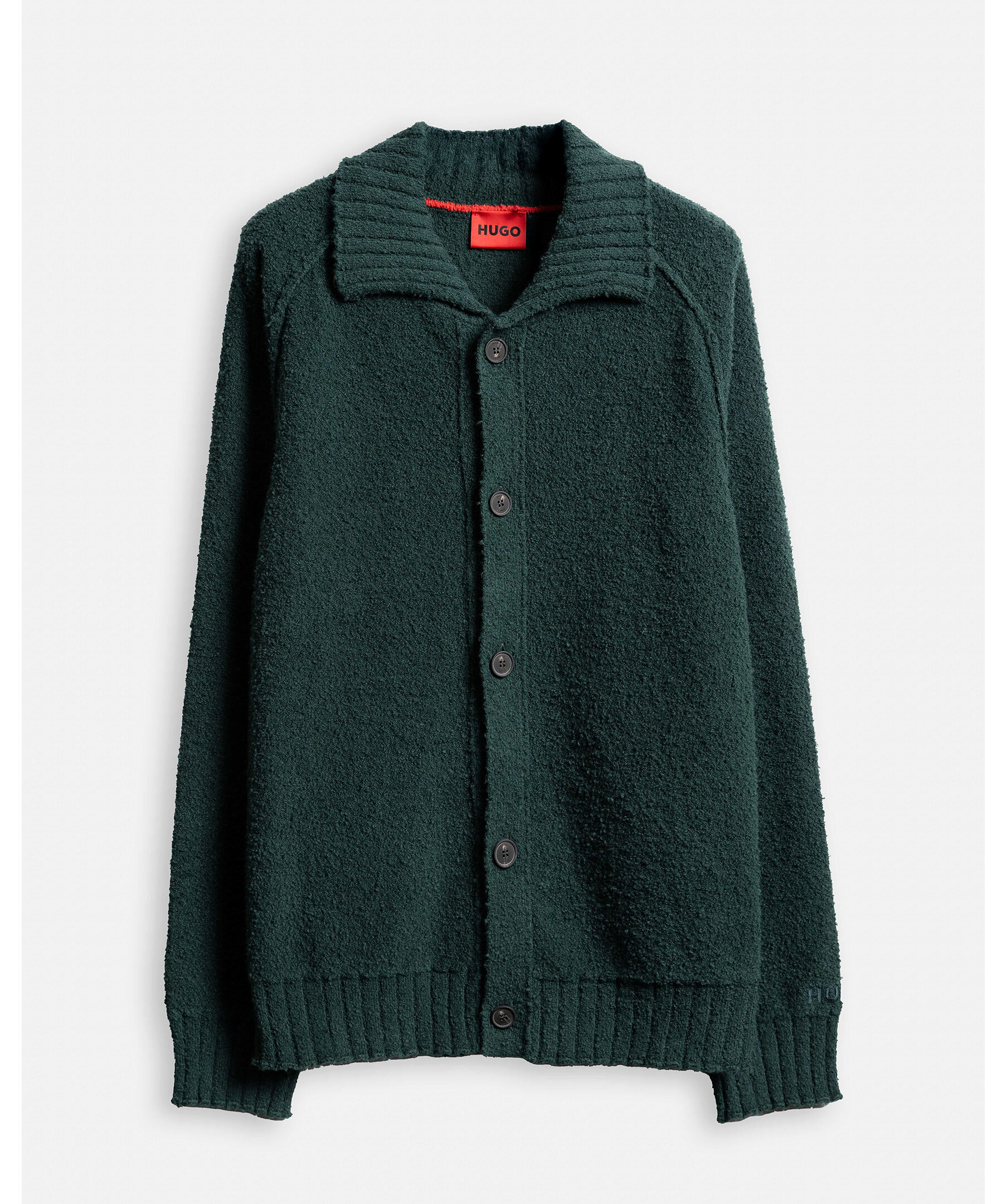 Grön, stickad kofta från HUGO i en mjuk borstad textur. Koftan har ribbade krage, ärmslut och nedre kant samt en diskret broderad logotyp ton-i-ton på vänster ärmslut.