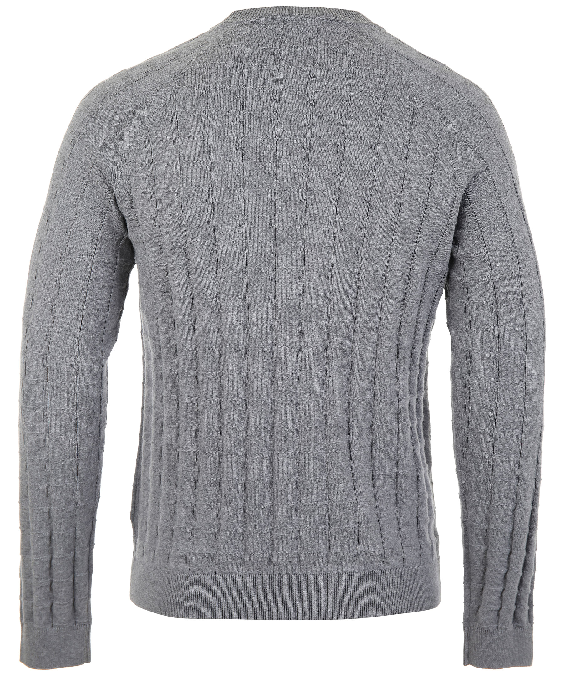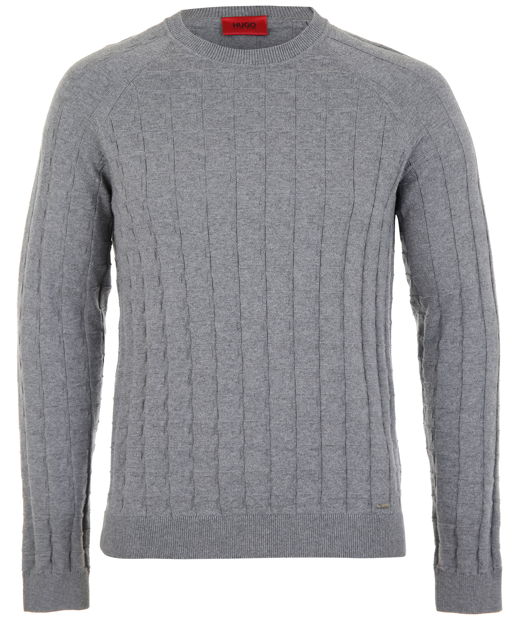Grå, finstickad tröja med rutig struktur från Hugo Boss. Tröjan har rundad hals och liten metallbricka med logotyp nere på vänster sida. Ribbade detaljer på ringningen, på ärmslut och plaggslut.