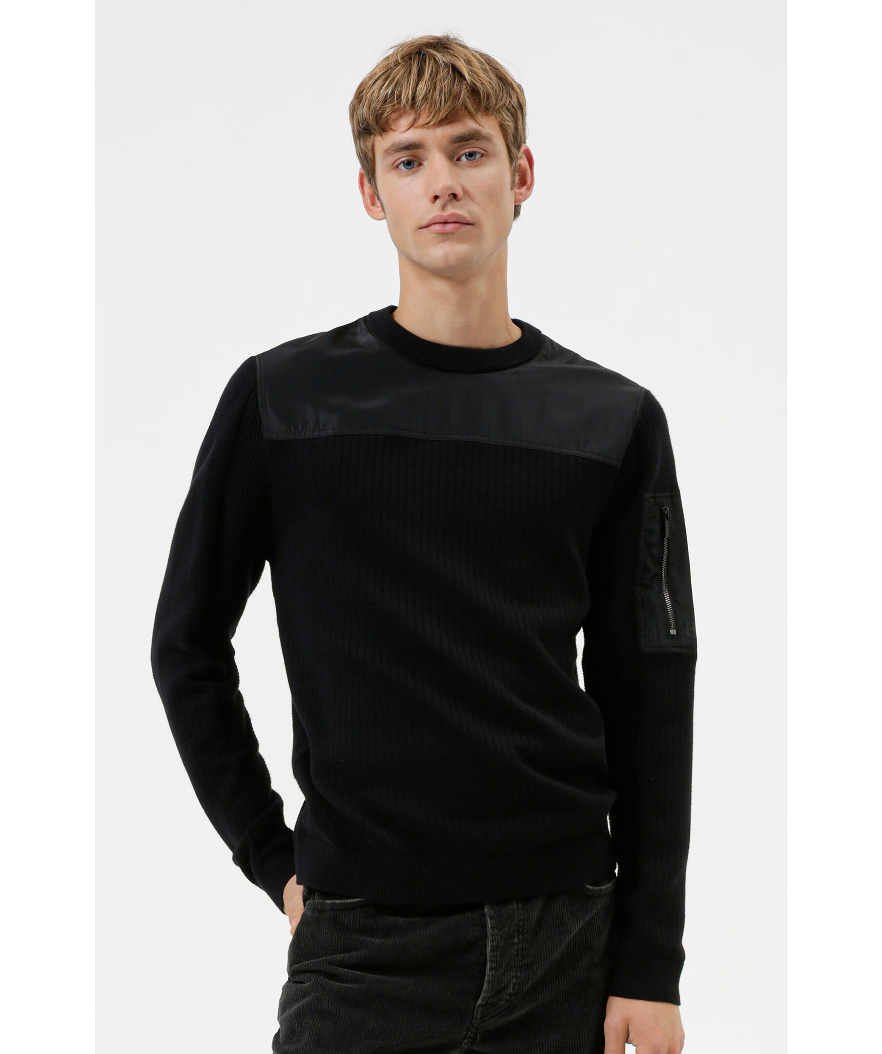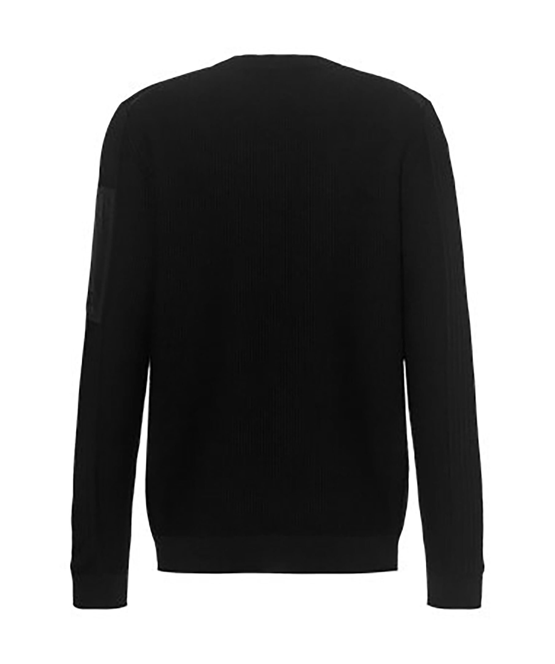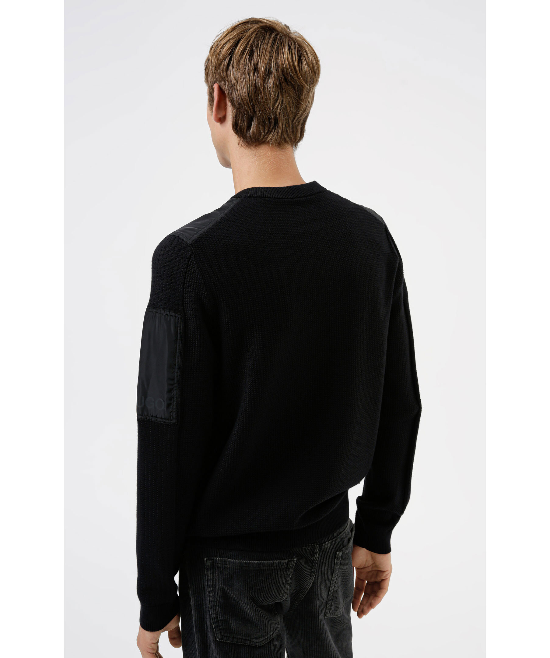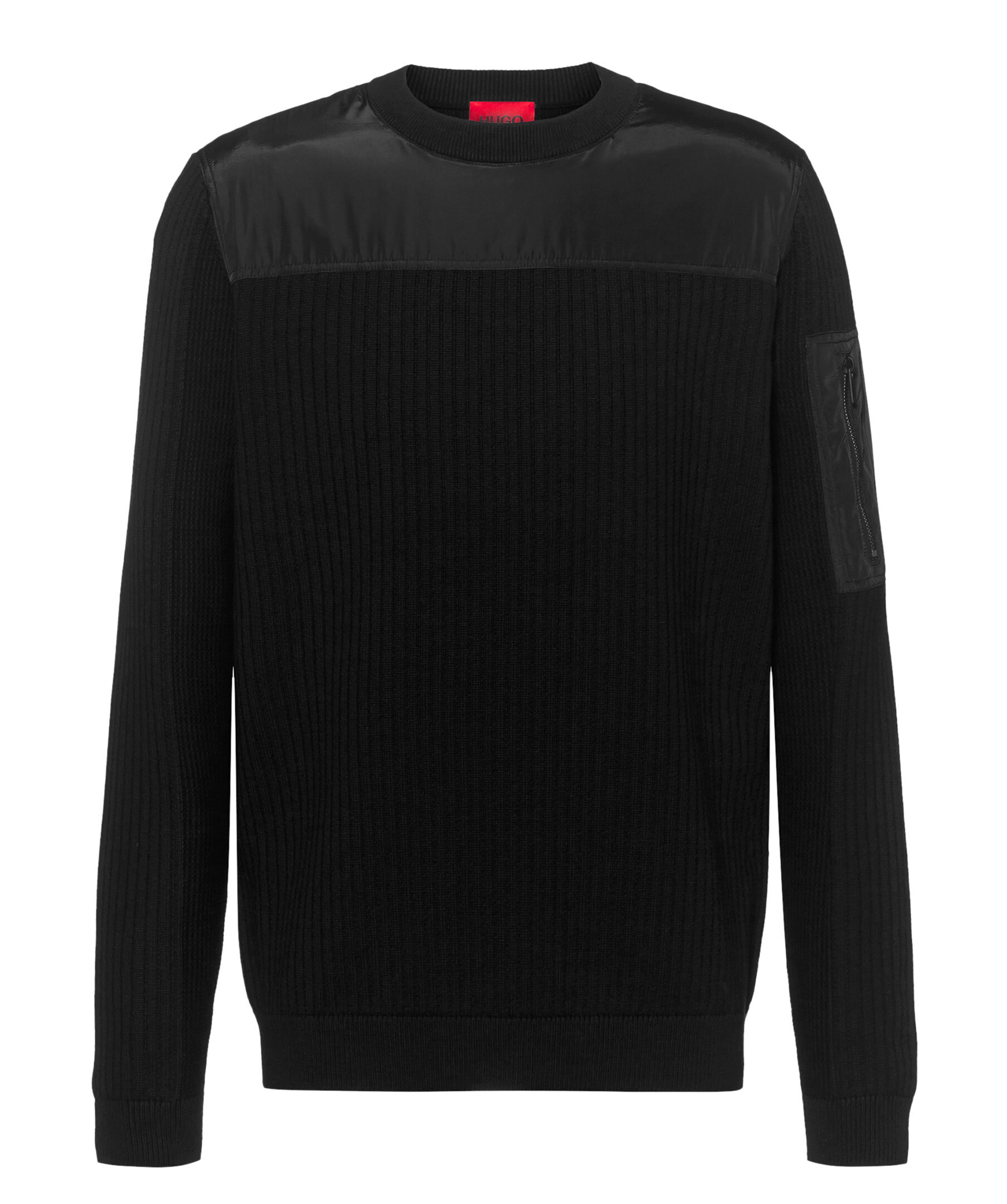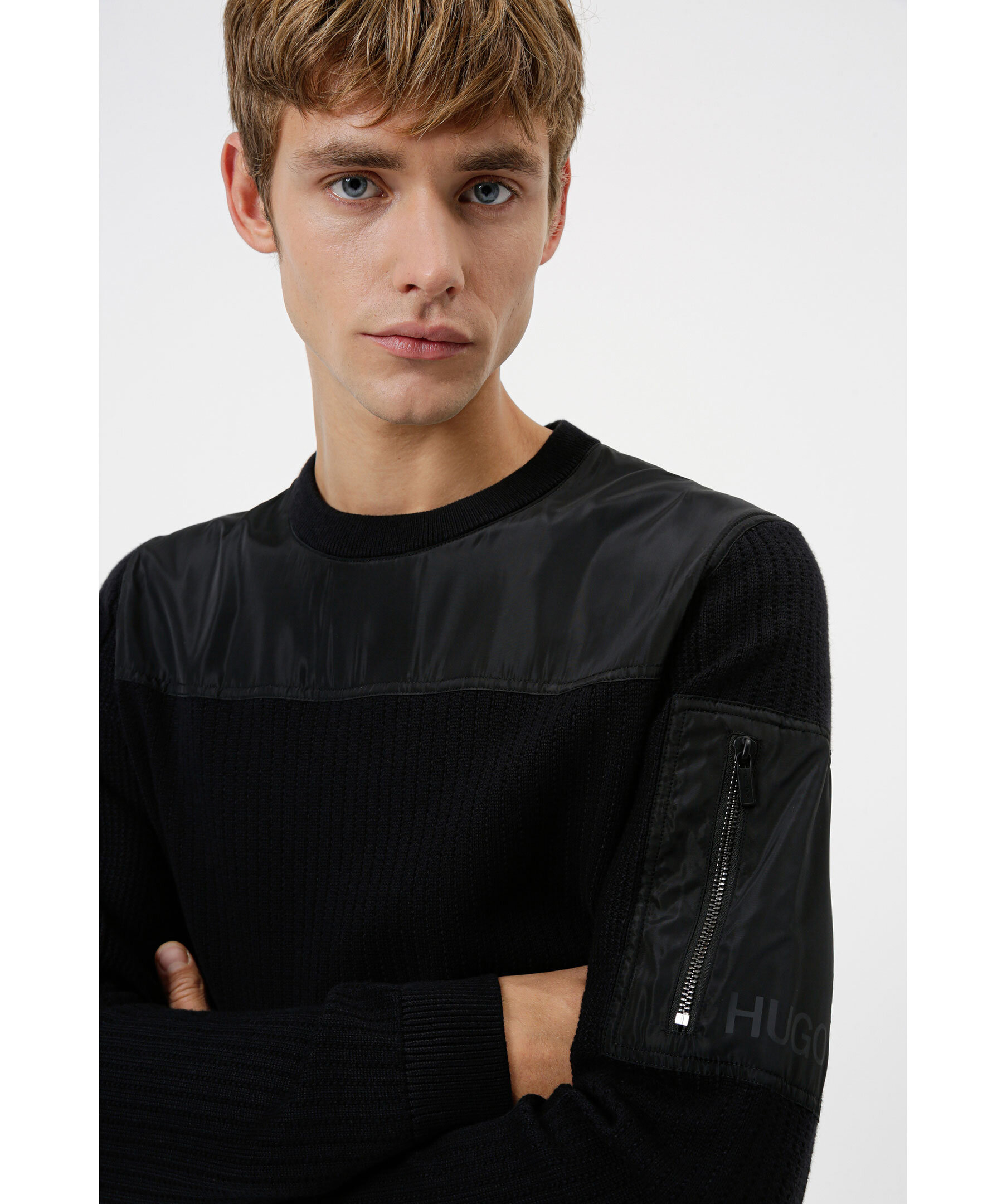 Svart stickad tröja med detaljer i vävt polyester material från Hugo. Tröjan är tillverkad i en ull och Bomulls blandning. Ficka och logotyp och dragkedja på vänster ärm. Ribbstickade muddar i plagg- och ärmslut.