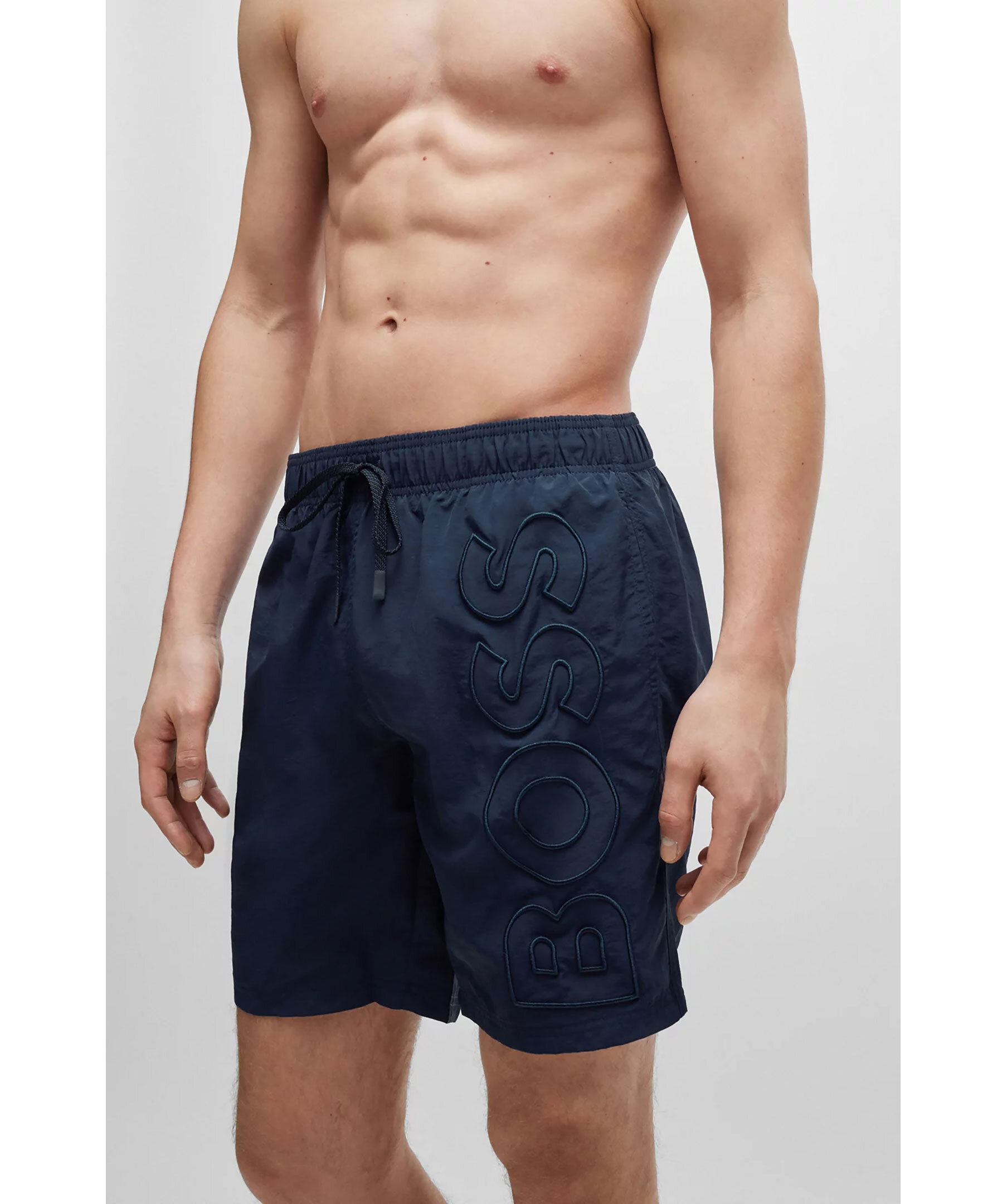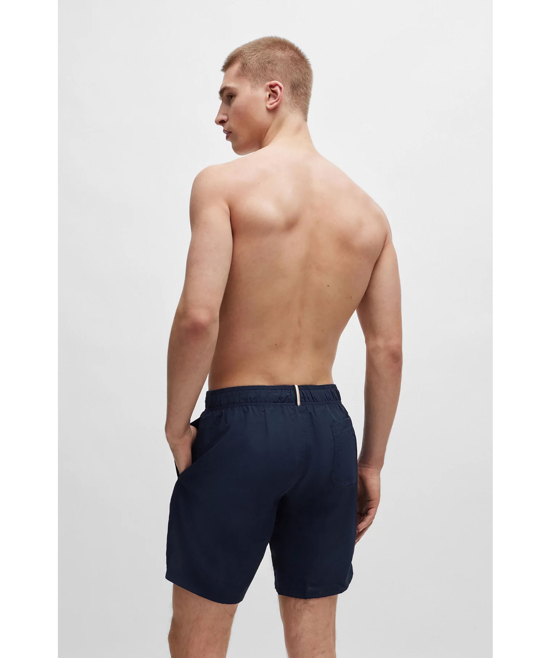 Marinblå, helfodrade badbyxor från HUGO. Badbyxorna har elastisk midja med dragsko, broderad 3D-logga på vänstra benet och två sidfickor samt en bakficka. Tillverkade i polyamid.
