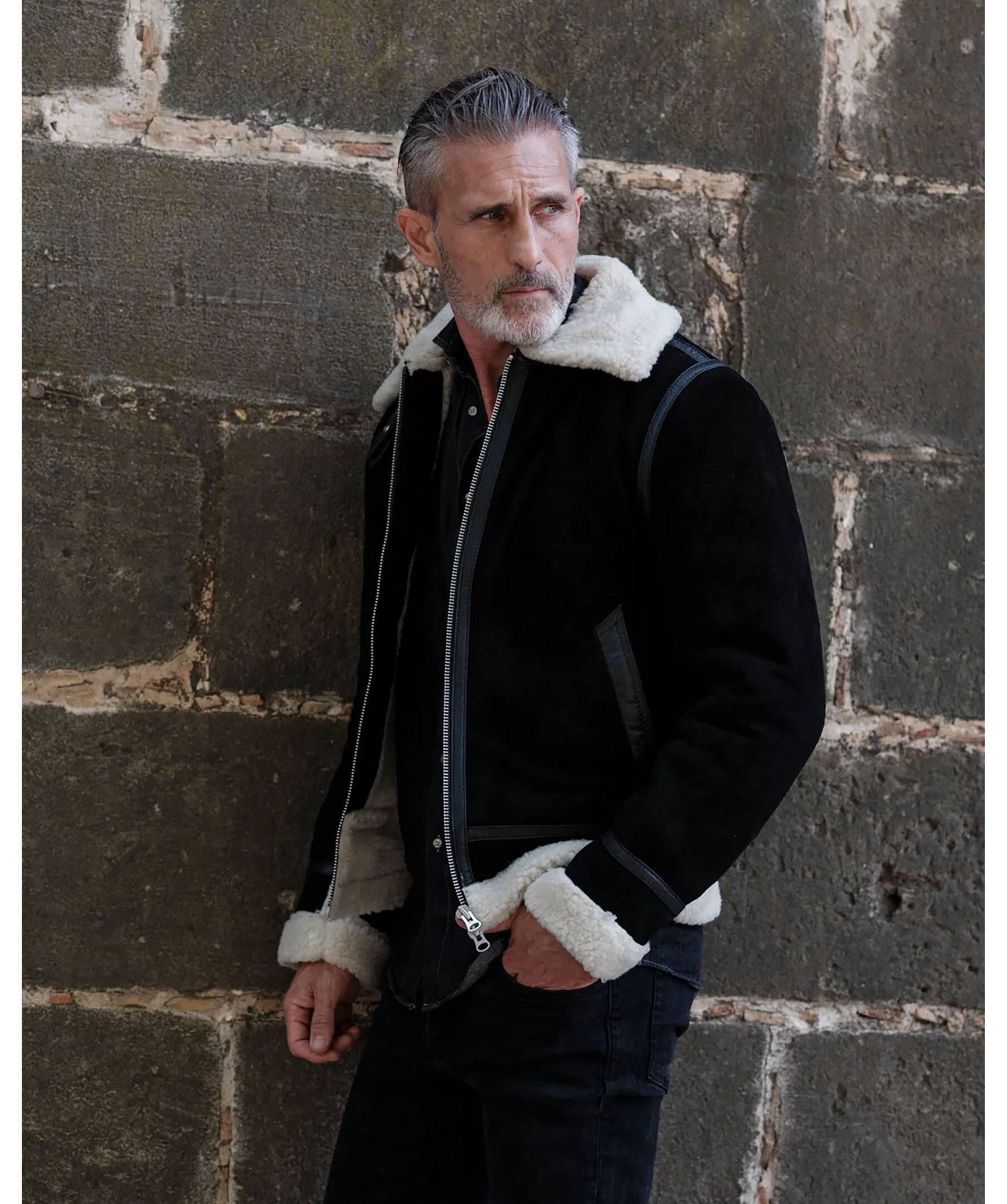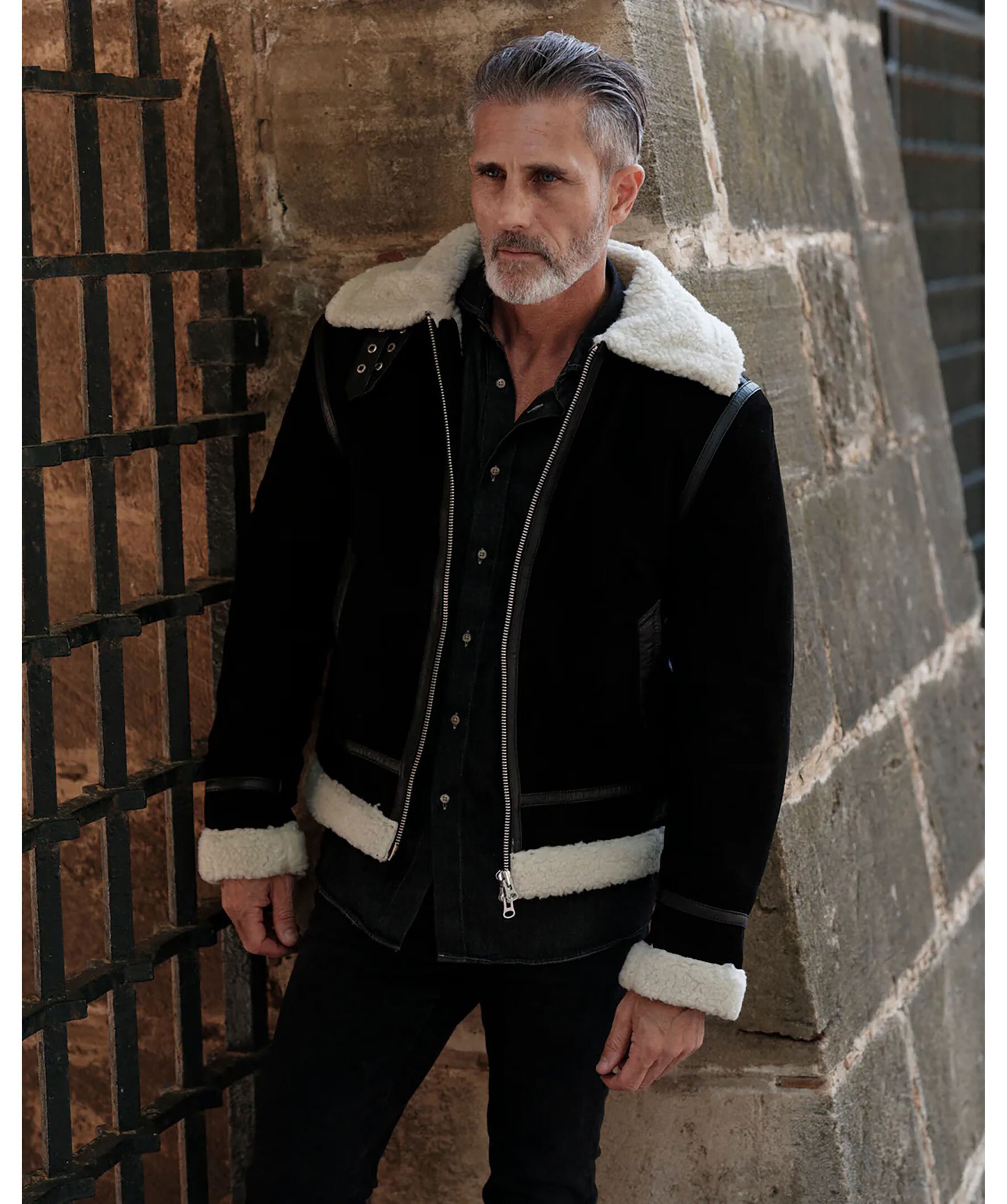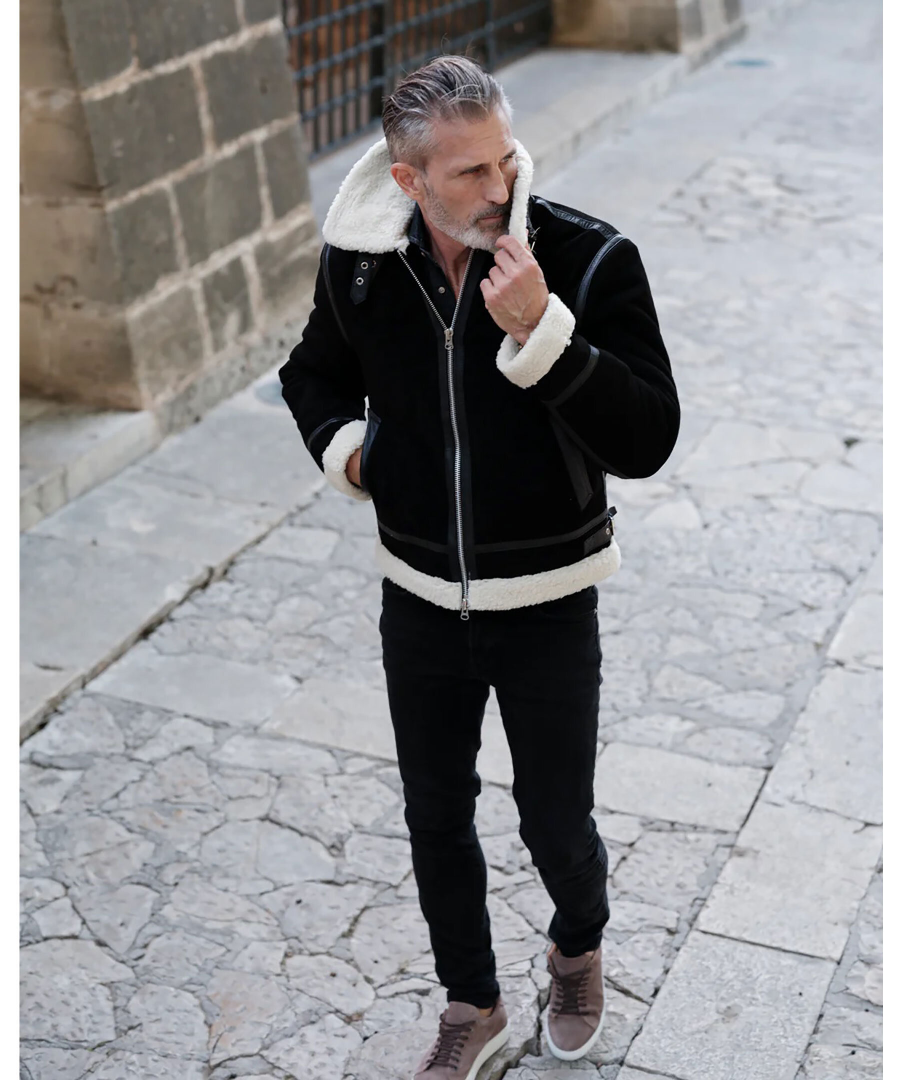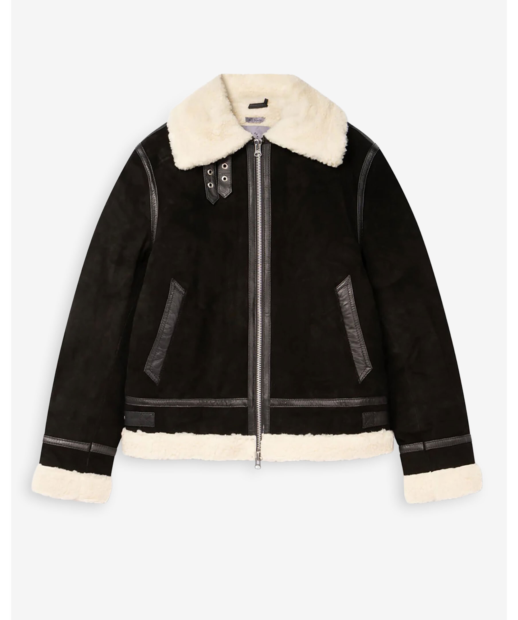 Svart mockajacka från Human Scales med stark karaktär och hög kvalitet. Jackan är tillverkad i äkta skinn, vilket ger en mjuk och exklusiv ytfinish. Som kontrast är fodret gjort i veganfårpäls – en oväntad och medveten twist för komfort och hållbarhet. Den är försedd med tvåvägs YKK‑dragkedja framtill och klassisk bomber‑silhuett.