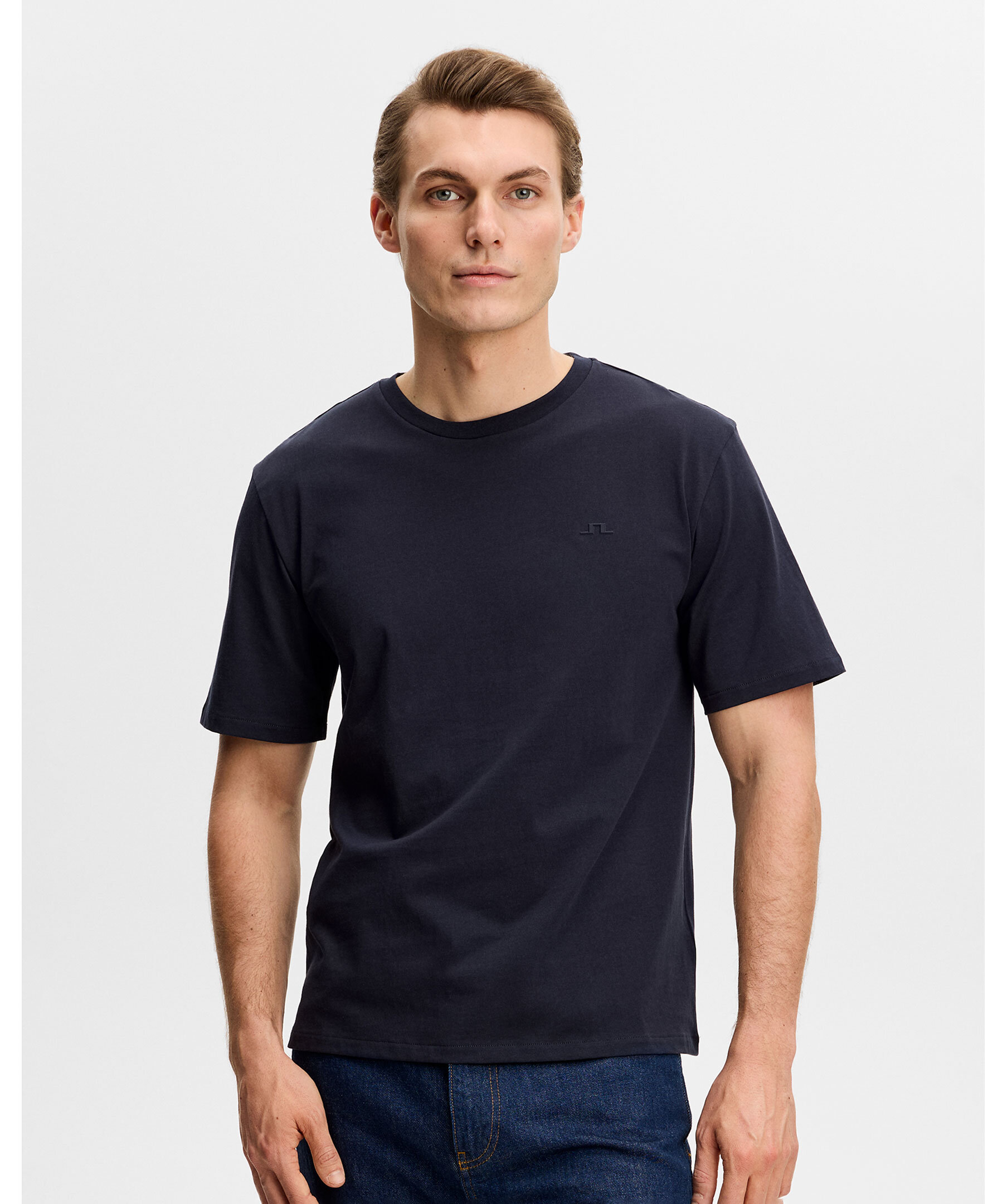 Blå t-shirt från J.Lindeberg. T-shirten har rundhals och diskret logotyp på bröstet.
