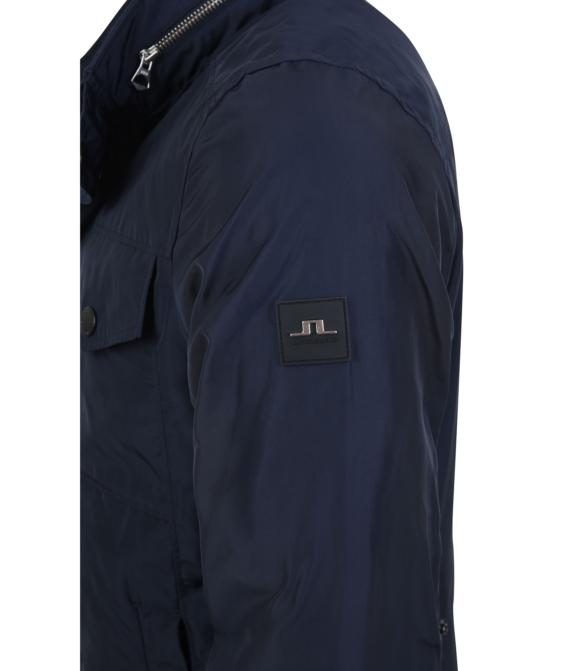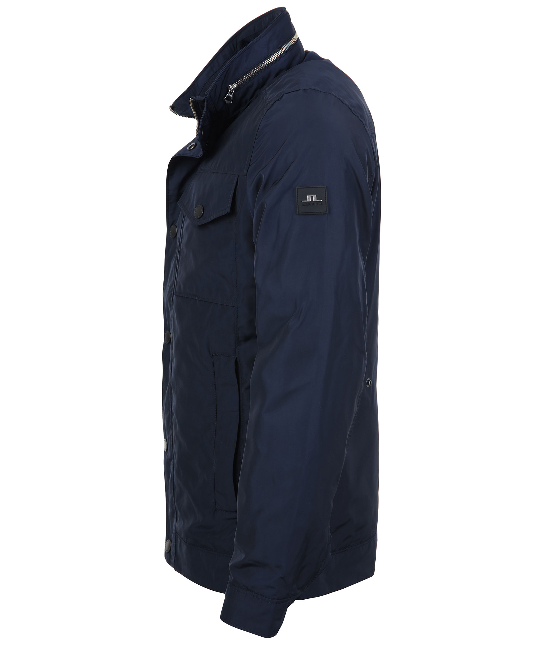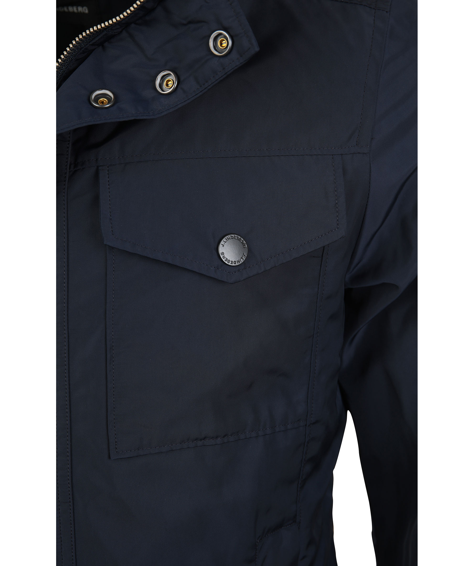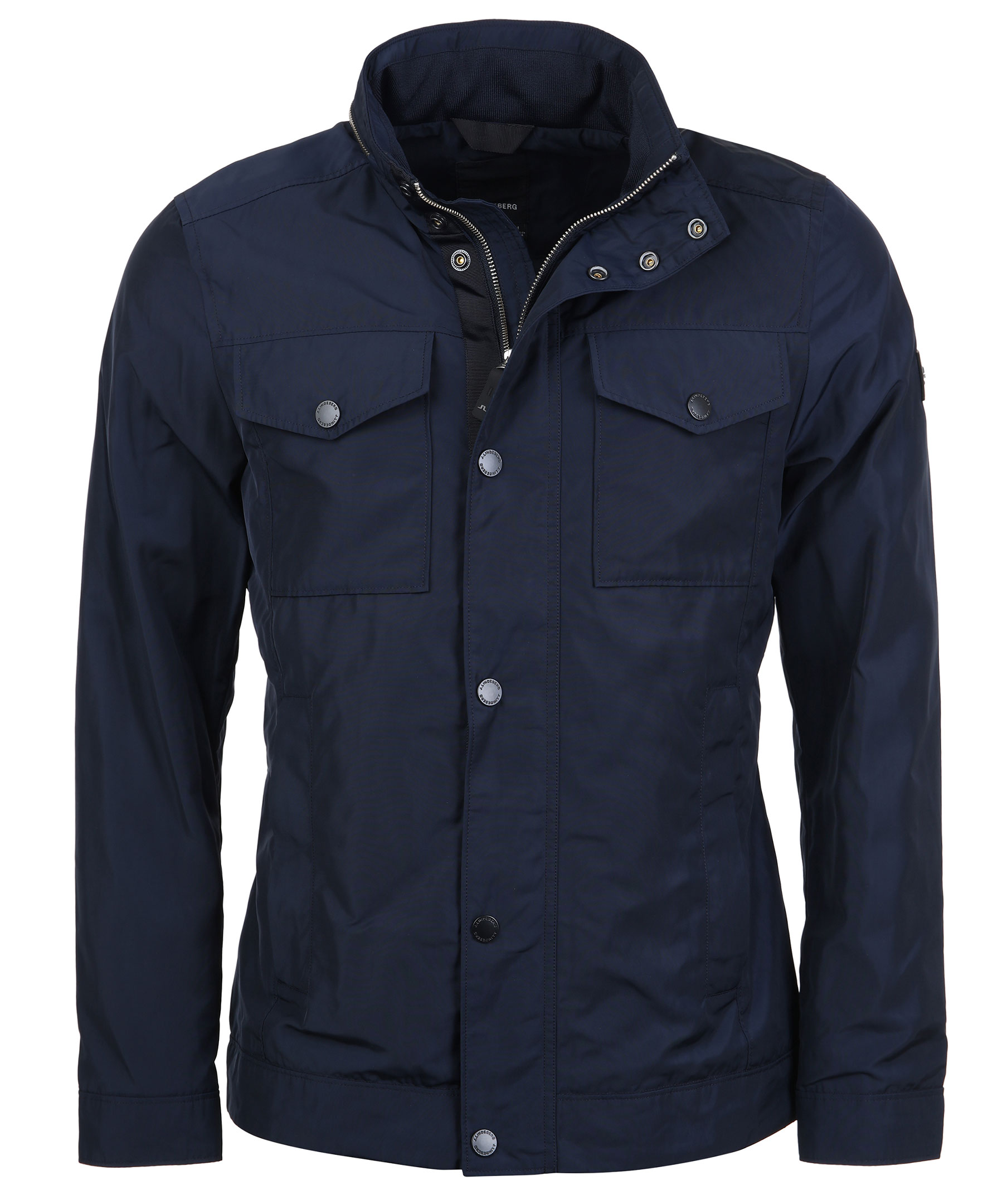 Svart klassisk vårjacka från J-Lindeberg. Tillverkad i vattenavvisande kvalitet med fyra fickor framtill samt en dold luva i kragen. Bröstfickor med tryckknappar, fickor framtill med dragkedja och två innerfickor med dragkedja. Justerbar passform med tryckknappar mitt bak och dold luva på insidan av kragen. JL logo patch på vänster ärm samt J.Lindeberg-printat innertyg.