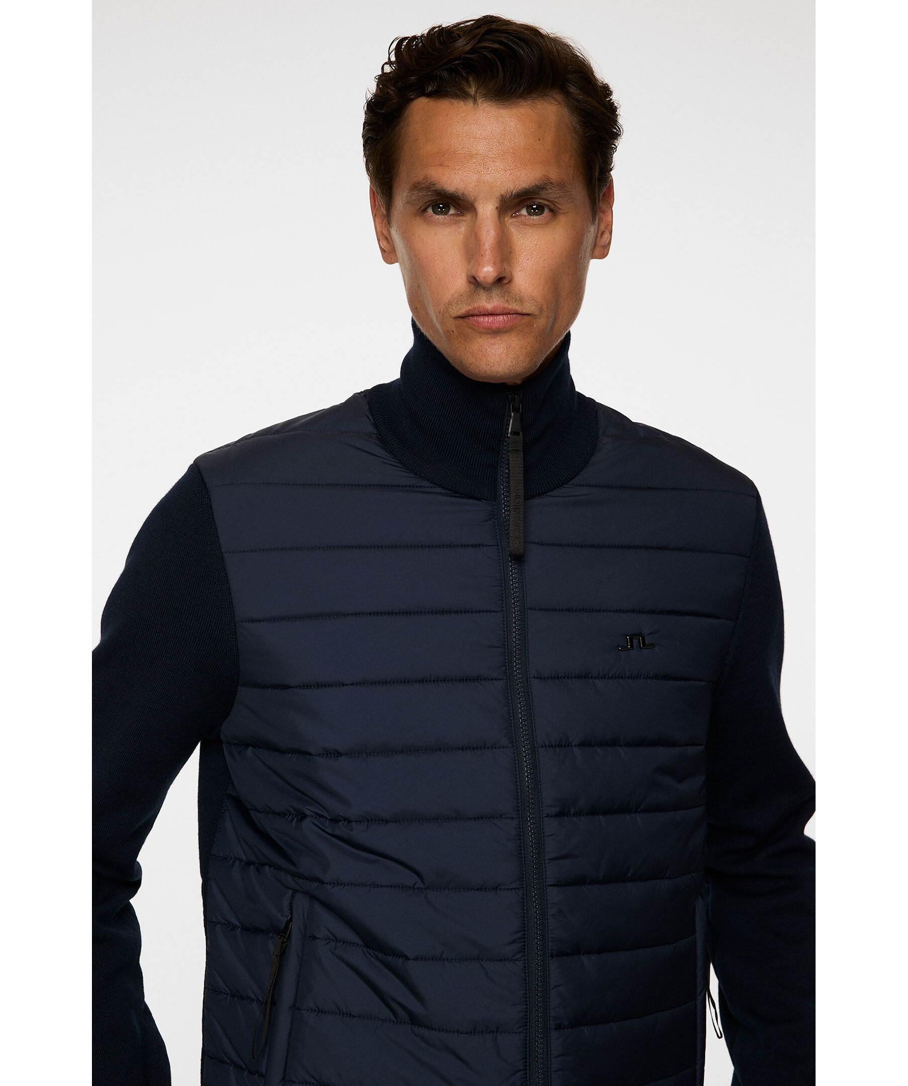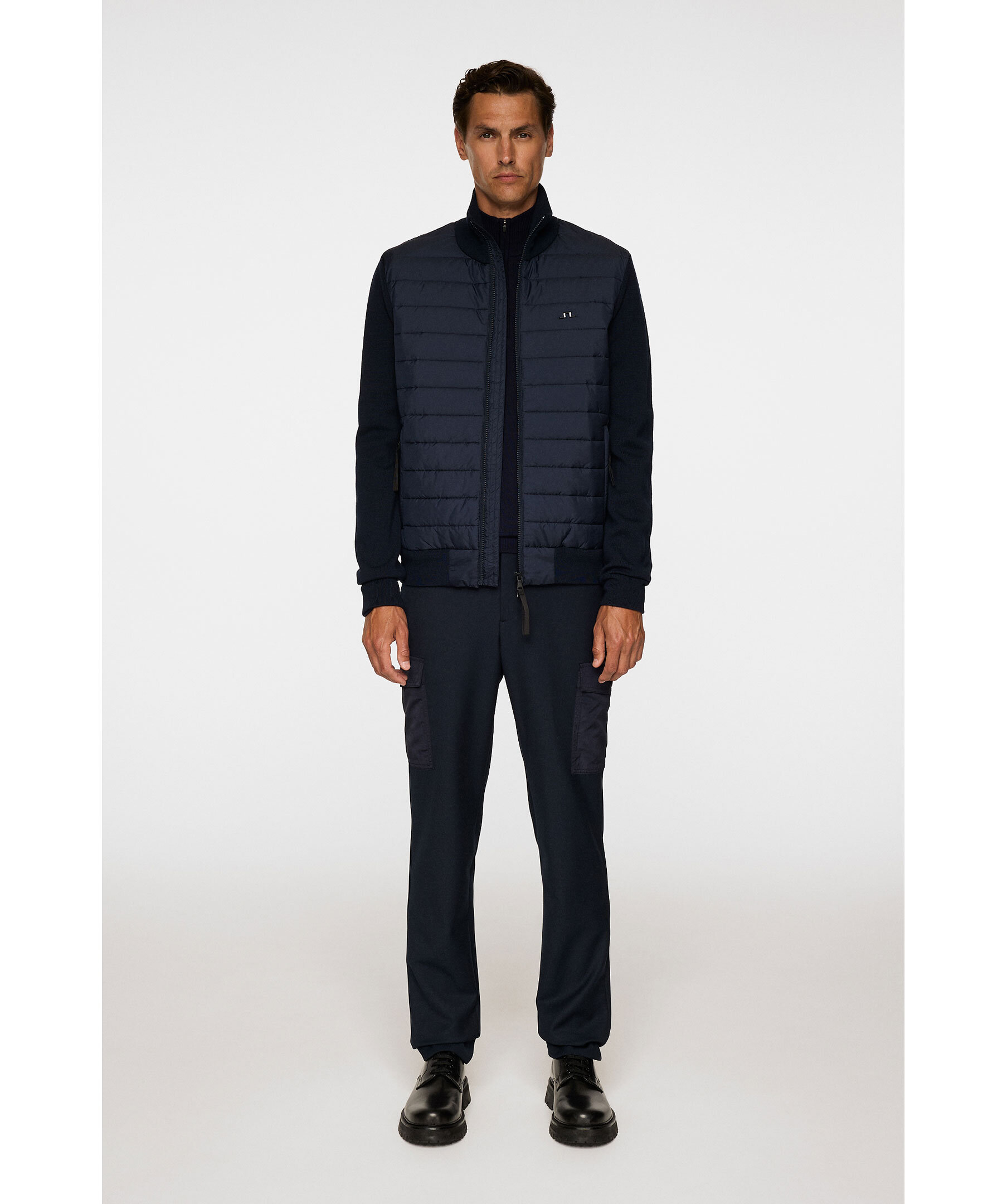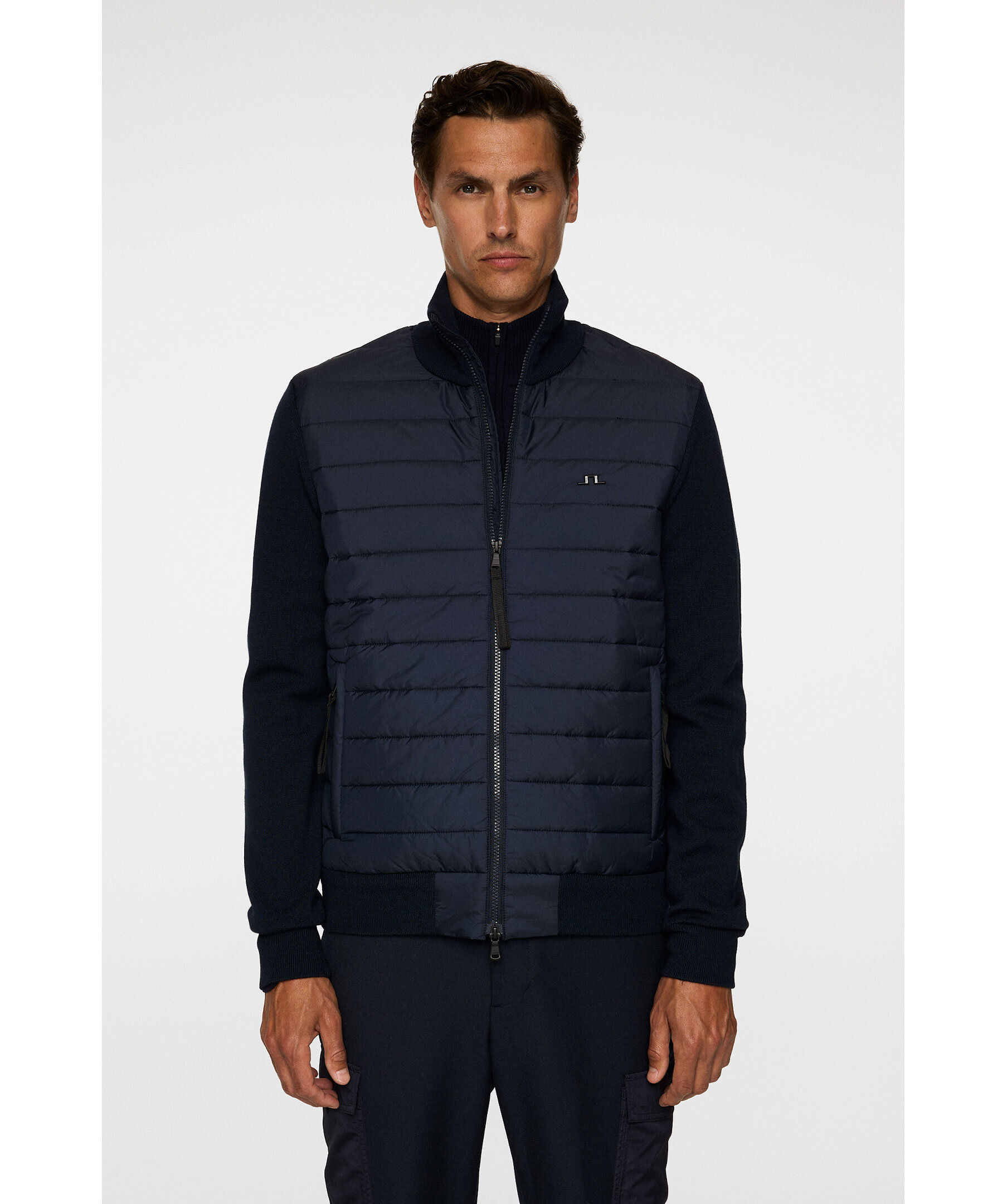 Mörkblå hybridjacka från J Lindeberg. Jackan stängs med tvåvägsdragkedja och har två sidfickor med dragkedja, en merinoullblandad stickad kropp och vadderade paneler i återvunnen Primaloft®. Tillverkad i en polyester- och merinoullblandning.