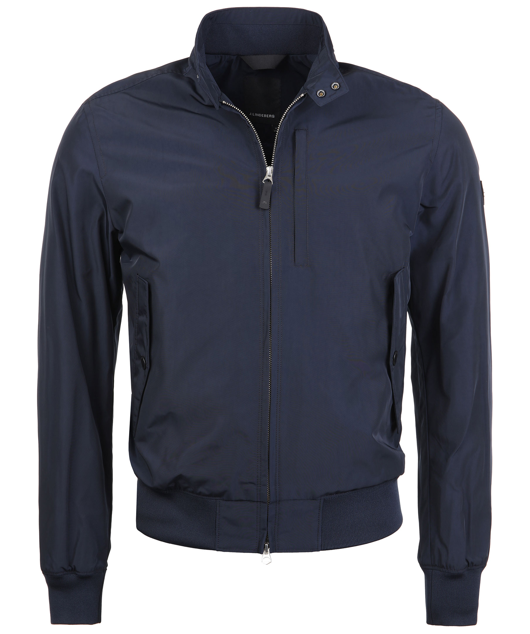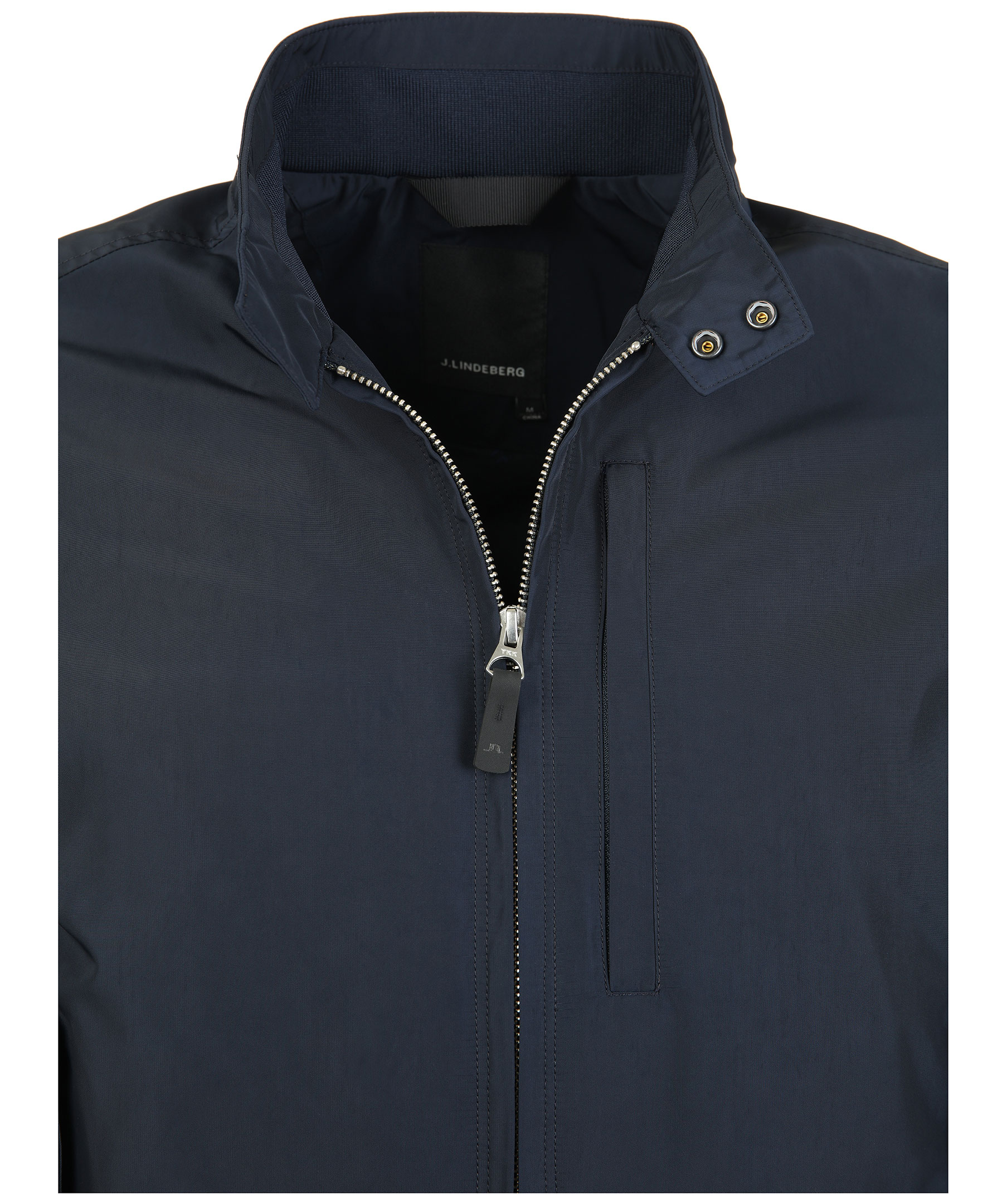 Marinblå jacka med smal passform från J.Lindeberg. Tillverkad i en vattenavvisande och tålig kvalitet. Ficka med dragkedja på bröstet, innerficka och framfickor med tryckknappar. Smidig tvåvägsdragkedja och JL logo patch på vänster ärm. Ribbad detalj på insidan av kragen och J.Lindeberg-printat foder.