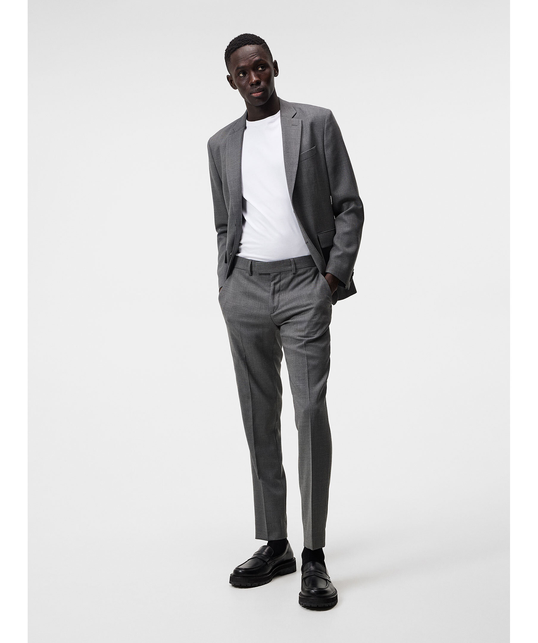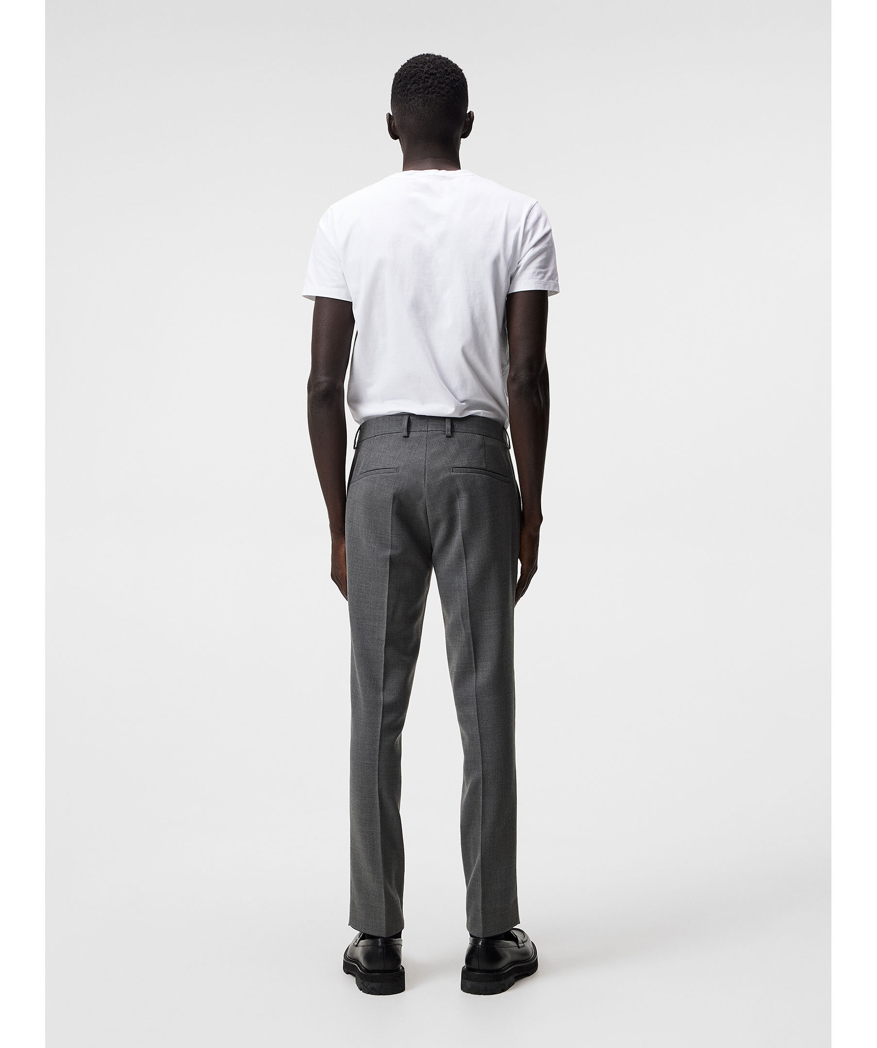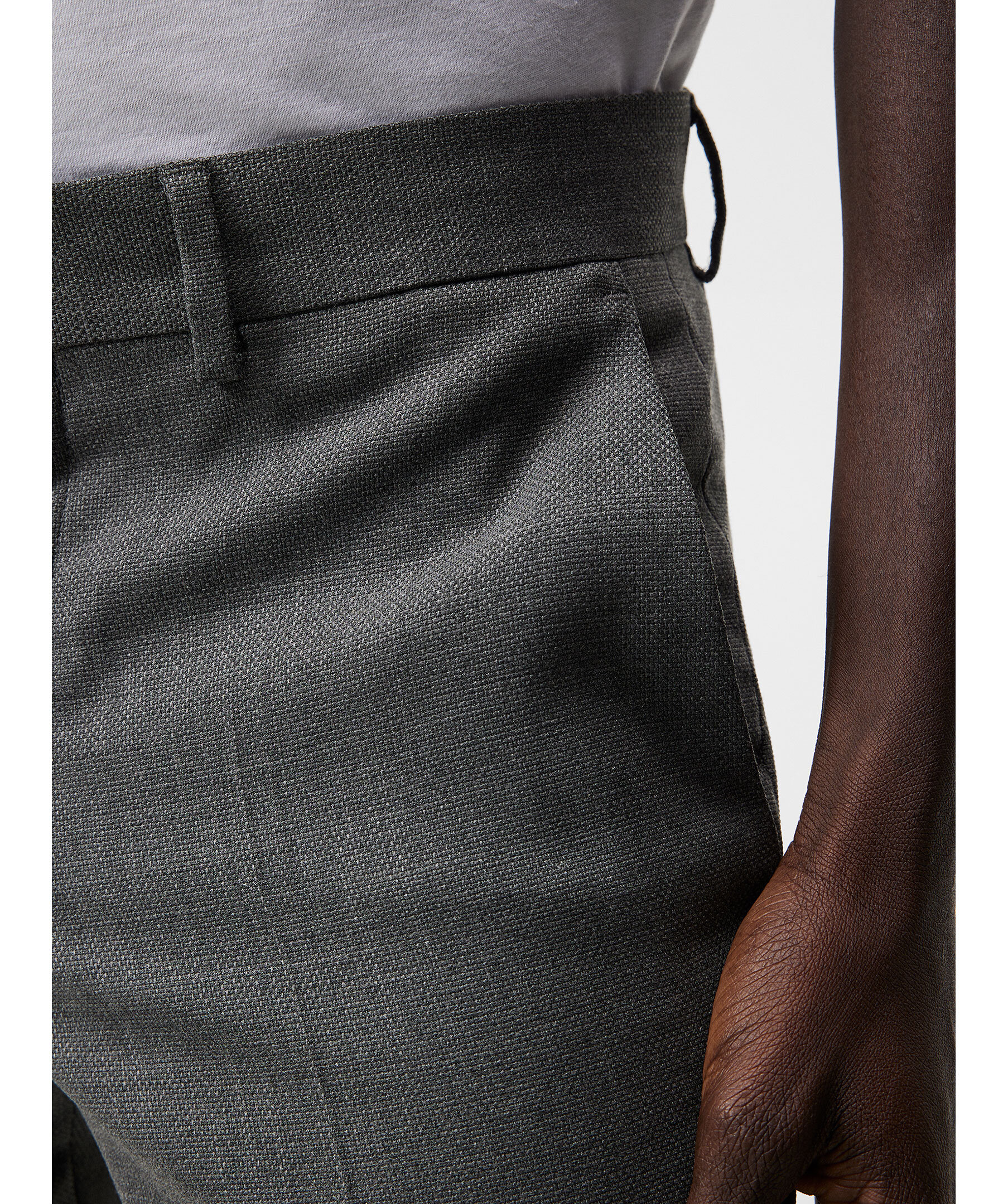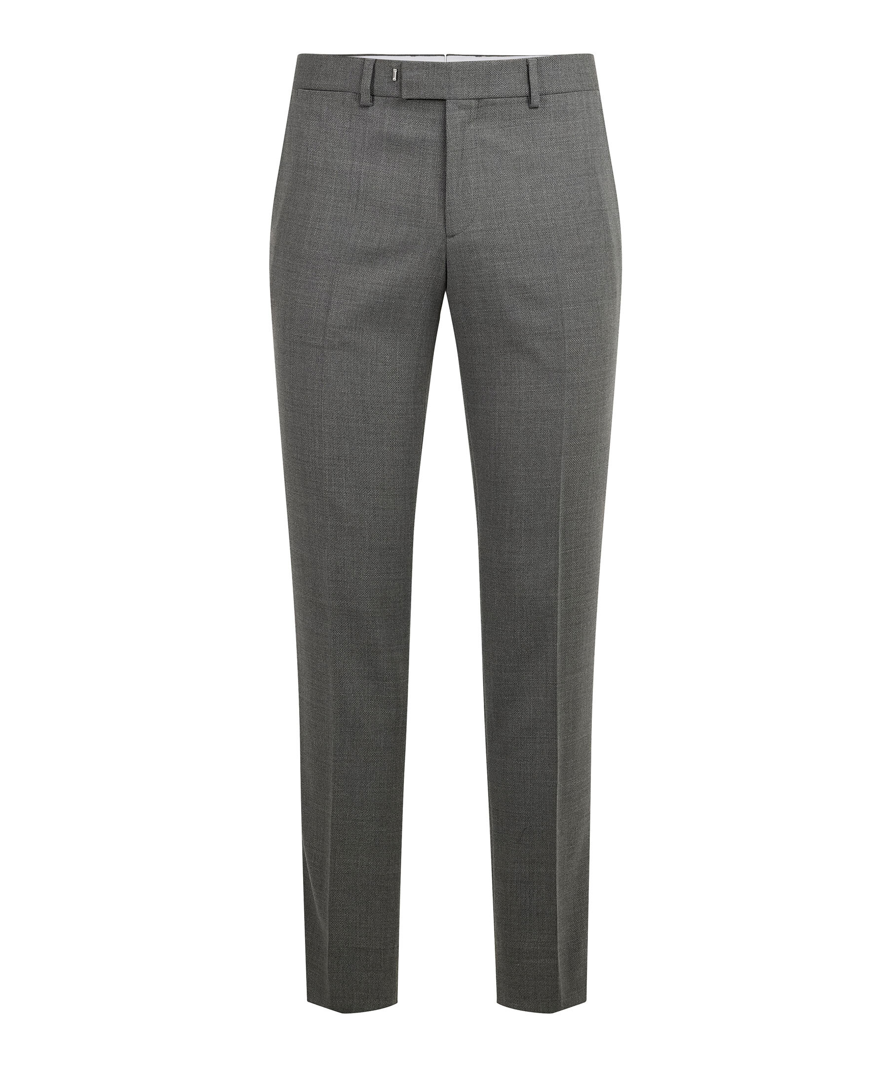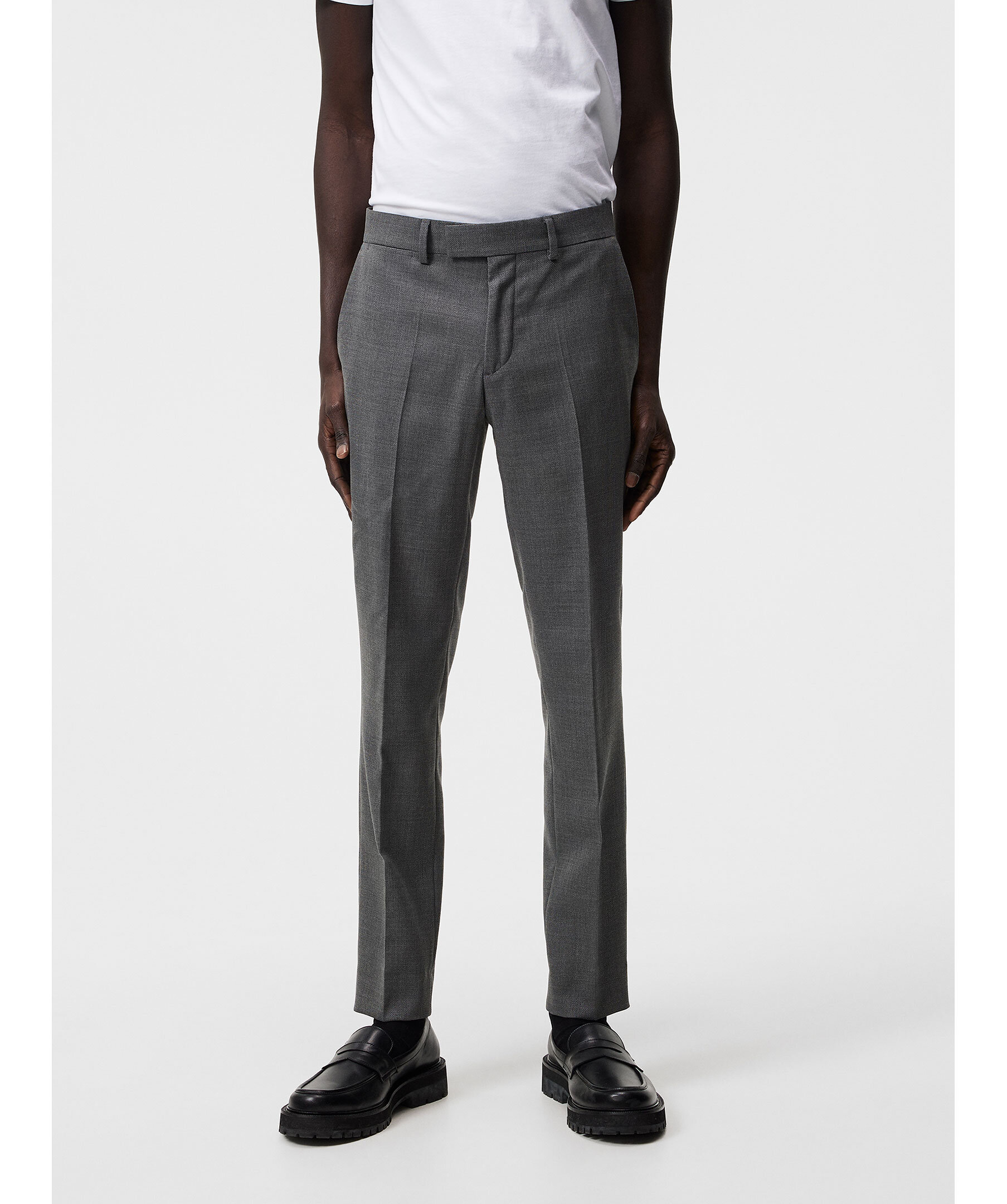 Grå kostymbyxor från J Lindeberg. Byxorna har bälteshällor i midjan, två sidfickor samt två passpoalfickor baktill och pressveck fram och bak. Stängs med blixtlåsgylf med hake och hyska samt säkerhetsknapp. Tillverkade med en hopsack-struktur.