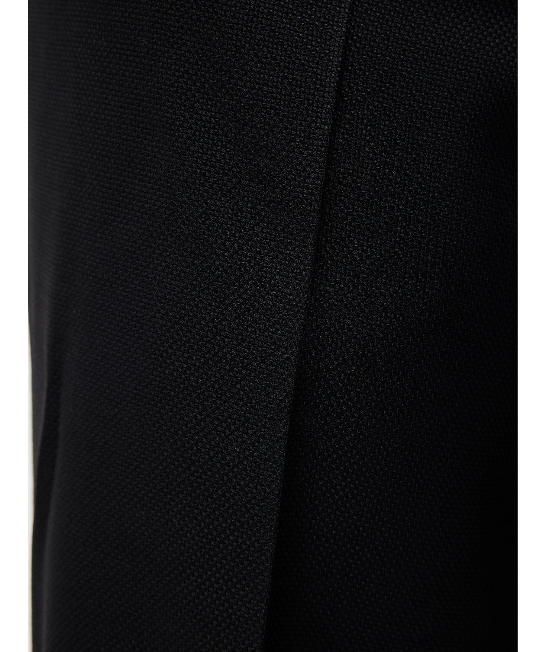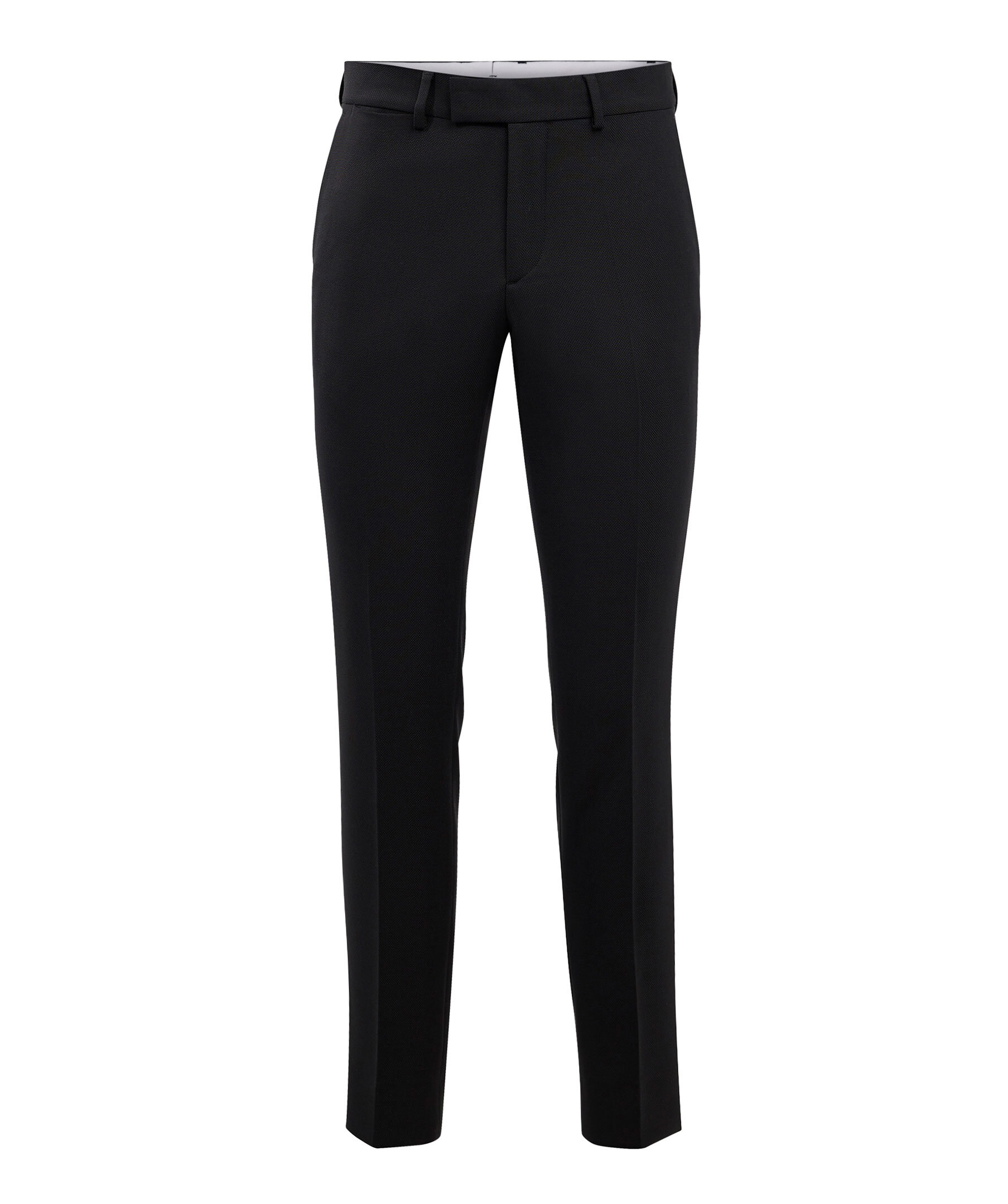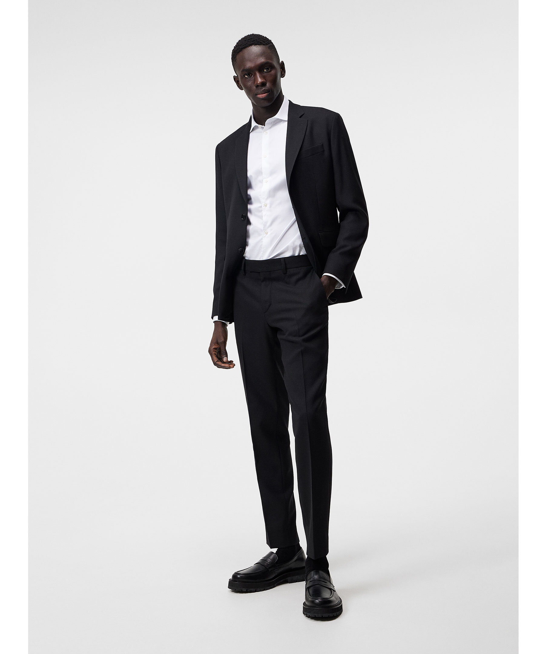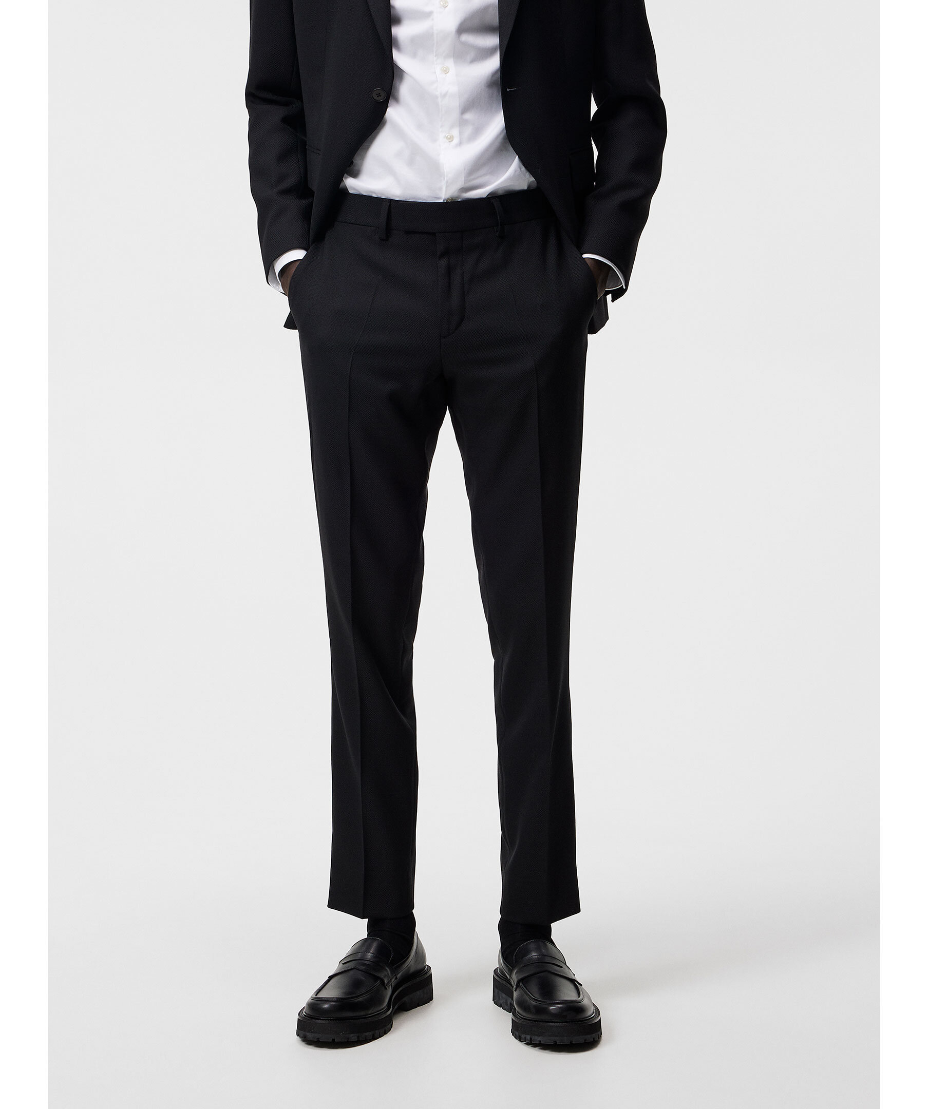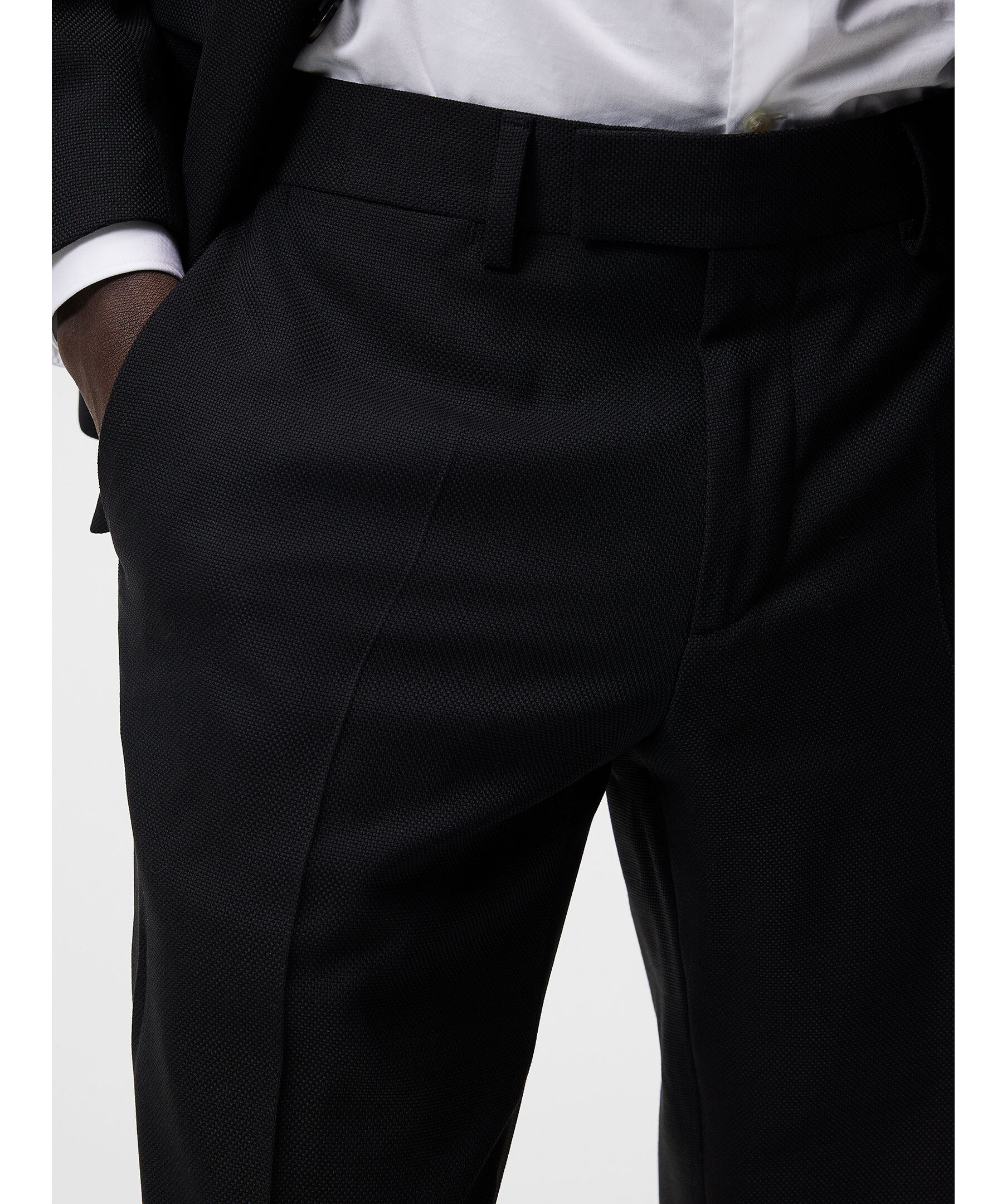 Svarta kostymbyxor från J Lindeberg. Byxorna har bälteshällor i midjan, två sidfickor samt två passpoalfickor baktill och pressveck fram och bak. Stängs med blixtlåsgylf med hake och hyska samt säkerhetsknapp. Tillverkade med en hopsack-struktur.