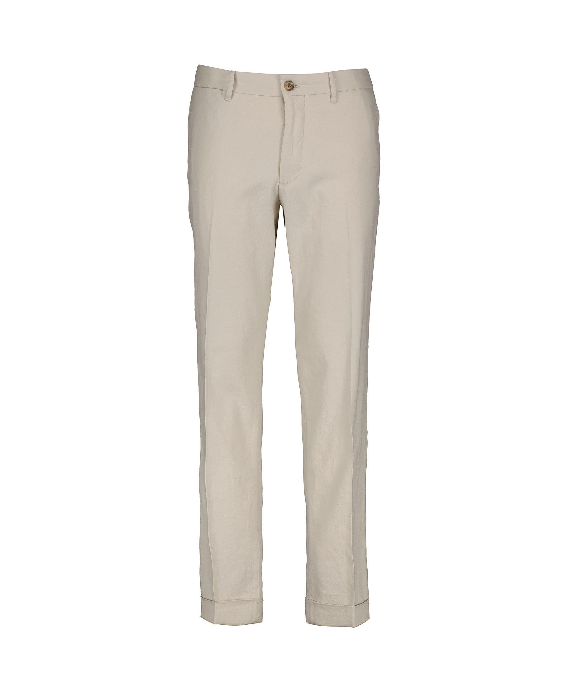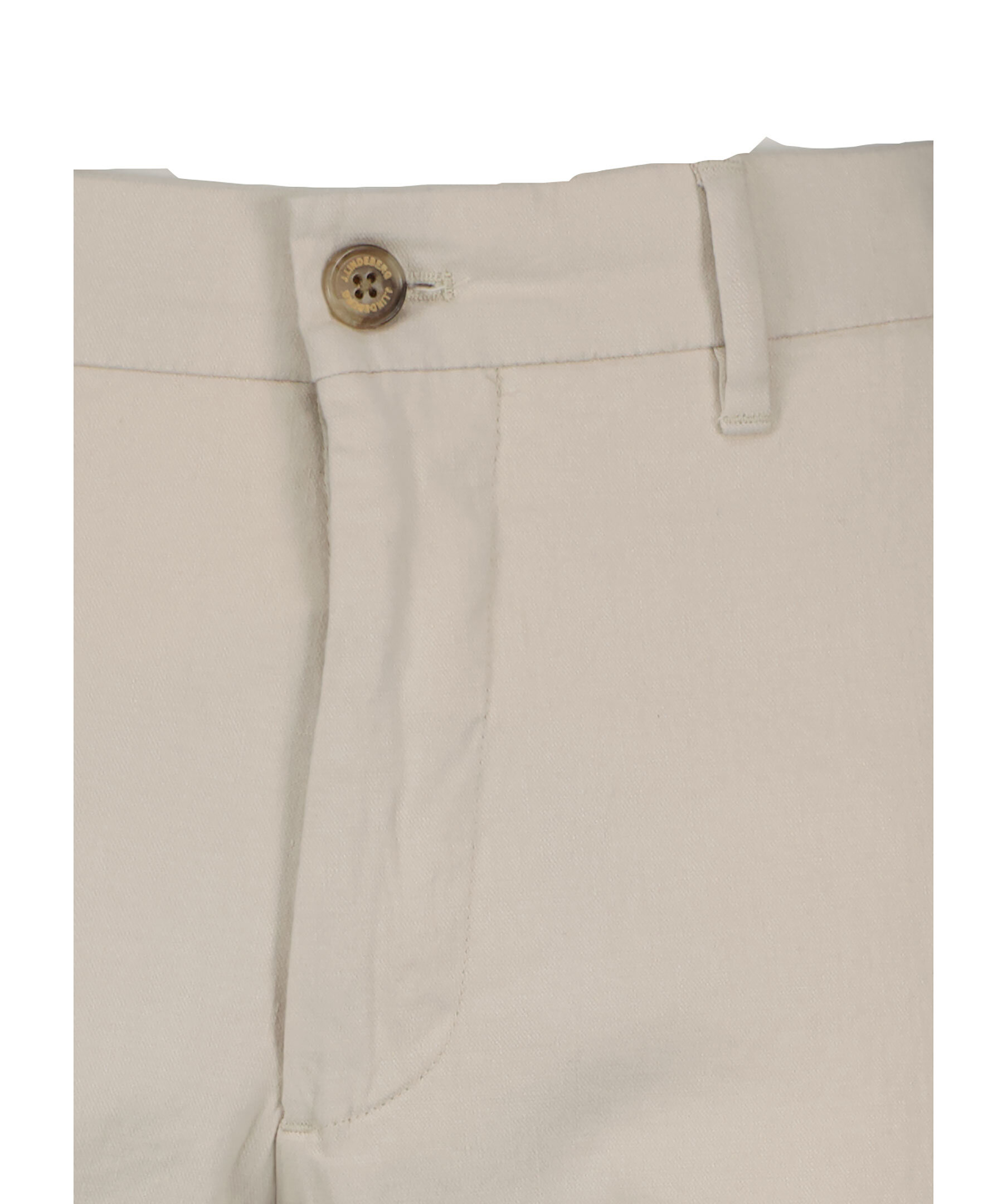 Sandfärgade linnebyxor i en chinosstil från J Lindeberg. Byxorna har bälteshällor i midjan, två sidfickor, en diskret myntficka samttvå passpoalfickor baktill med knapp. Pressveck och uppvikta ben. Tillverkade i en linne- och bomullsblandning.