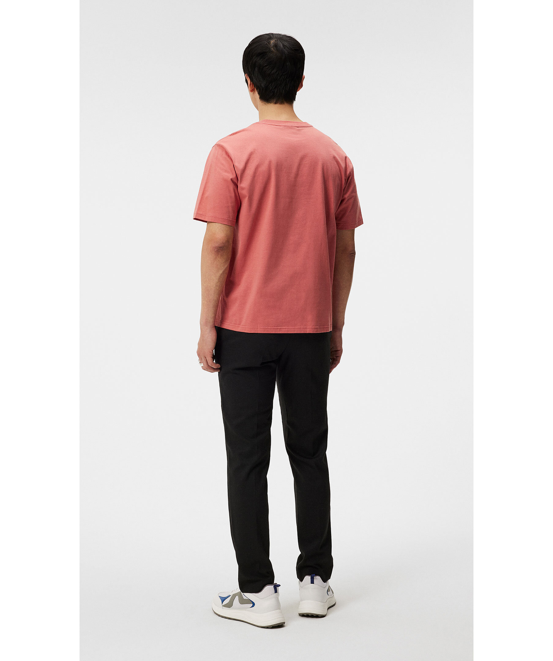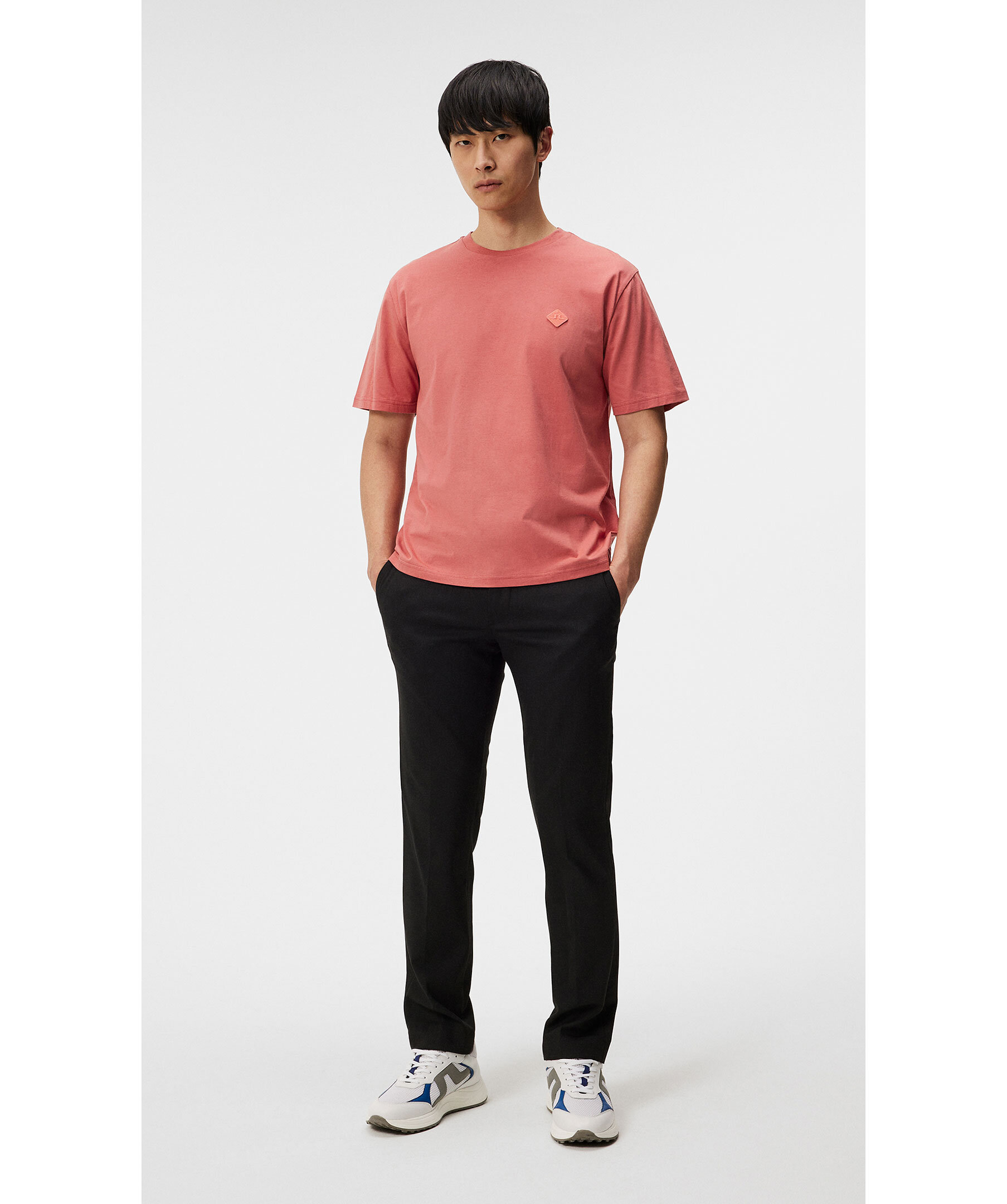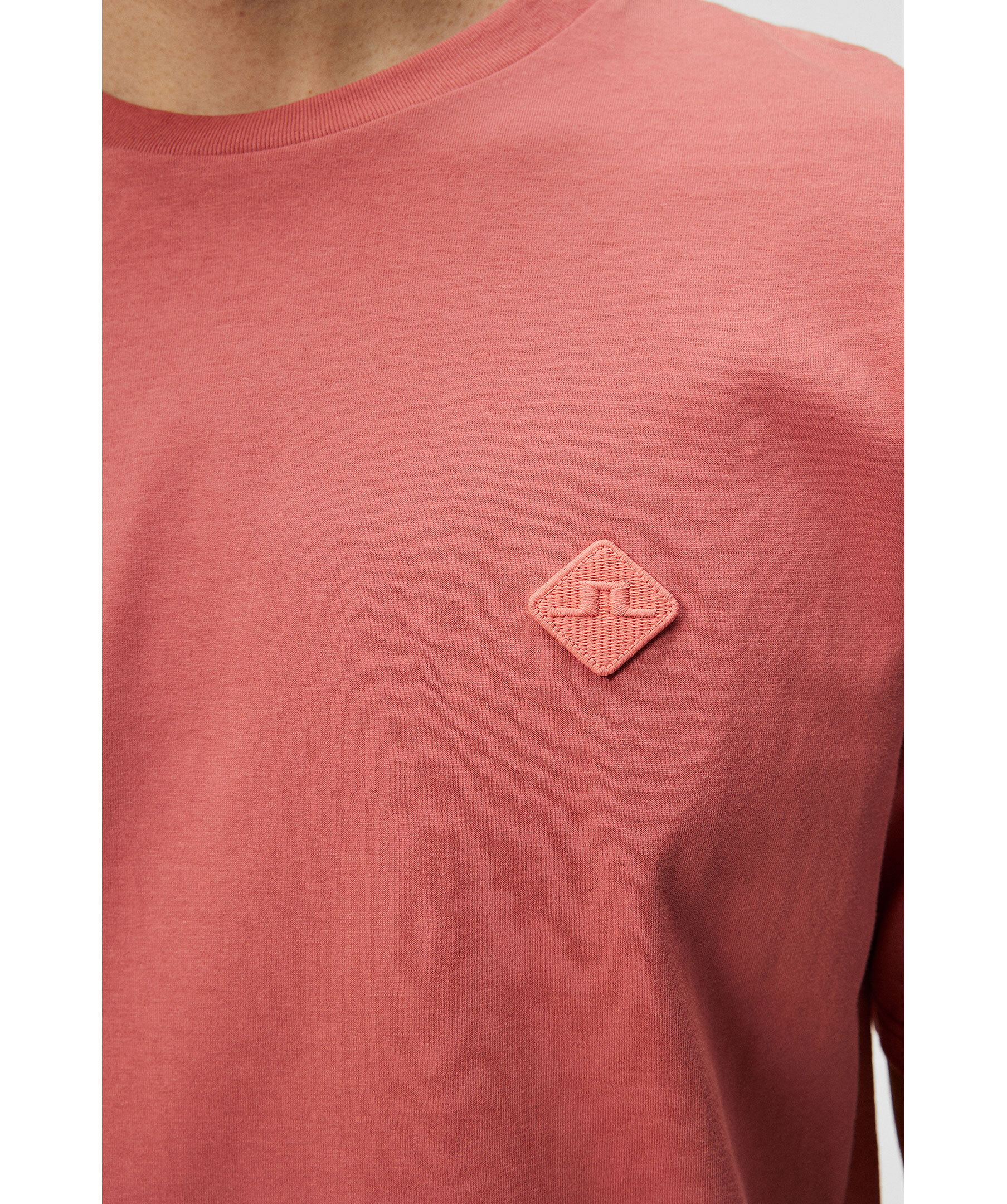 Korallröd t-shirt från J Lindeberg. Rundad halsringning. Broderad patch med logotyp på vänster bröst. Avslappnad passform. Tillverkad i 100% Ekologisk bomull. Modellen är 187 cm och bär storleken M.