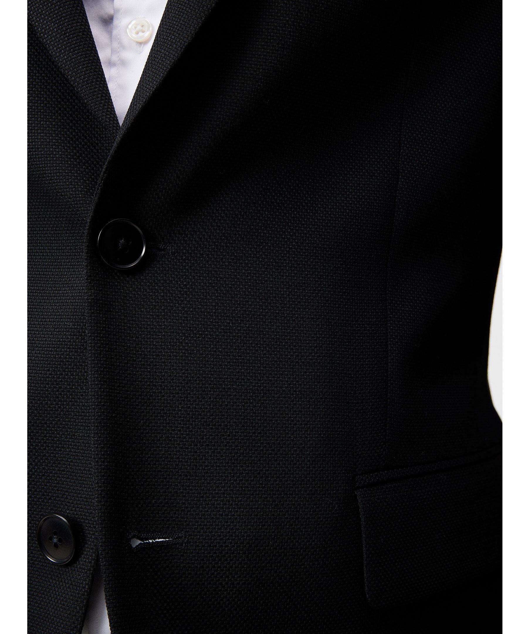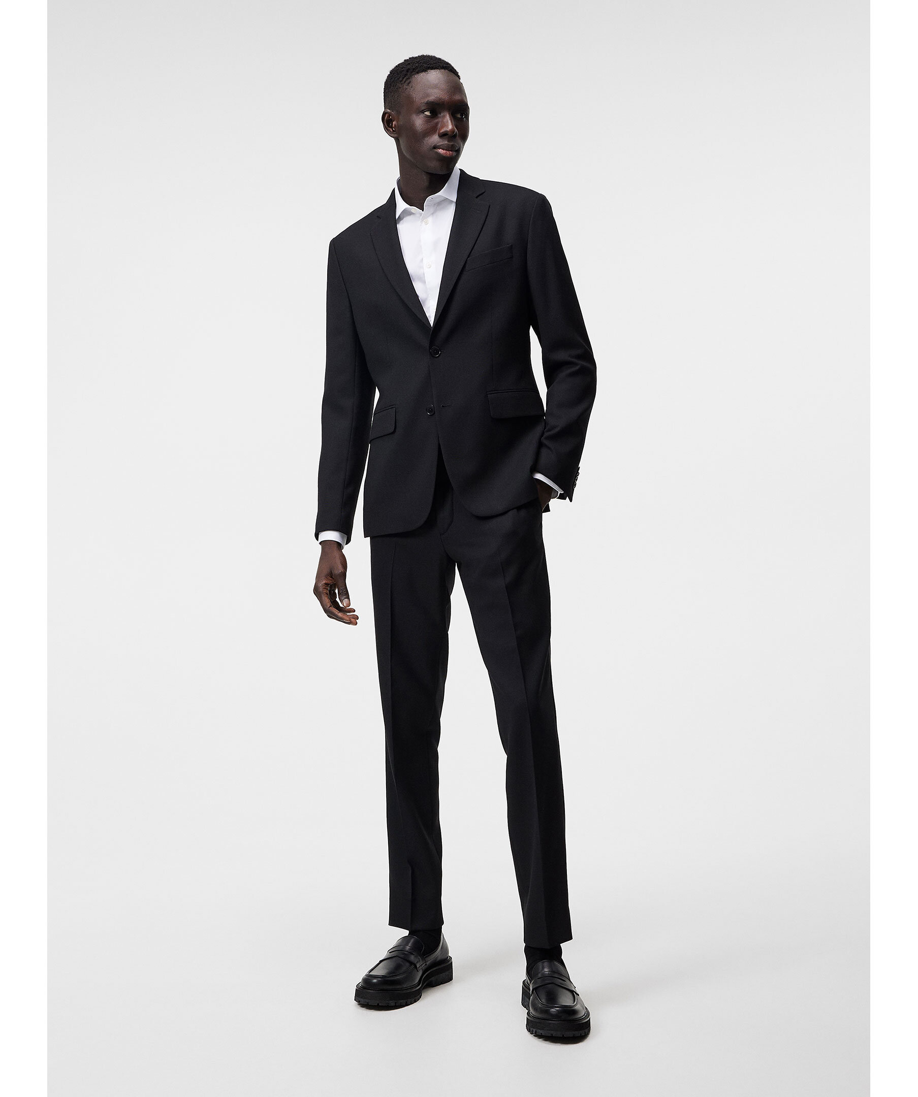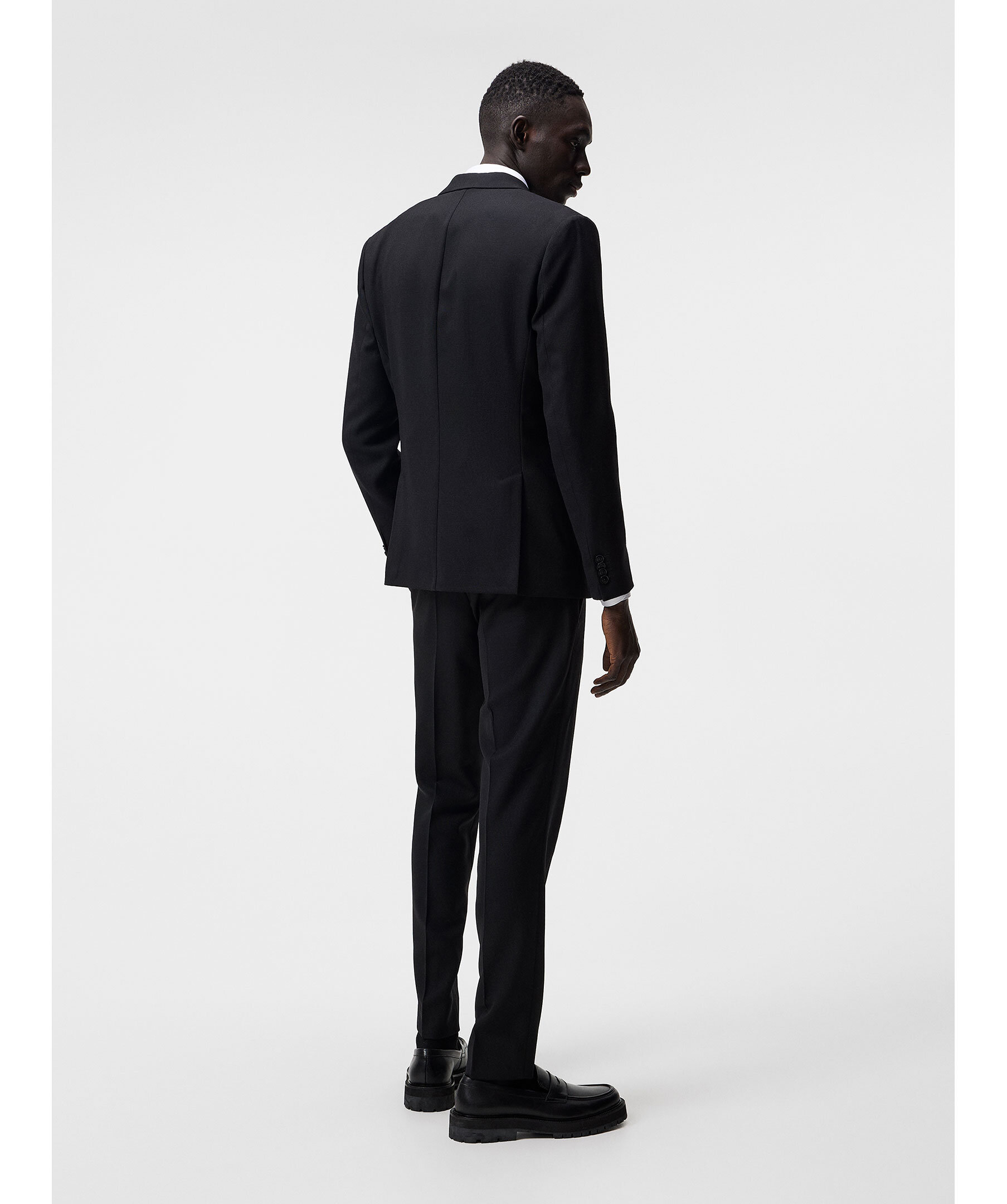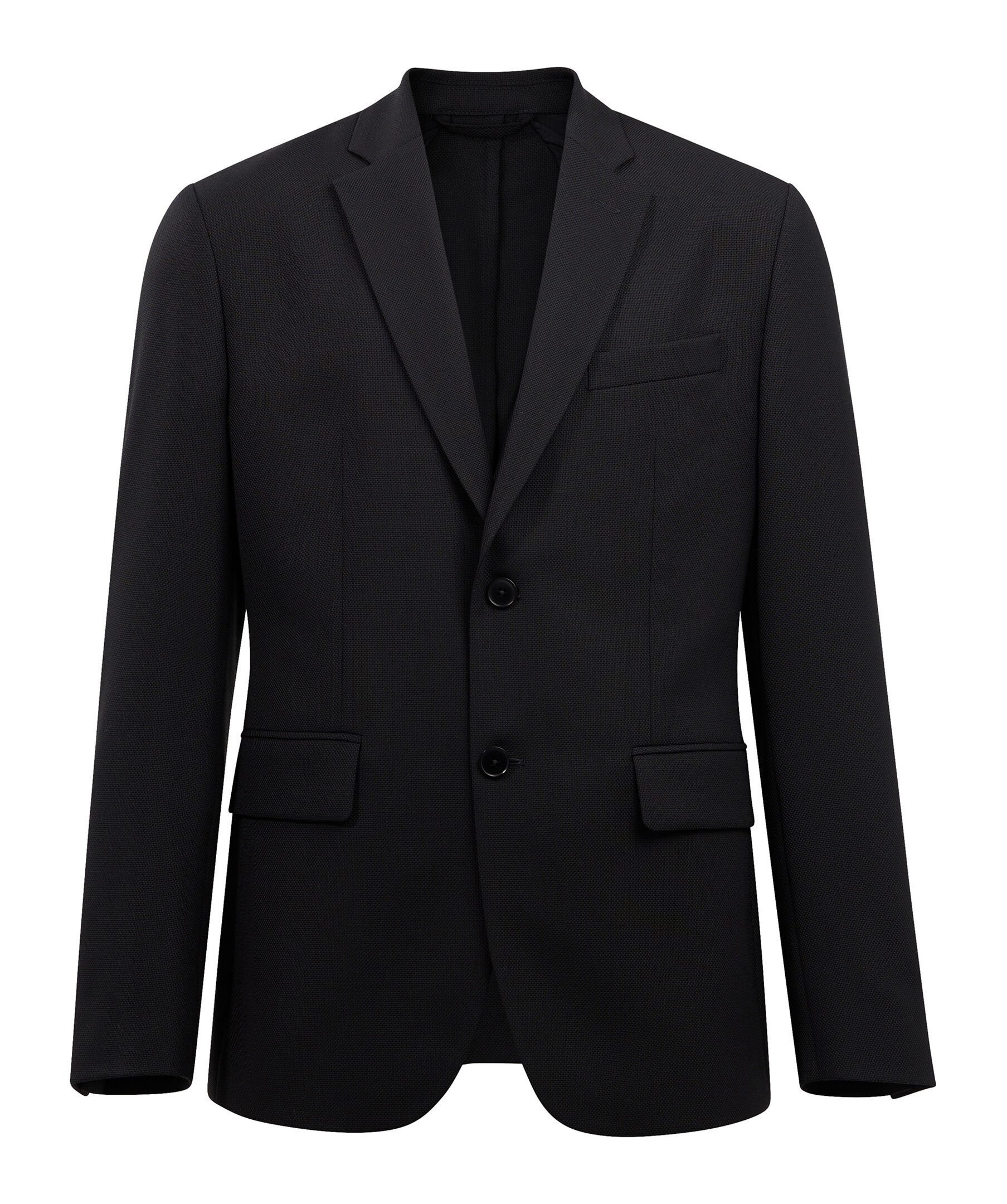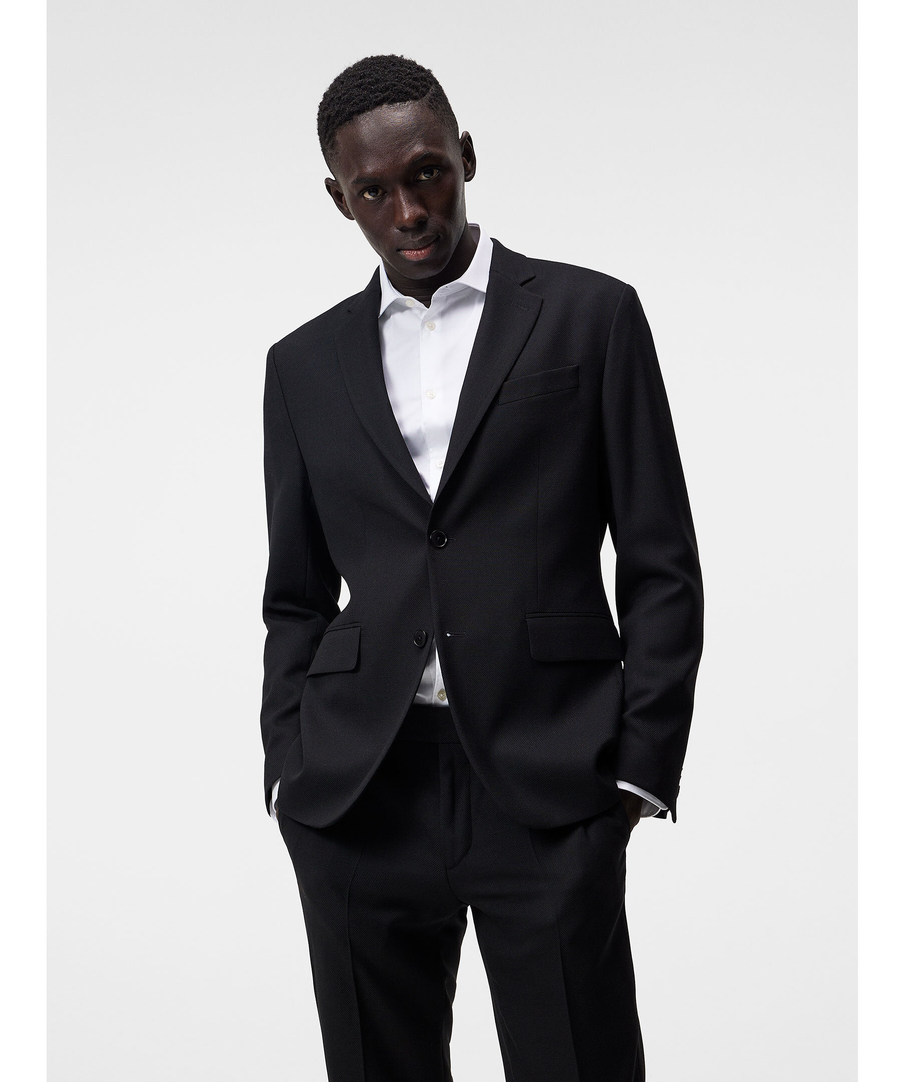 Svart kavaj från J Lindeberg. Kavajen är enkelknäppt med två knappar framtill och två fickor med lock. Halvfodrad med logotypfoder. Naggslag. Tillverkad i en ullblandning.
