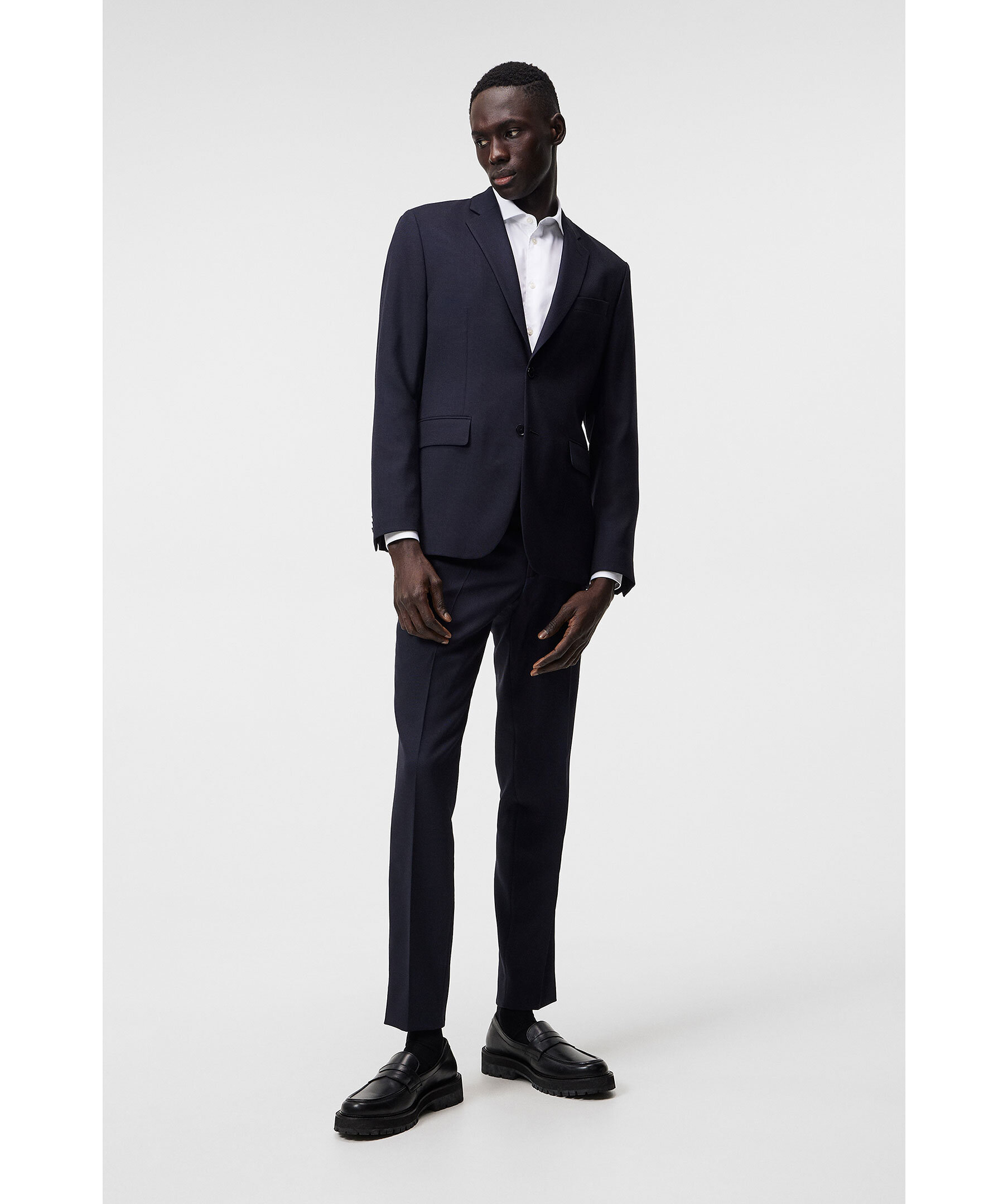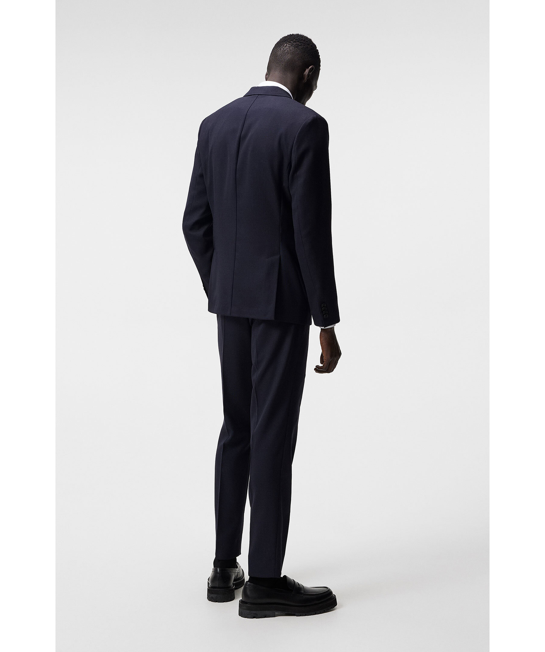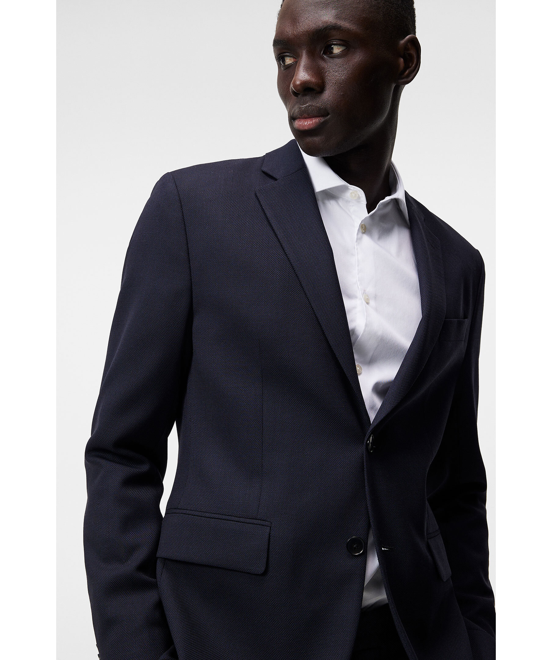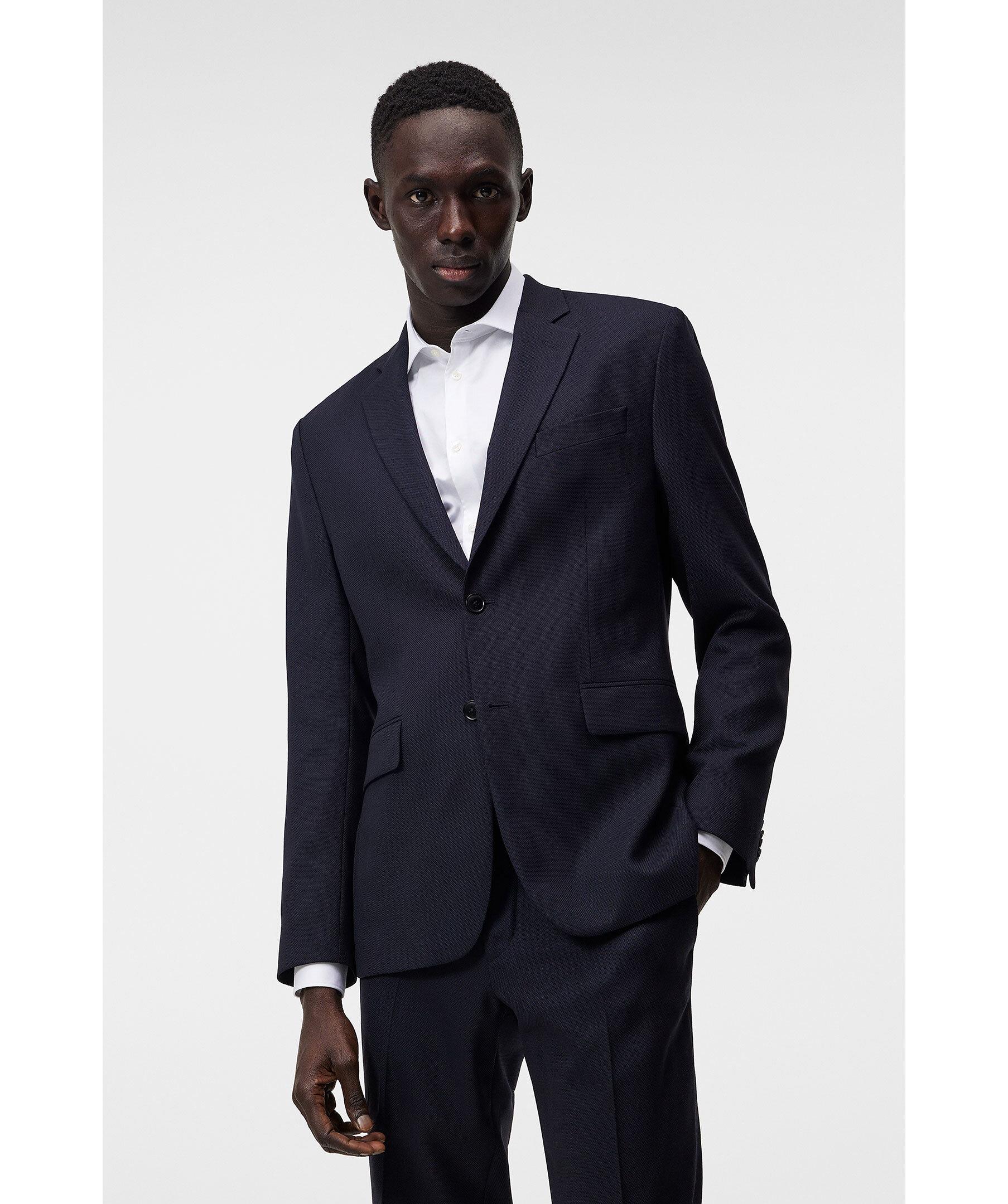 Marinblå kavaj från J Lindeberg. Kavajen är enkelknäppt med två knappar framtill och två fickor med lock. Halvfodrad med logotypfoder. Naggslag. Tillverkad i en ullblandning.