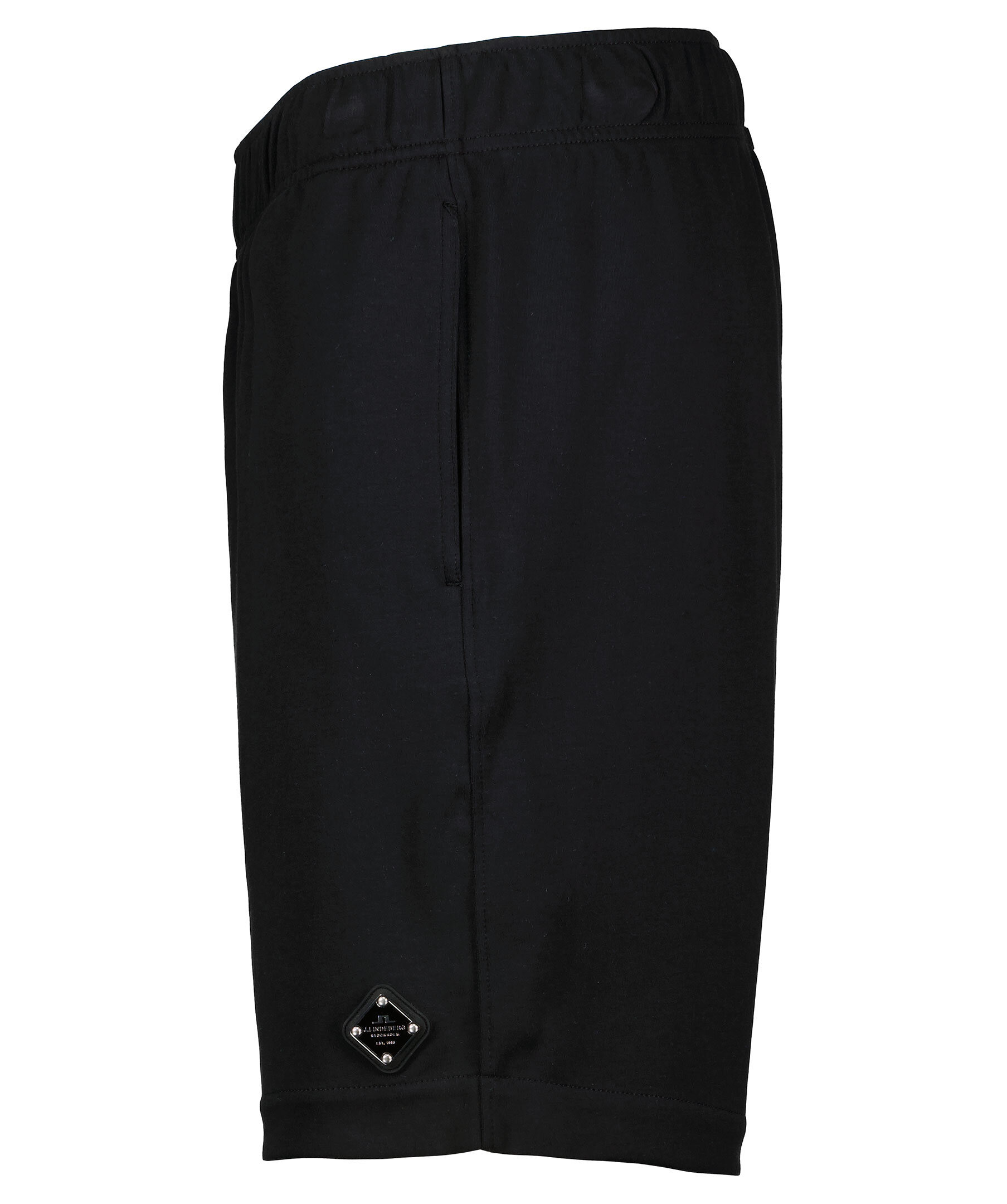 Svarta mjukisshorts i 100% bomull från J Lindeberg. Två sneda fickor fram samt muddar och snörning i midjan. Logotyp på vänster ben i gummi och metall. Foder i mesh på insidan.