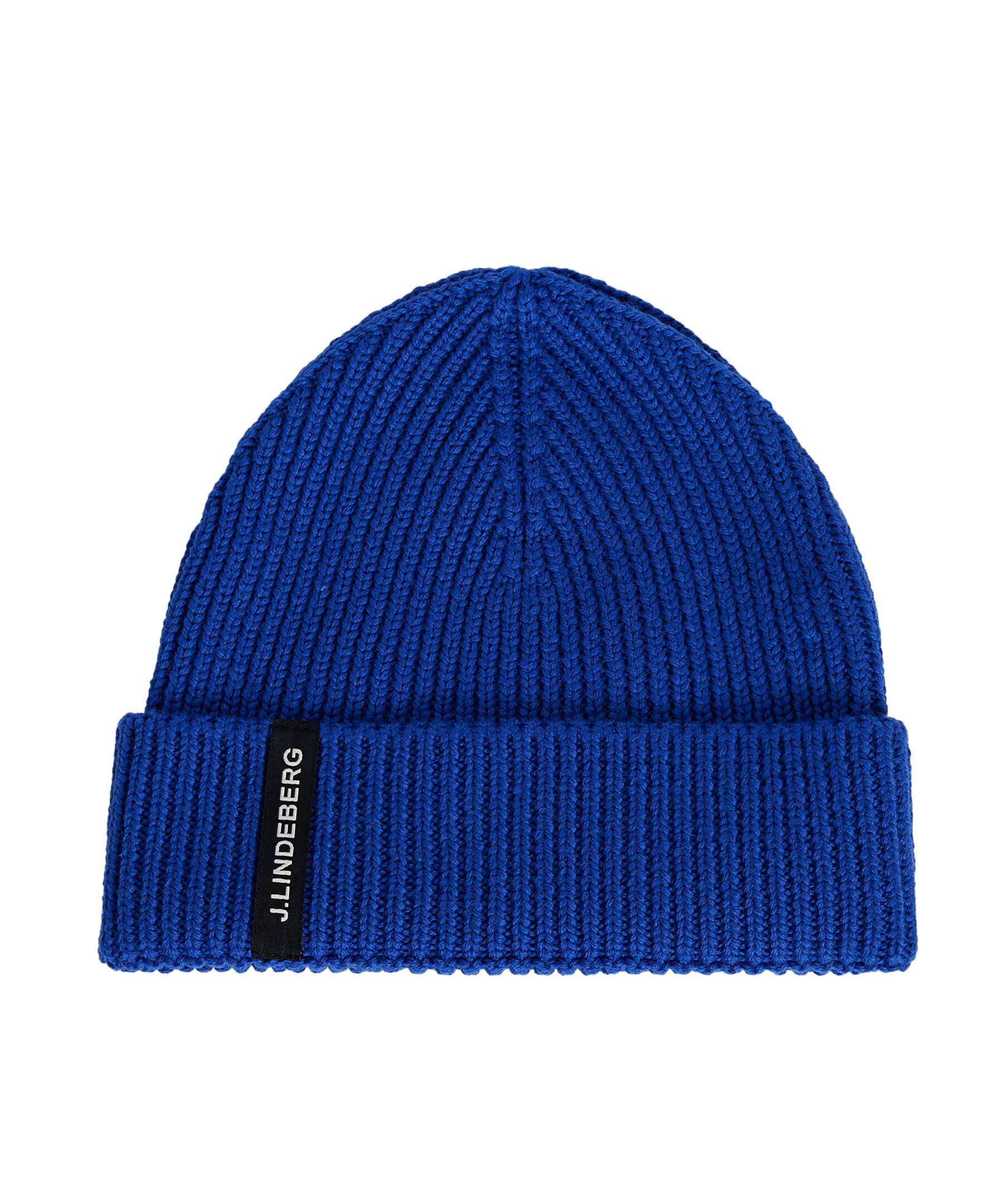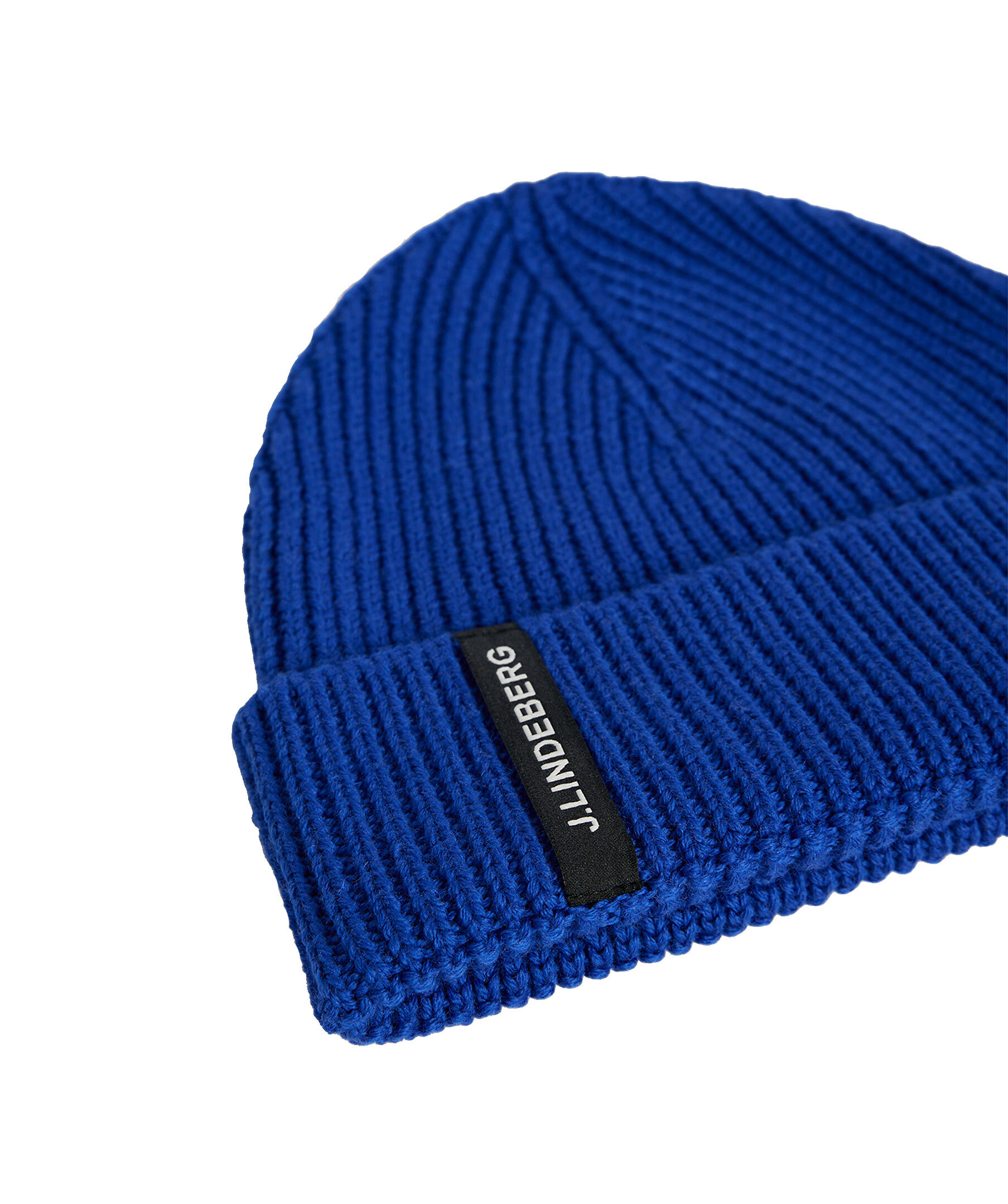 Kleinblå ribbstickad mössa från J Lindeberg. Tillverkad av 100% merinoull. Svart och vit logotyp-lapp på framsidan.