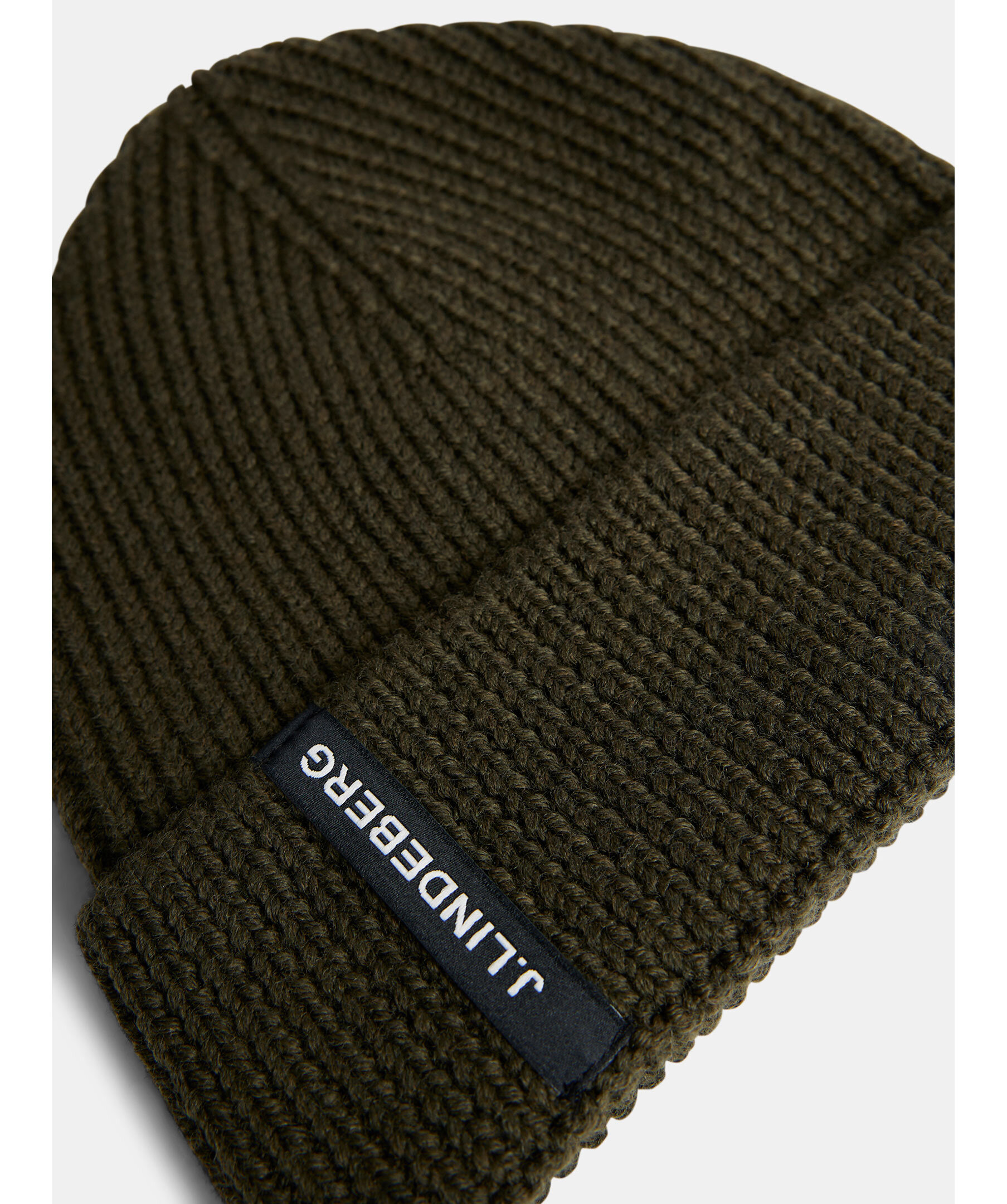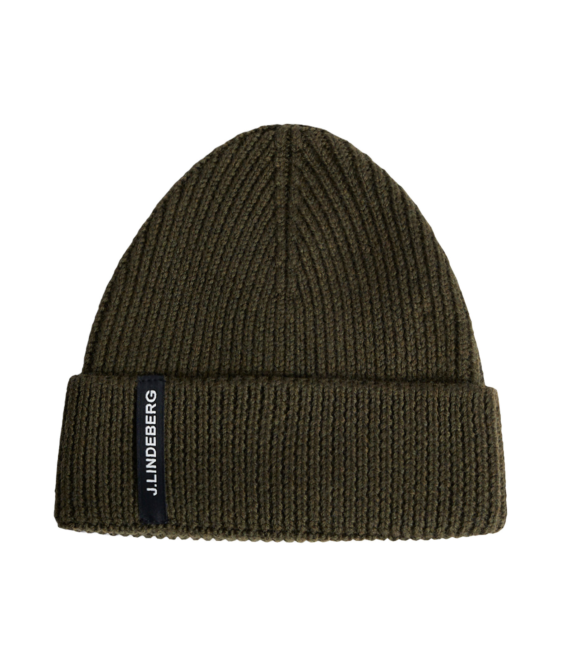Skogsgrön ribbstickad mössa från J Lindeberg. Tillverkad av 100% merinoull. Svart och vit logotyp-lapp på framsidan.