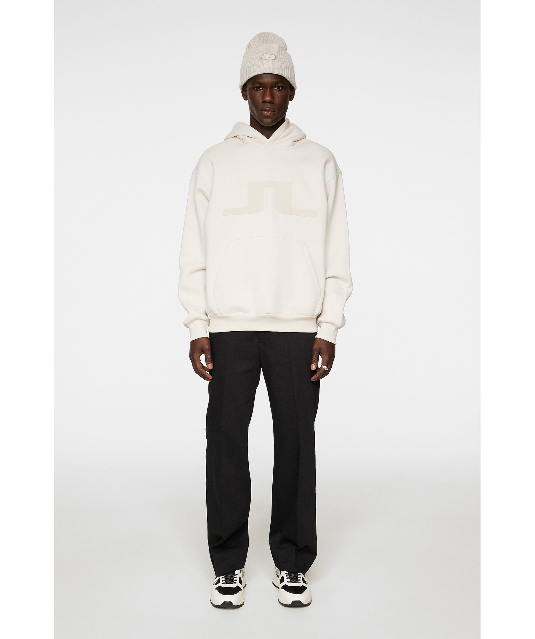 Krämvit hoodie från J.Lindeberg. Tillverkad i en blandning av ekologisk bomull och återvunnen polyesterjersey med säsongsbetonat grafiktryck på bröstet. Den är skuren i en avslappnad passform som inspirerats av vintagetröjor, och på framsidan sitter en rymlig munkficka. Ha den som ett lager under en rock eller jacka.