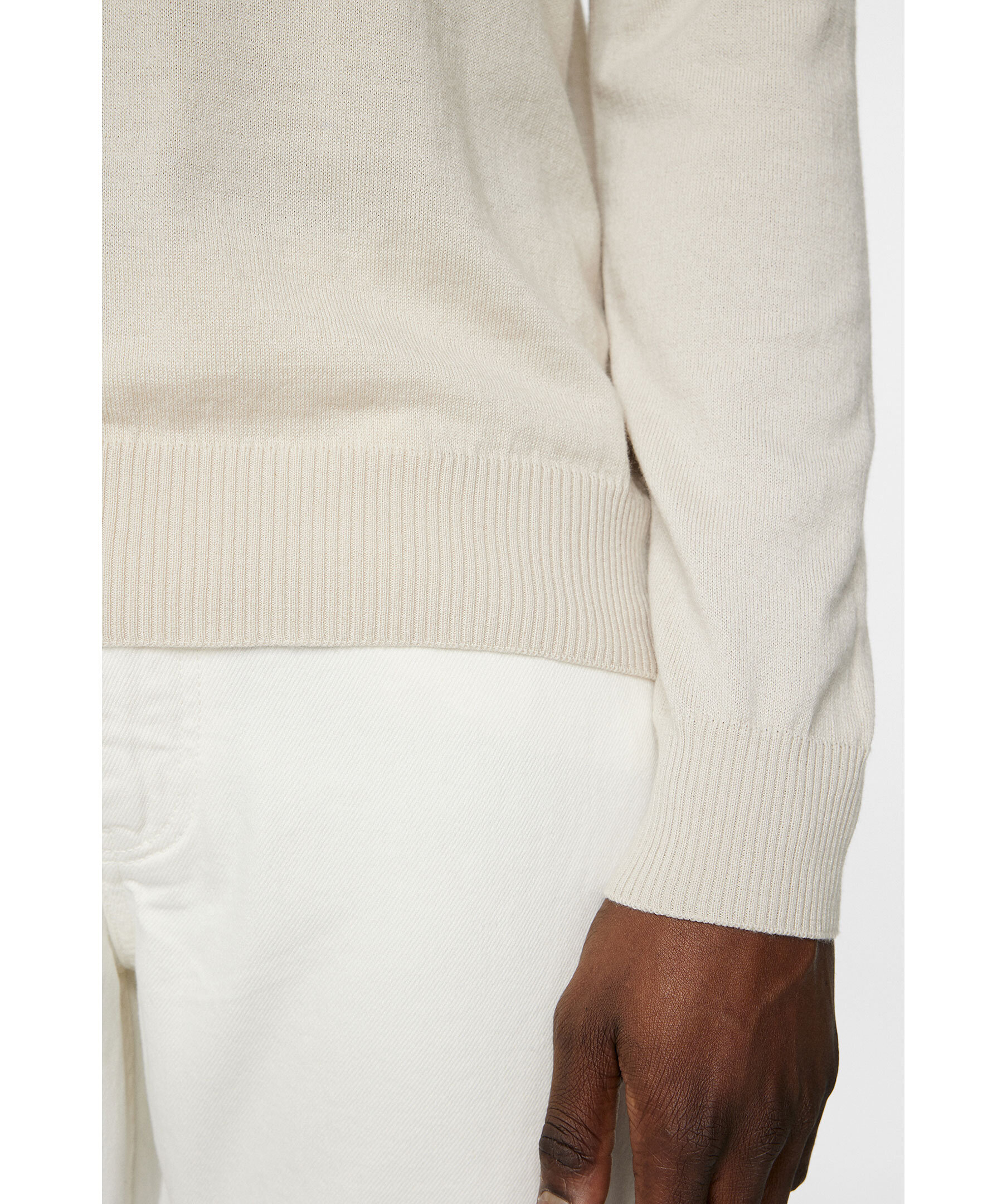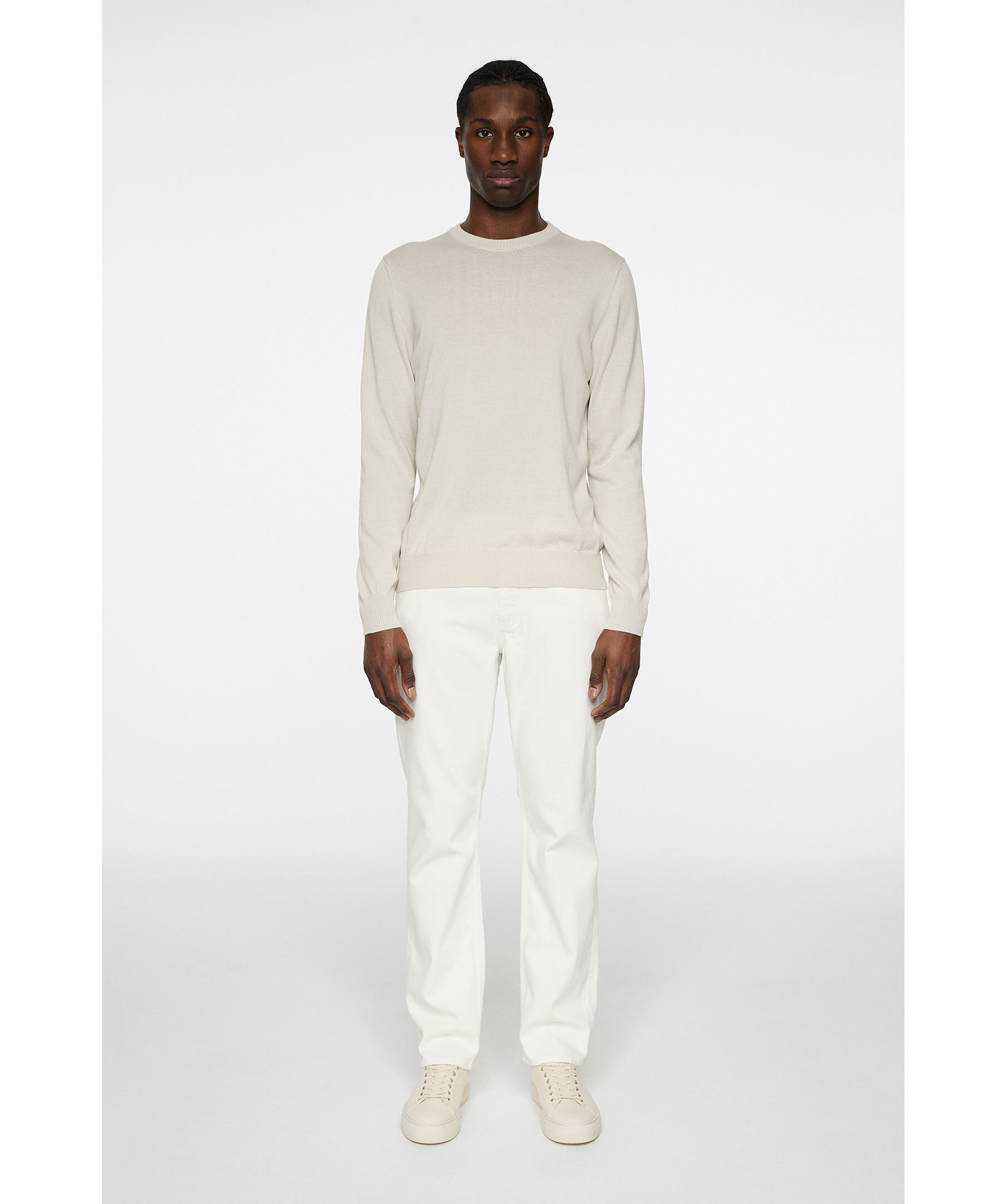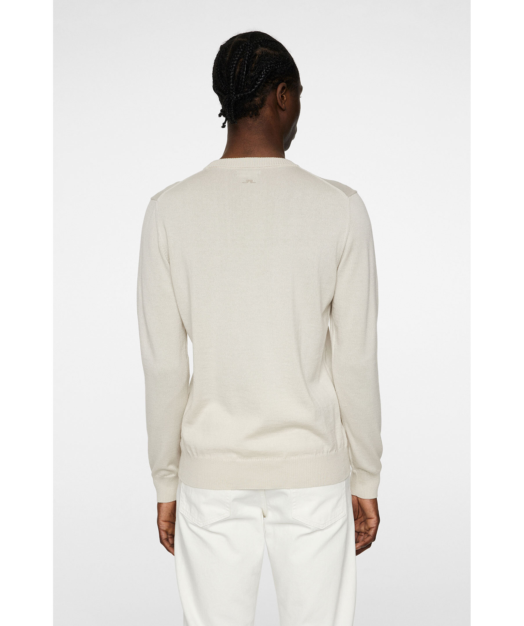 Greige, finstickad pullover från J Lindeberg. Tröjan har rundad och ribbstickad halsringning, ribbstickade muddar vid ärm- och plaggslut samt en subtil logotyp i nacken. Tillverkad i en merinoullblandning.