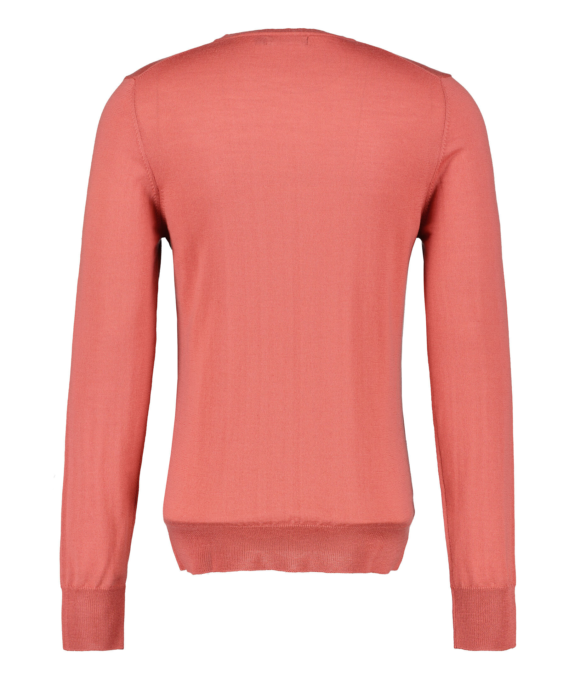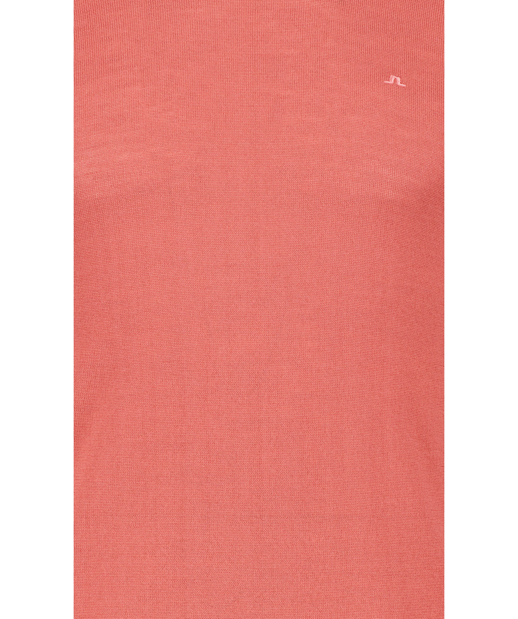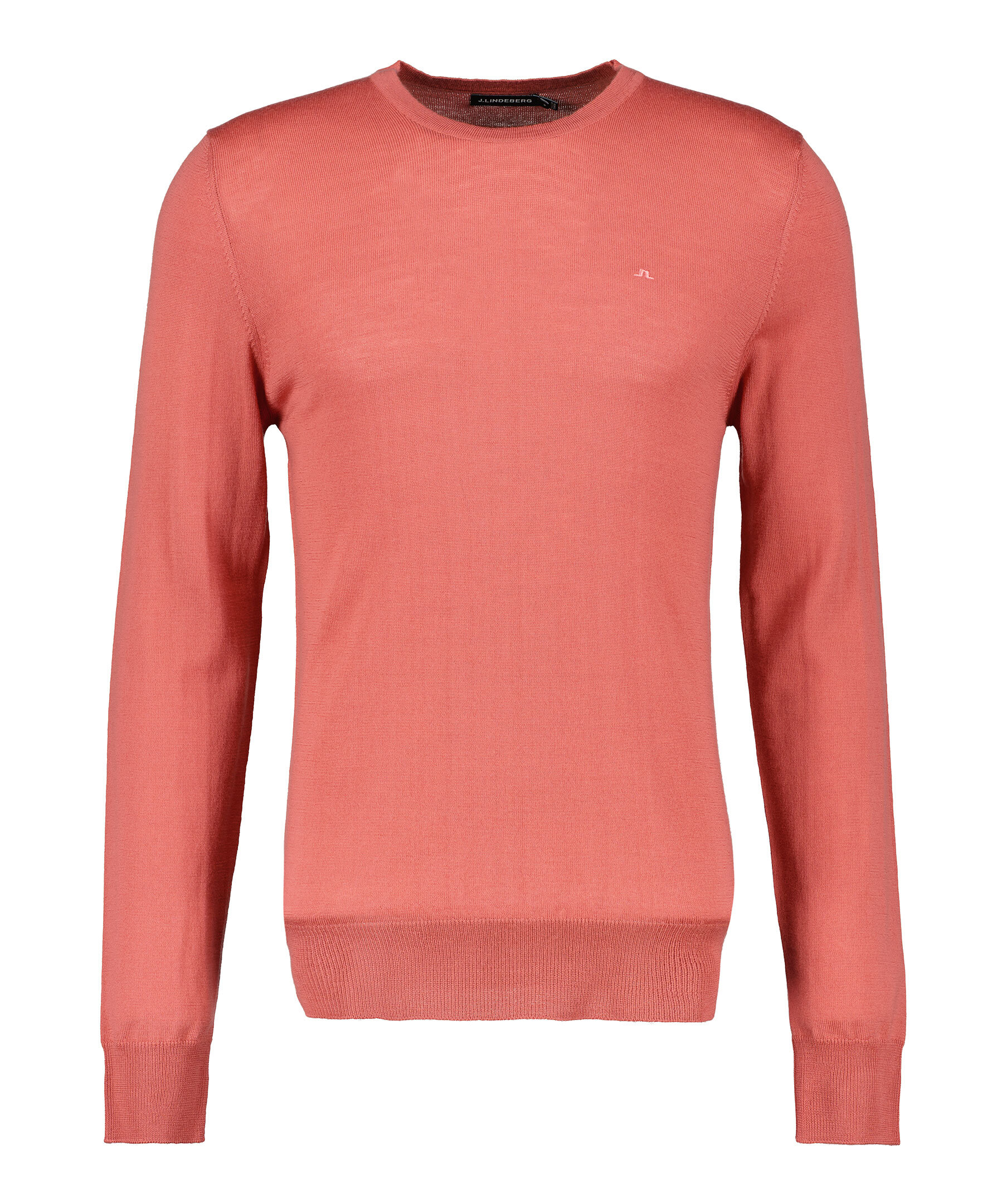 Korallröd finstickad crewneck från J Lindeberg. Tillverkad av 100% merinoull. Ribbstickad halsringning samt muddar vid plagg och ärmslut. Liten broderad ton-i-ton logotyp på bröstet.