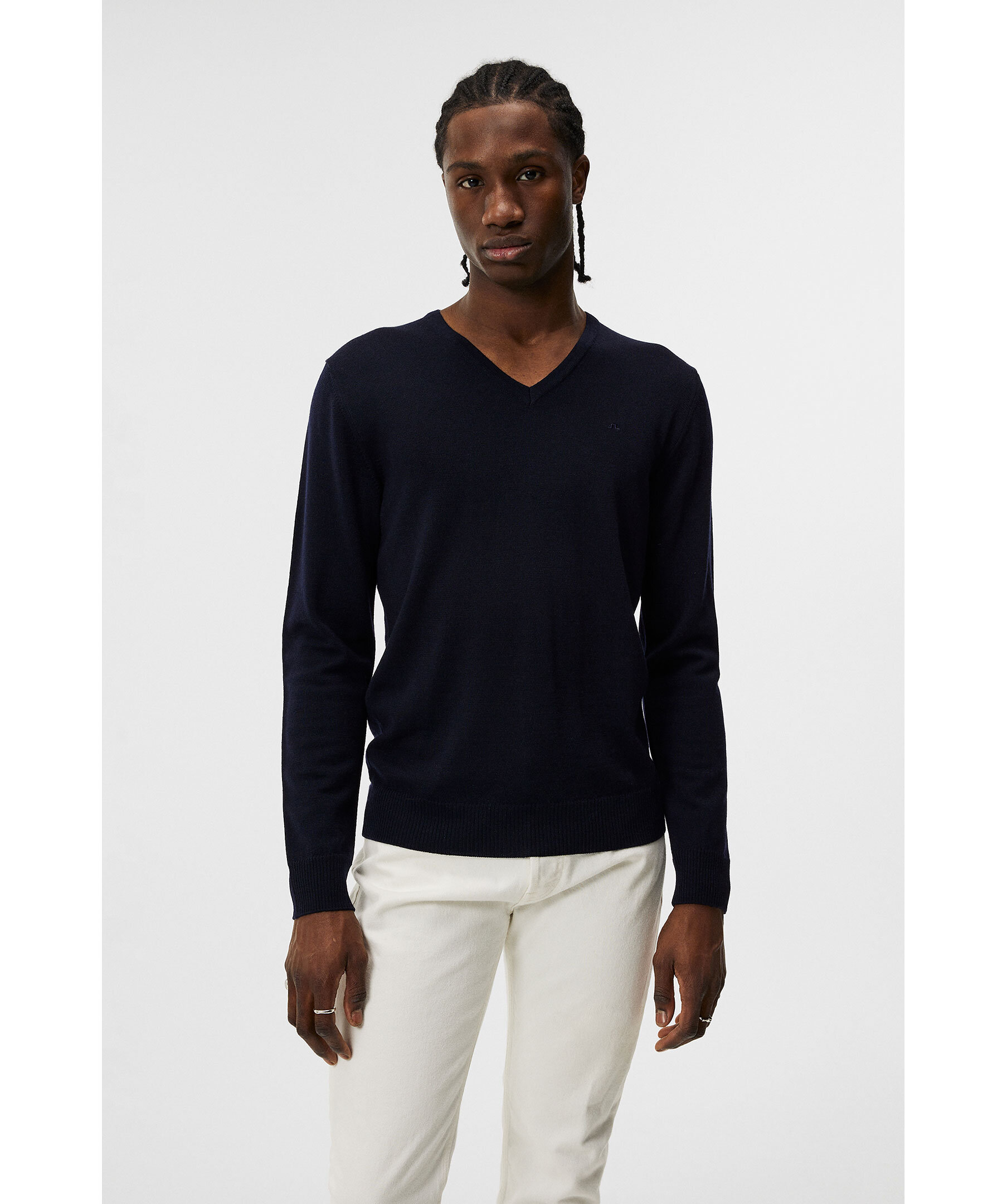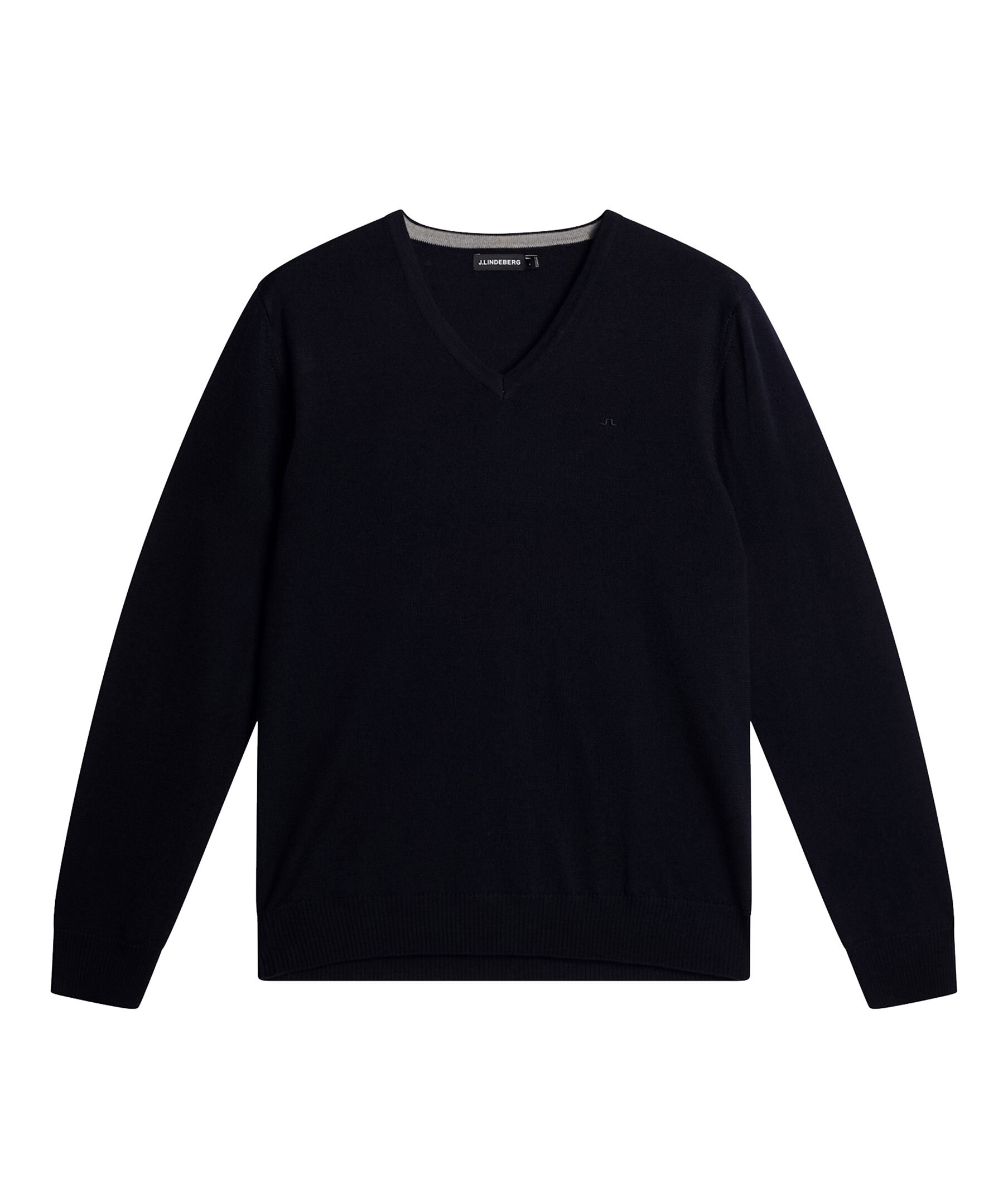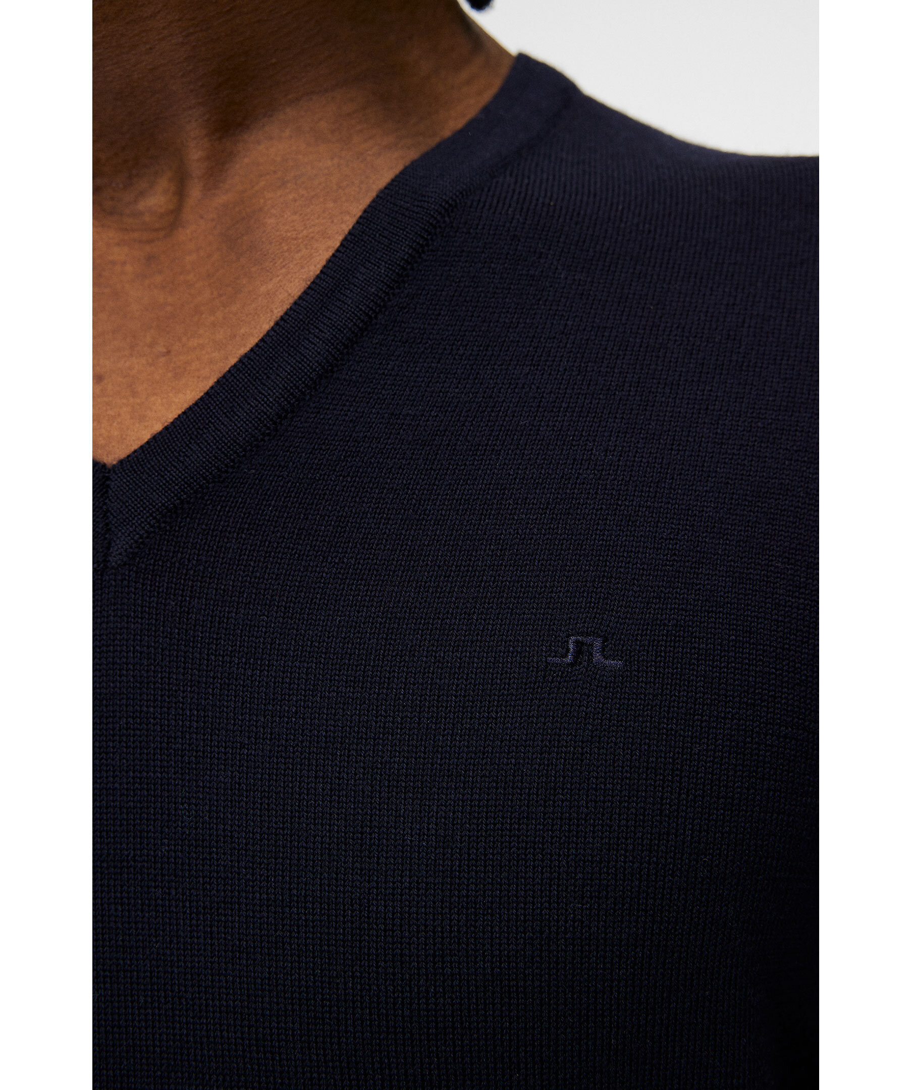 Marinblå, finstickad tröja från J Lindeberg. Tröjan har en ribbad v-ringning samt ribbade muddar vid ärm- och plaggslut. Liten logotyp på bröstet. Tillverkad i merinoull.