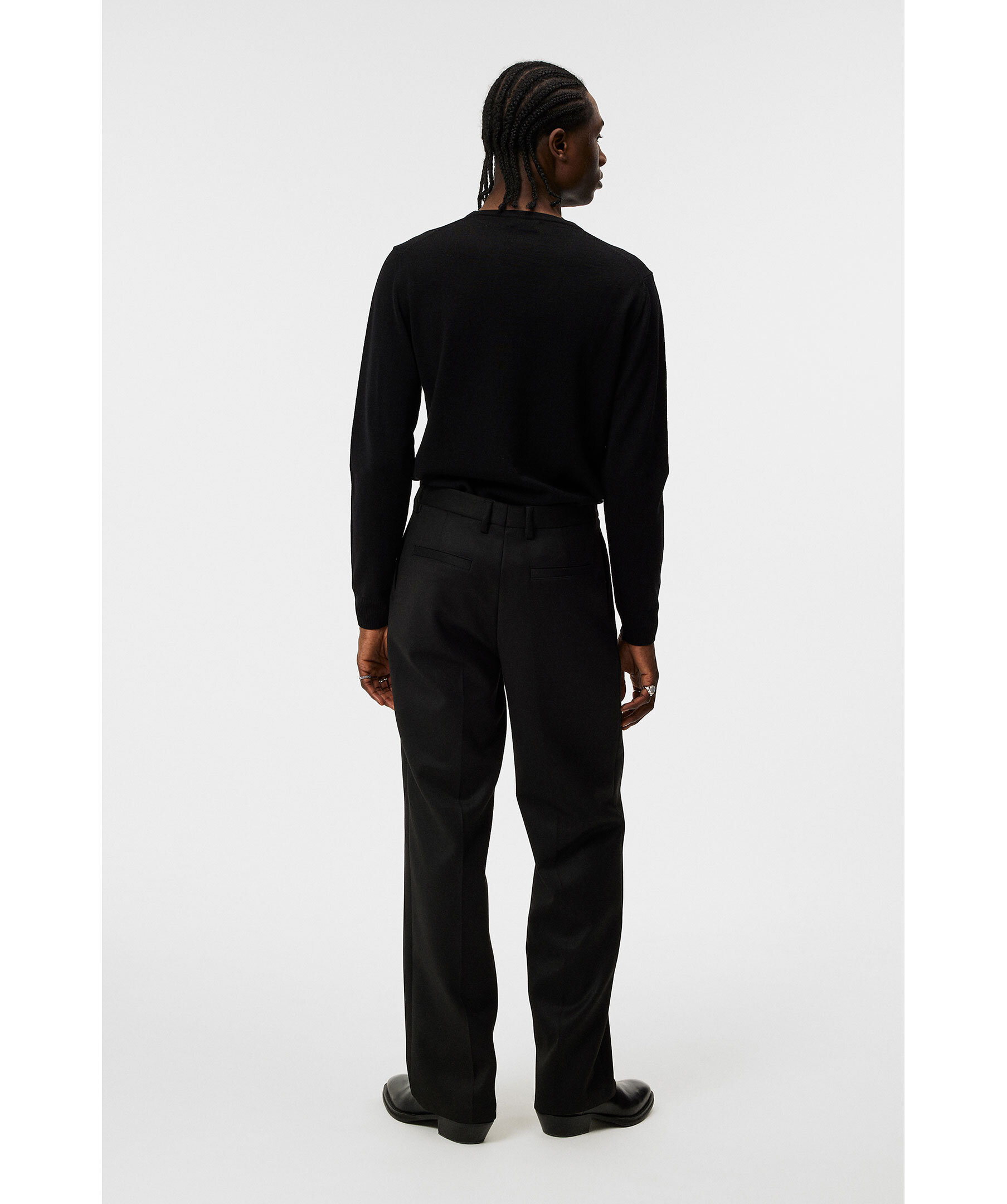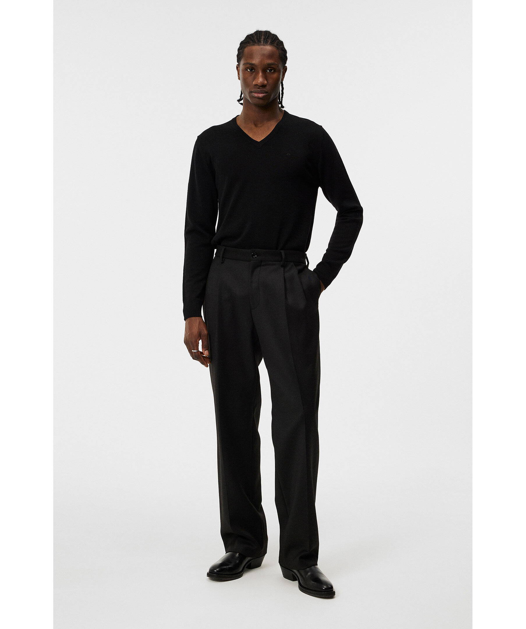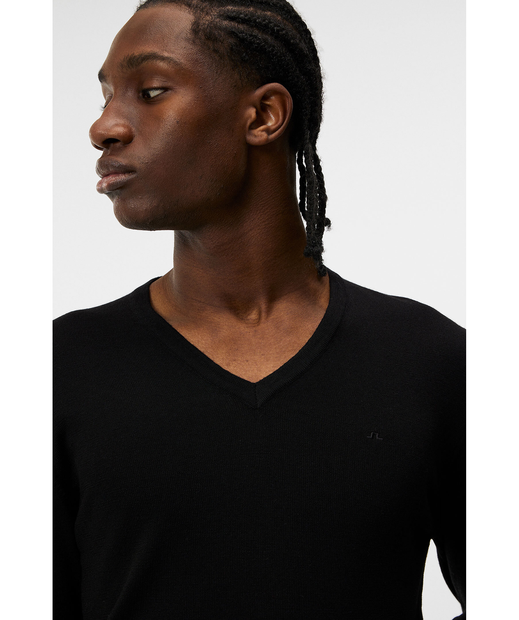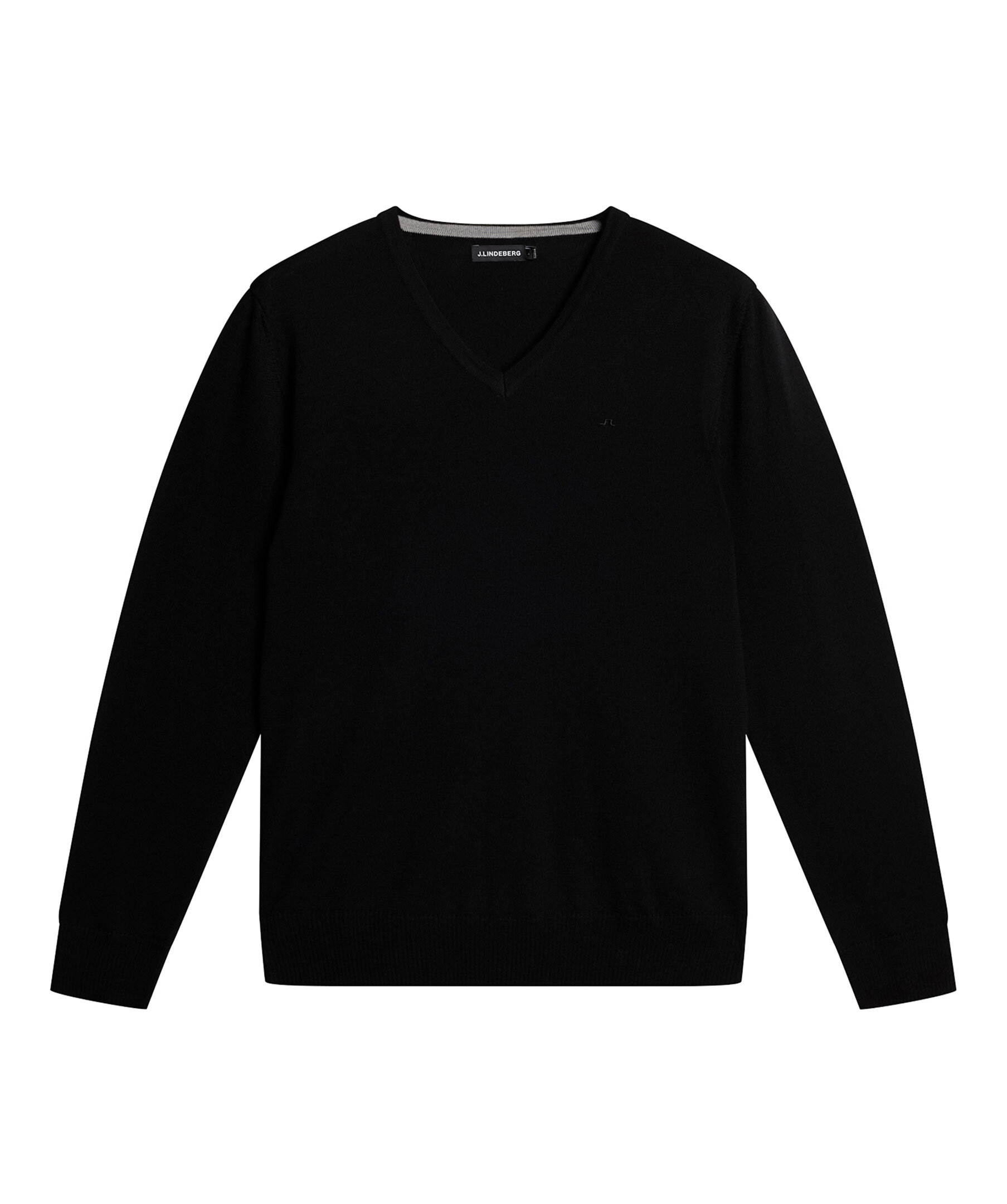 Svart, finstickad tröja från J Lindeberg. Tröjan har en ribbad v-ringning samt ribbade muddar vid ärm- och plaggslut. Liten logotyp på bröstet. Tillverkad i merinoull.