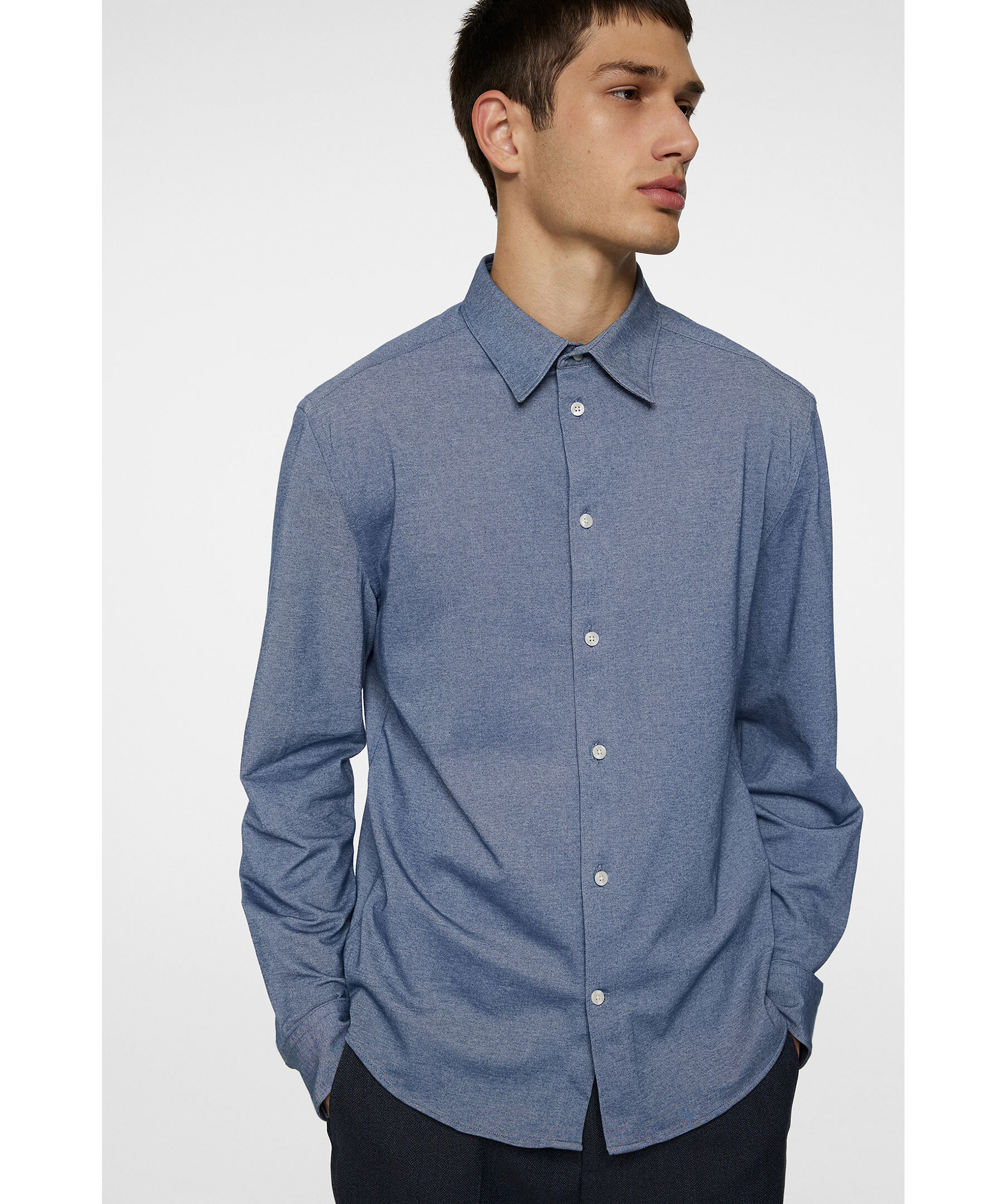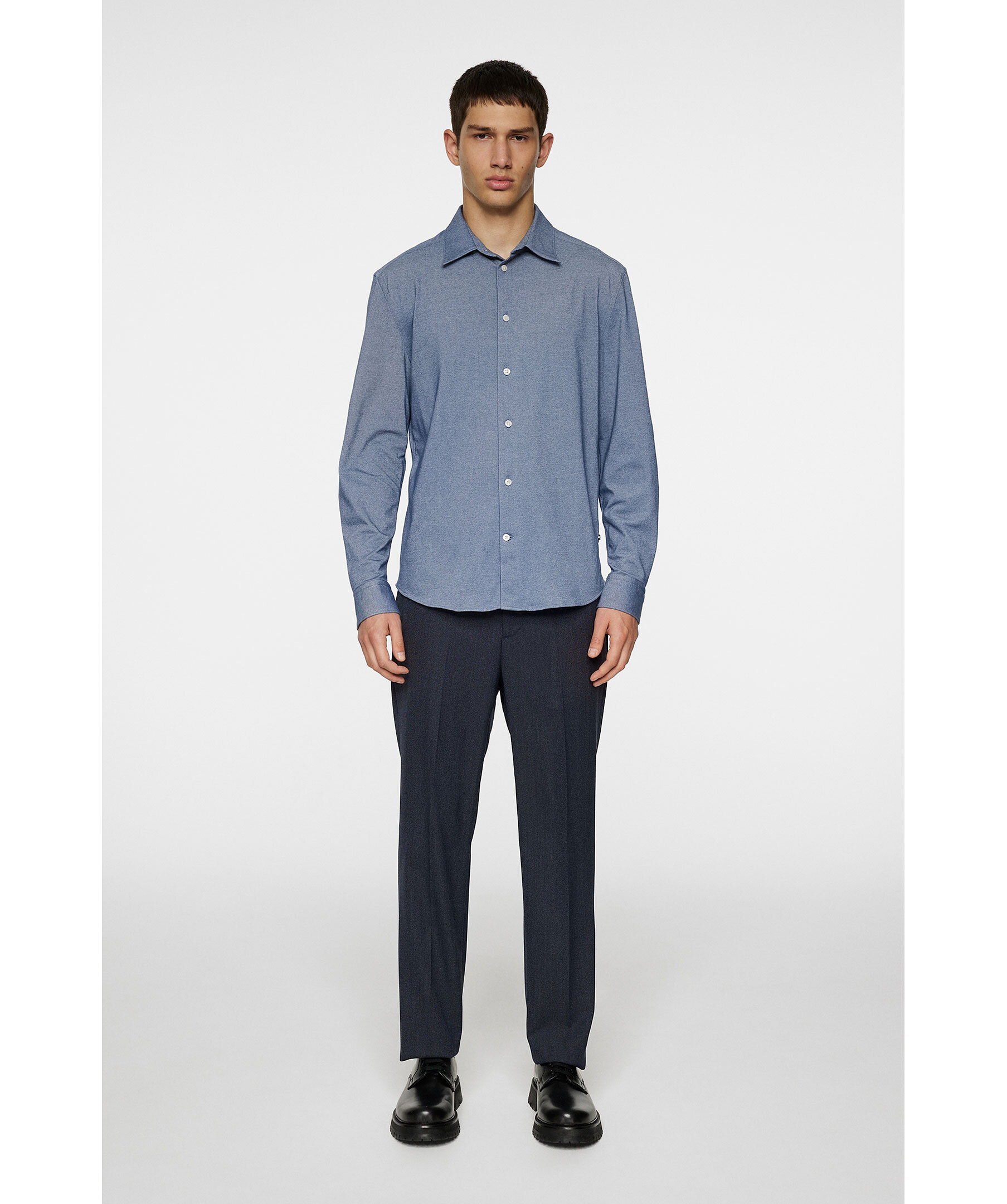 Blå, strukturvävd skjorta från J.Lindeberg. Skjortan blandar sömlöst traditionell design med modern komfort och har en klassisk krage med elegant fransk knappslå som ger ett tidlöst intryck. Den är designad i slimmad passform som följer kroppen och skapar en skarp siluett.