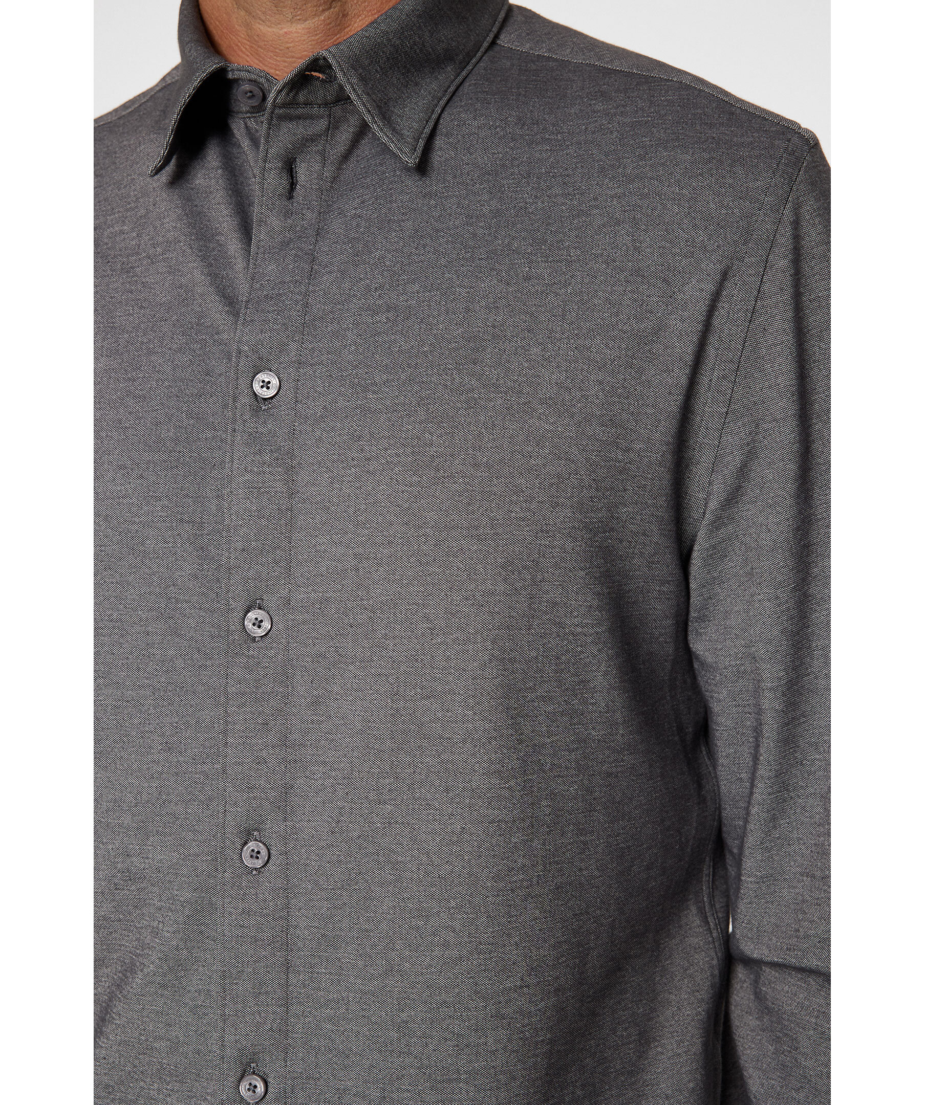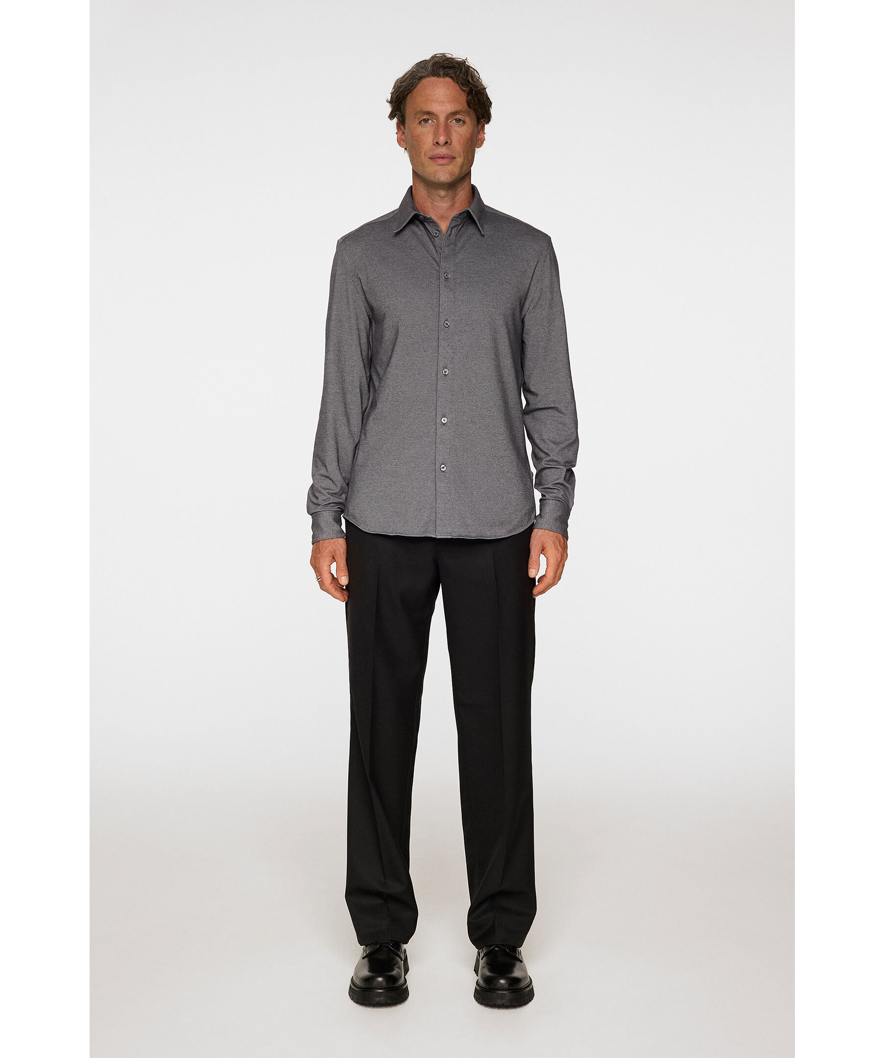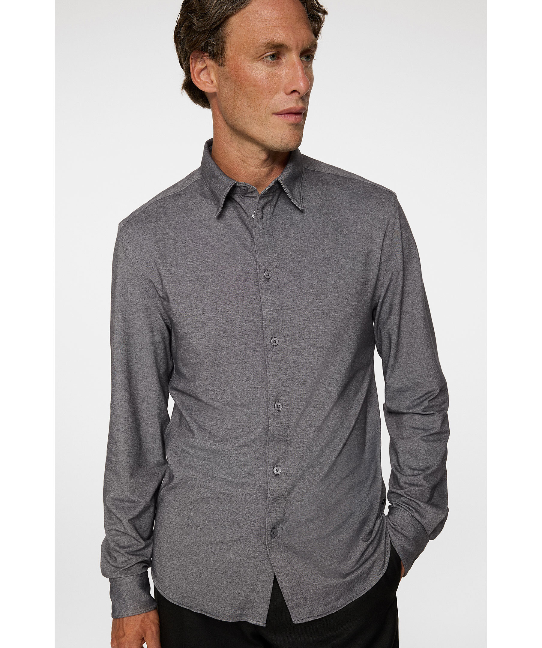 Grå, strukturvävd skjorta från J.Lindeberg. Skjortan blandar sömlöst traditionell design med modern komfort och har en klassisk krage med elegant fransk knappslå som ger ett tidlöst intryck. Den är designad i slimmad passform som följer kroppen och skapar en skarp siluett.