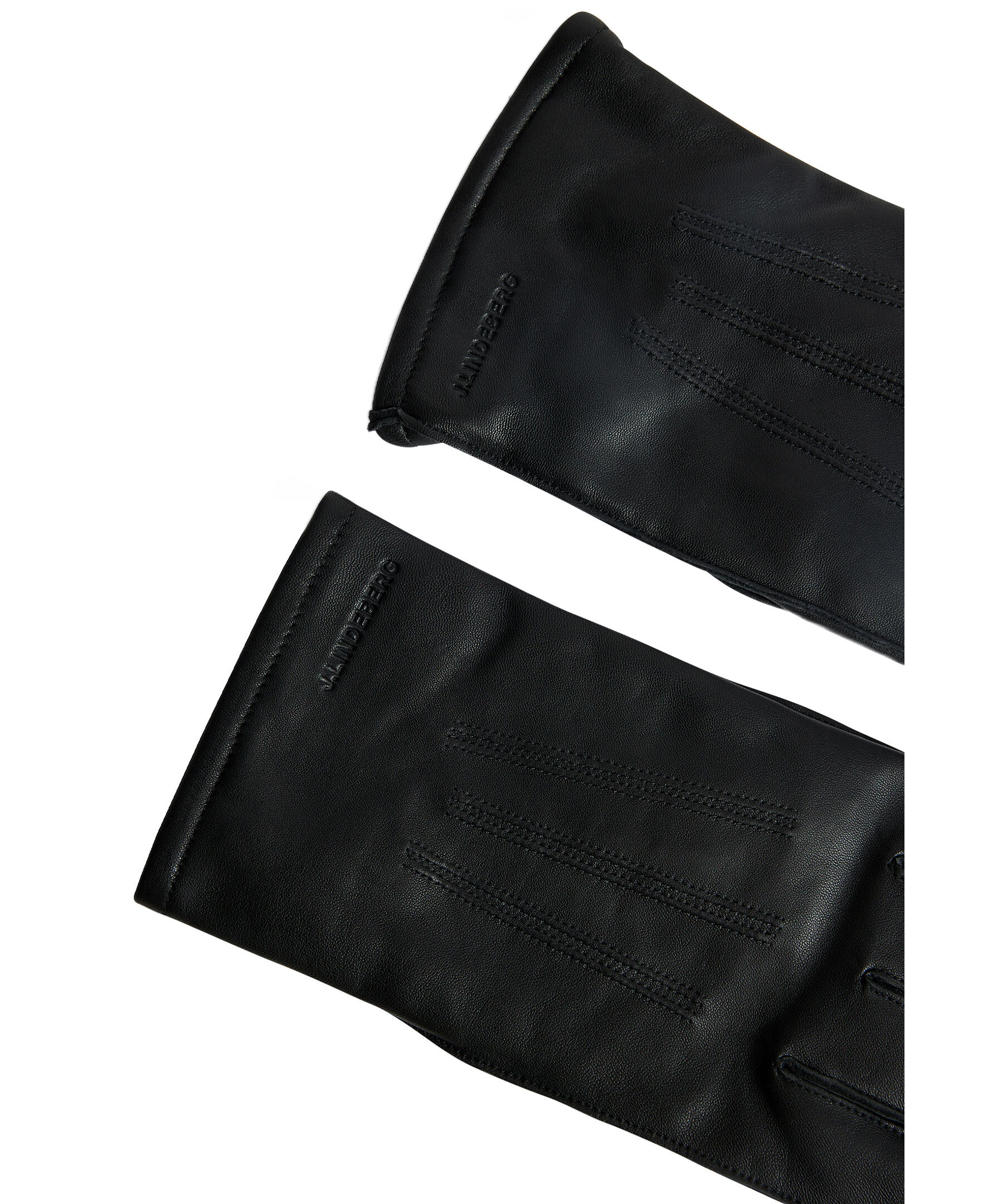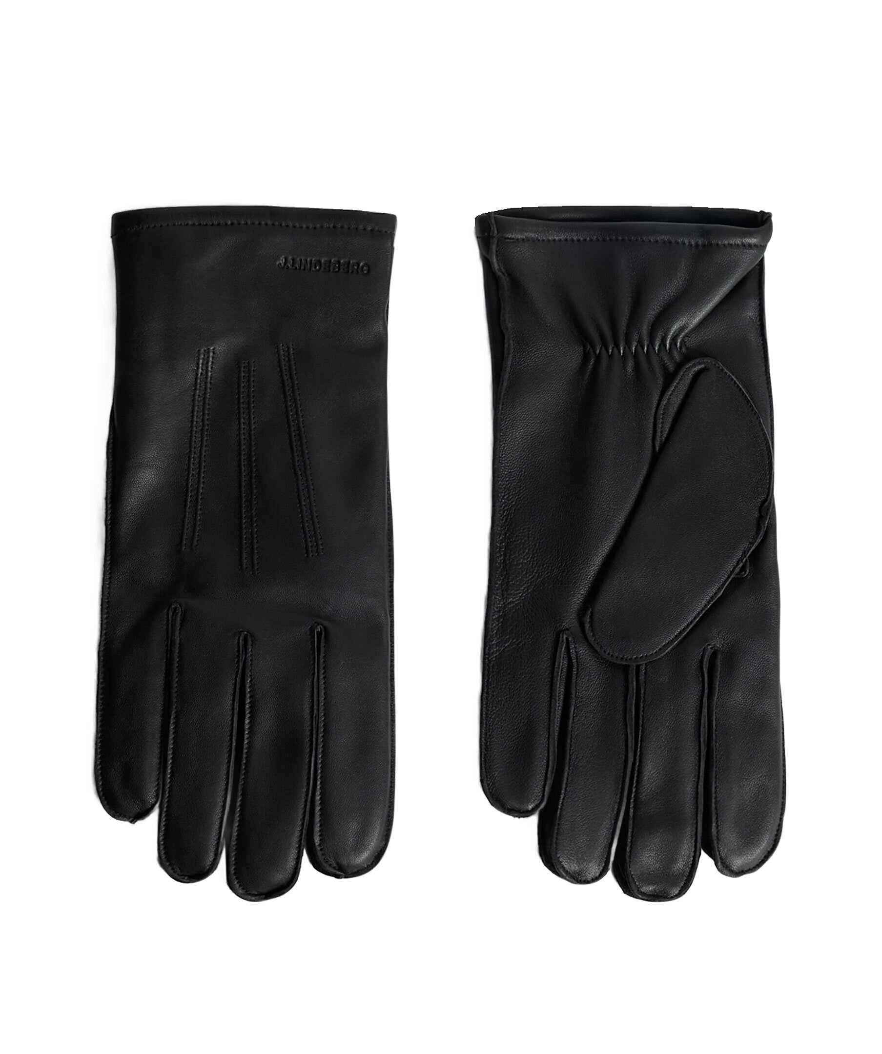 Svarta läderhandskar från J.Lindeberg. Handskarna har tillverkats i premiumfårskinn med en subtil, präglad logotyp vid öppningen och elastiska sömmar på vristen som säkerställer att de sitter bra.