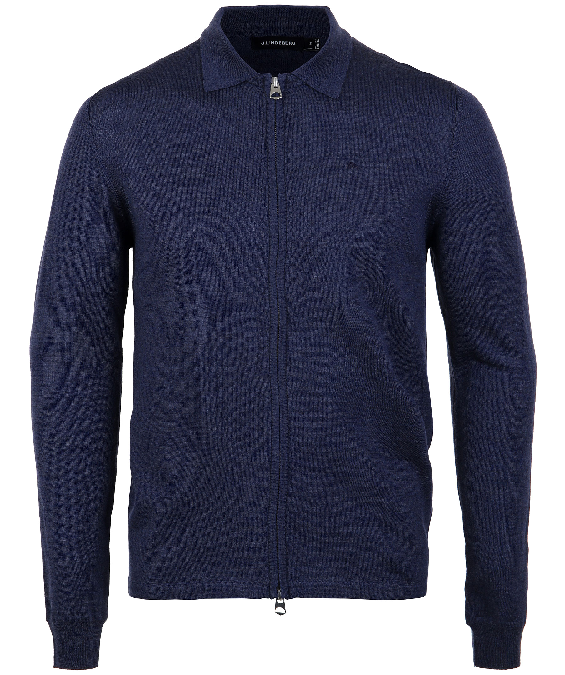 Marinblå finstickad tröja med dragkedja från J.Lindeberg. Gjord i mjukt merinoull, klassisk krage och broderad logotyp.
