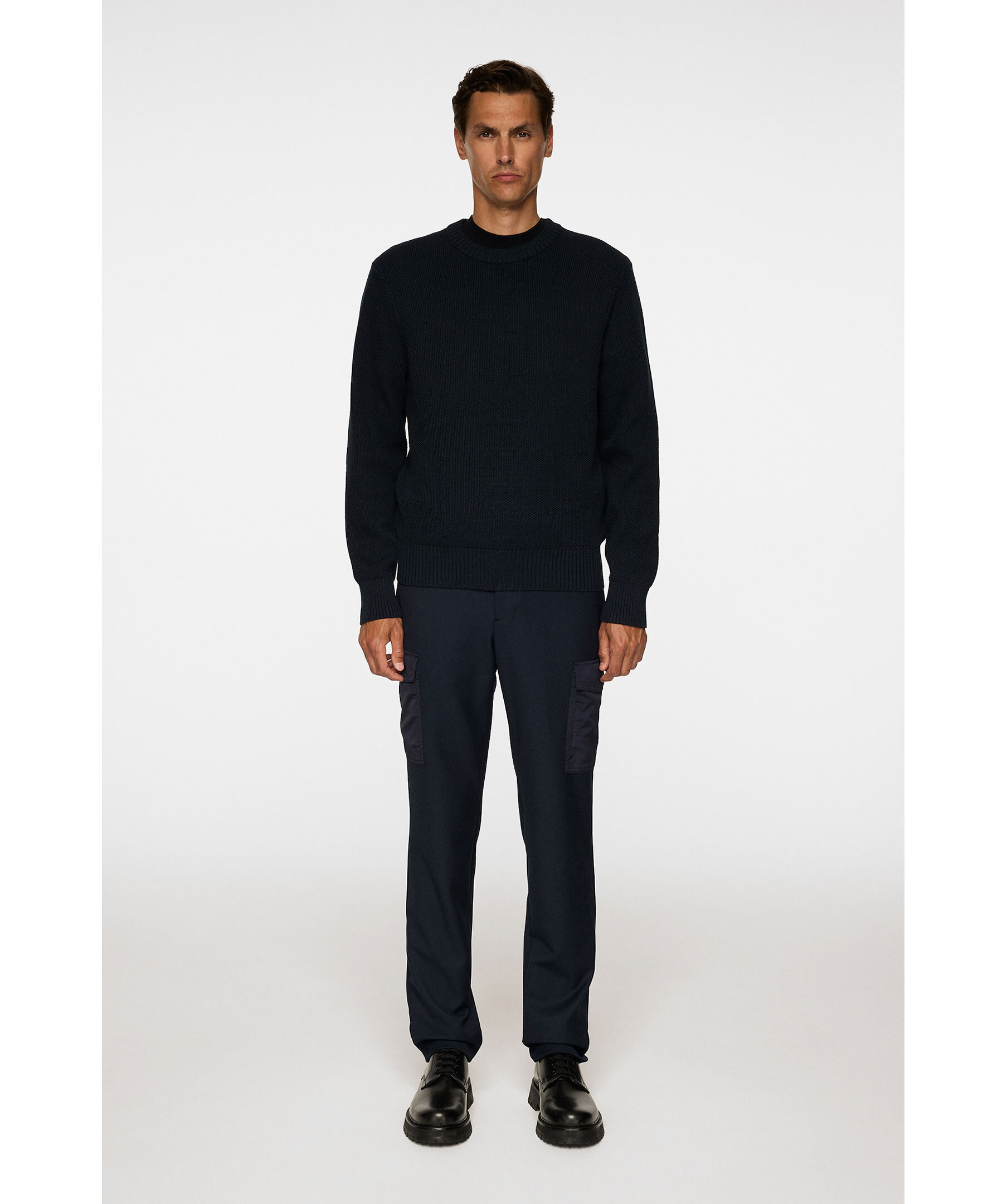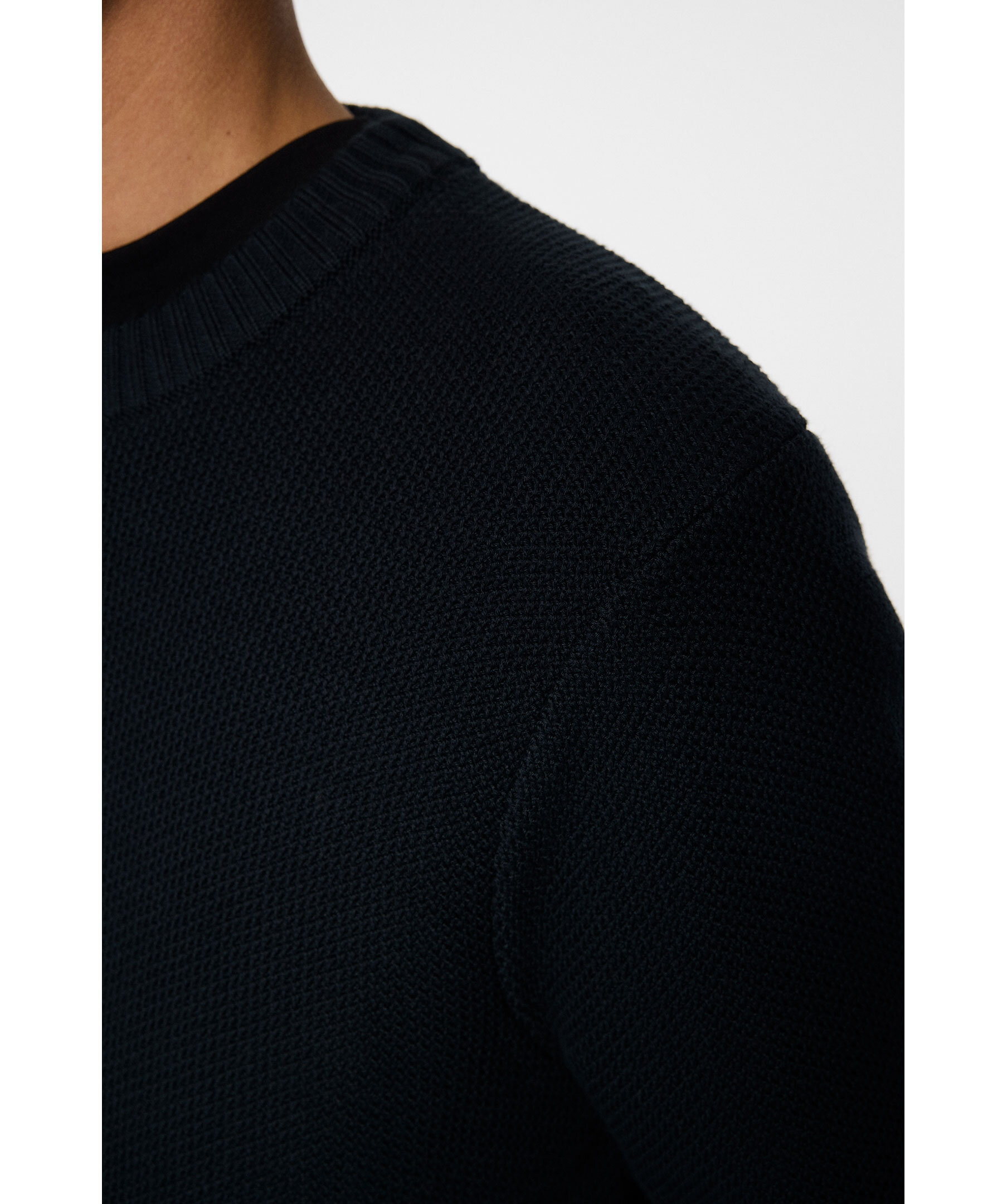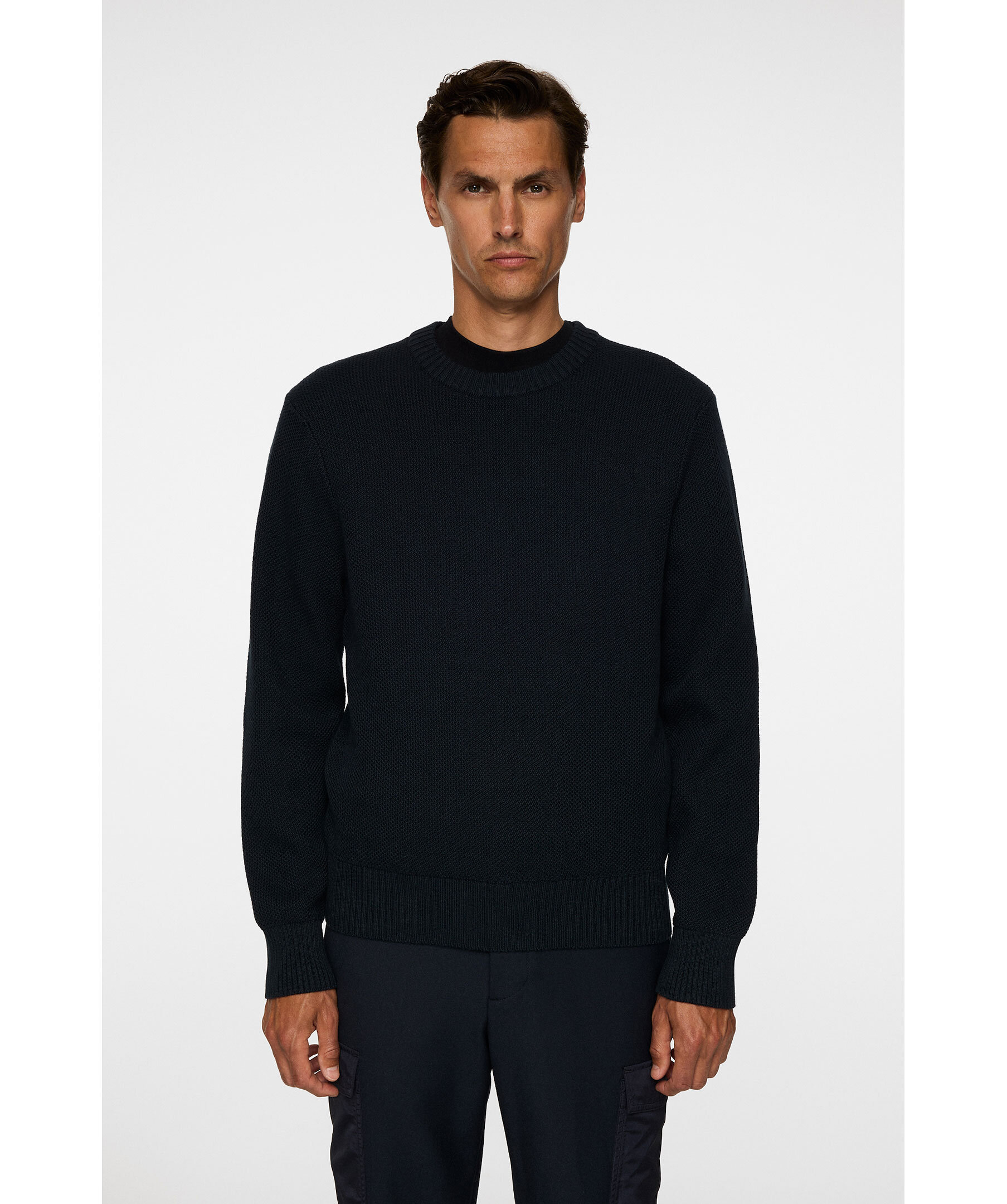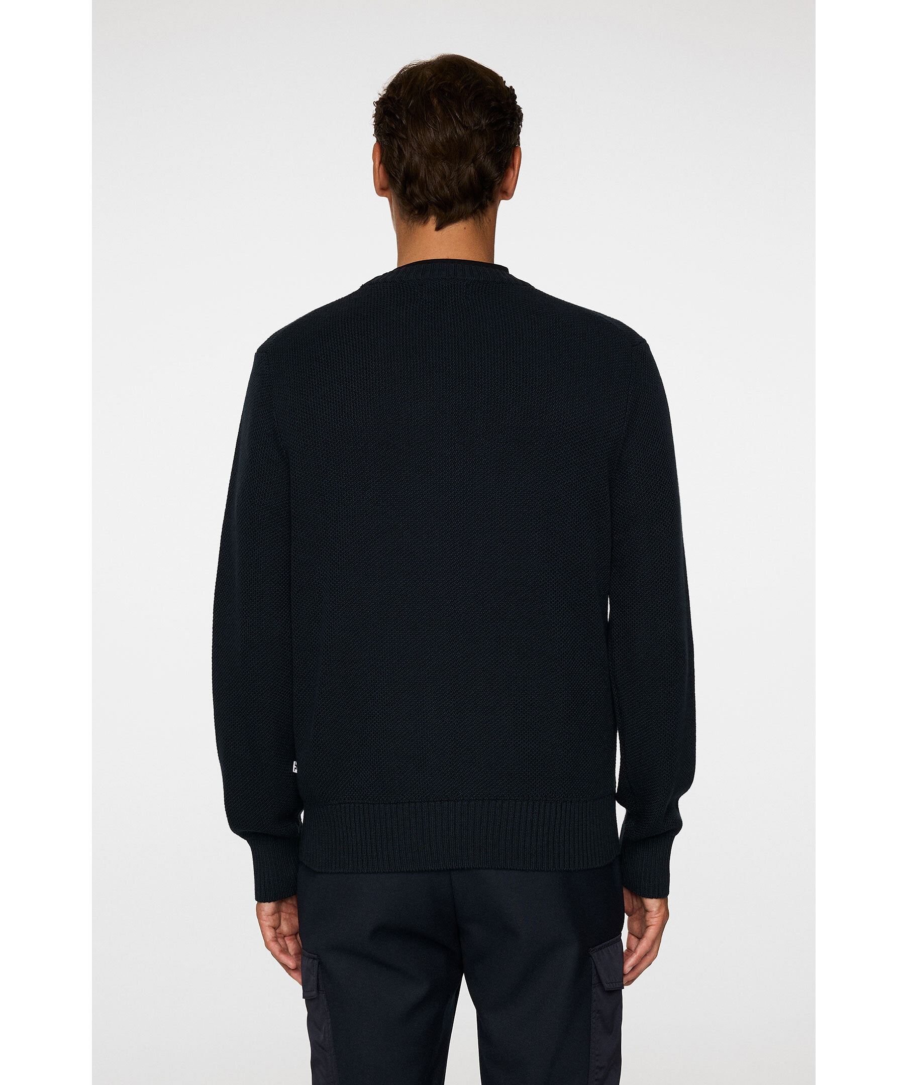 Marinblå strukturstickad tröja från J.Lindeberg. Tröjan är tillverkad i 100% bomull och har ribbade muddar.