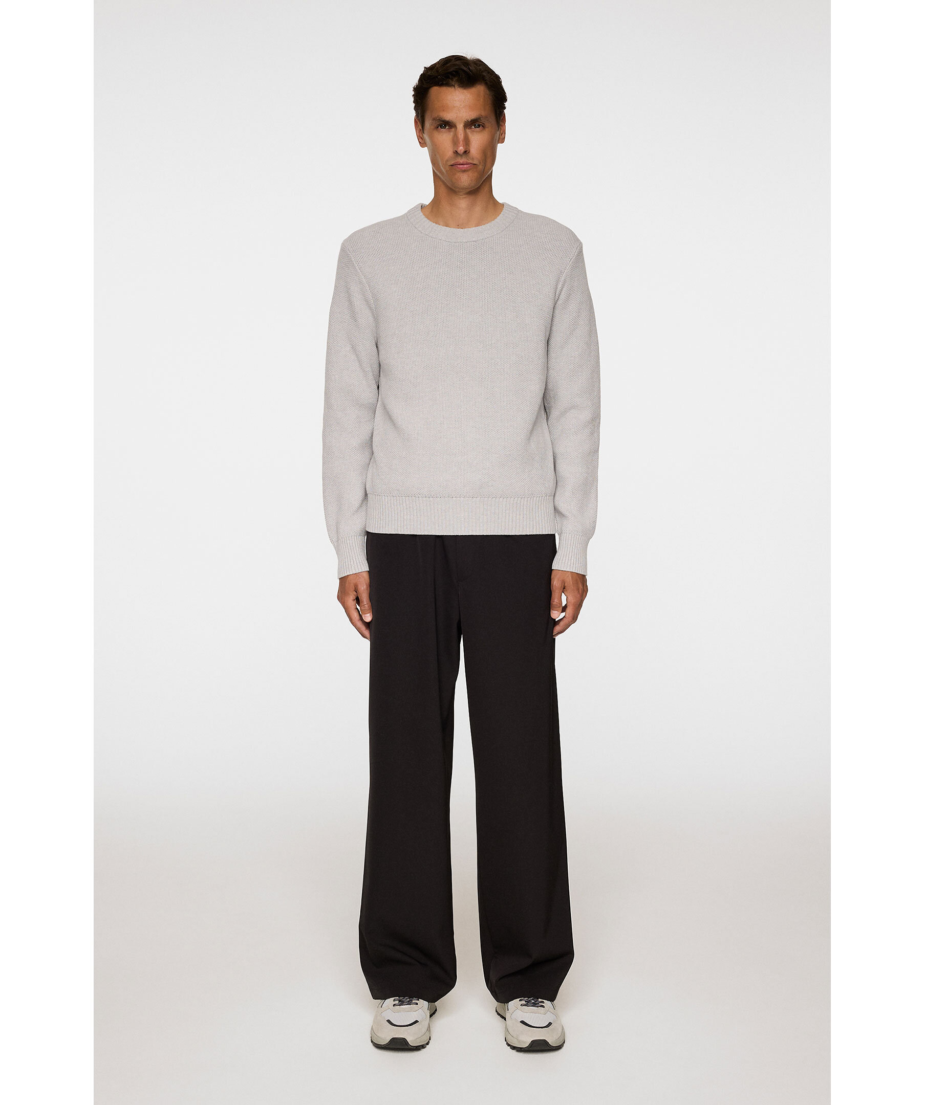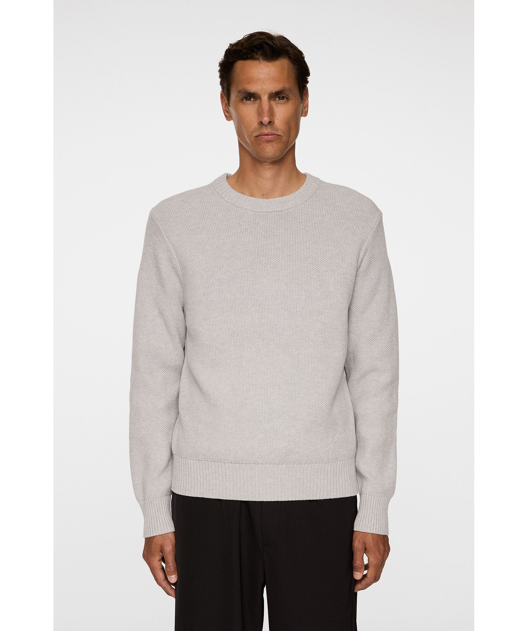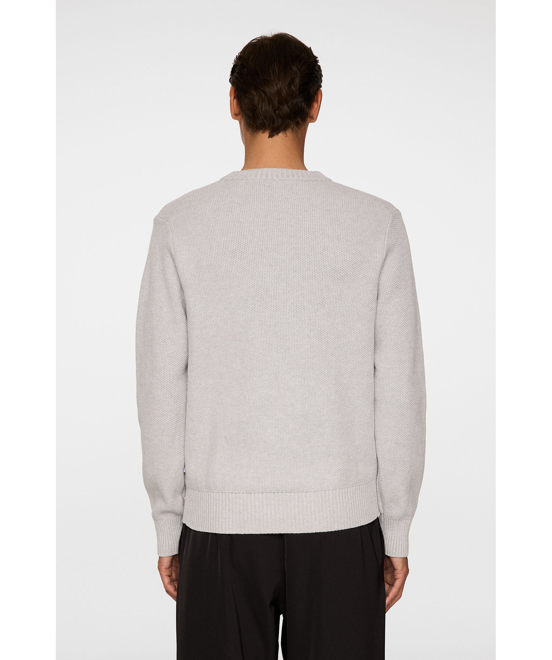 Ljusgrå strukturstickad tröja från J.Lindeberg. Tröjan är tillverkad i 100% bomull och har ribbade muddar.