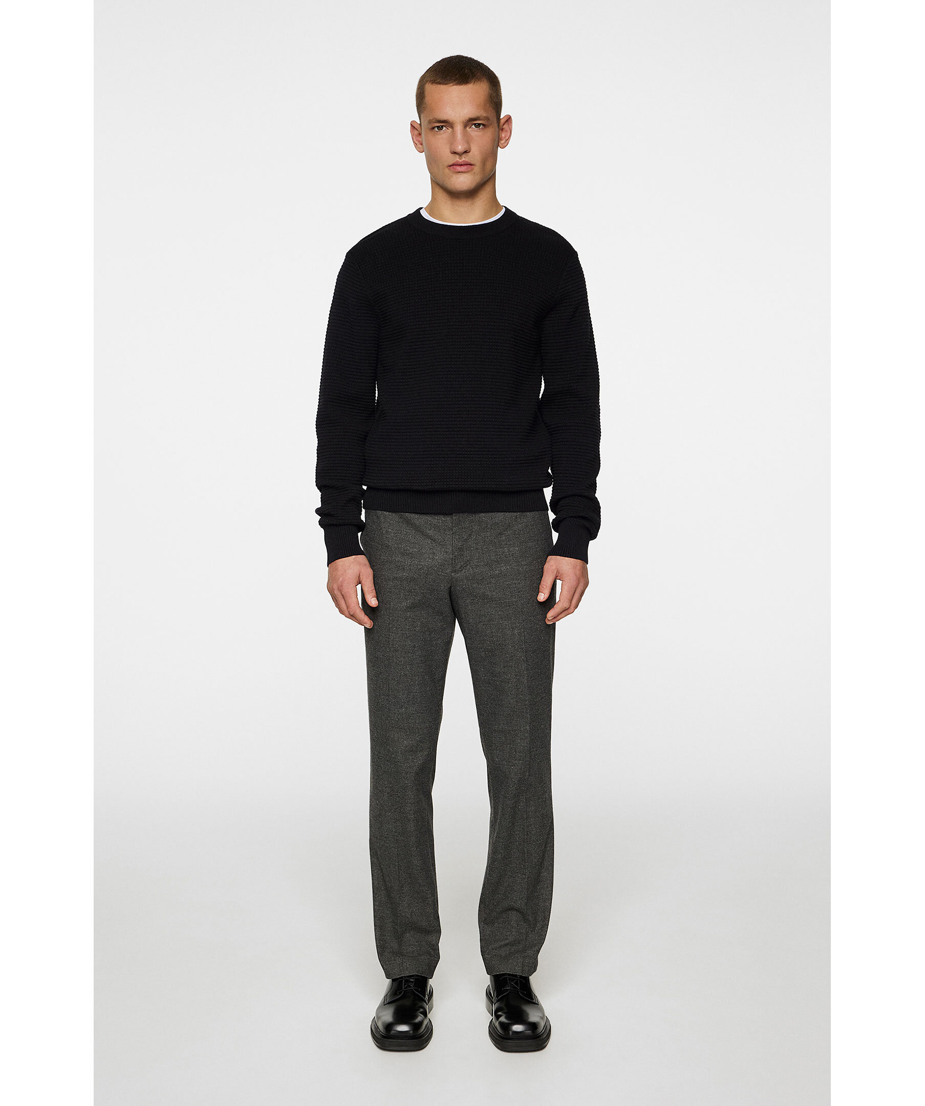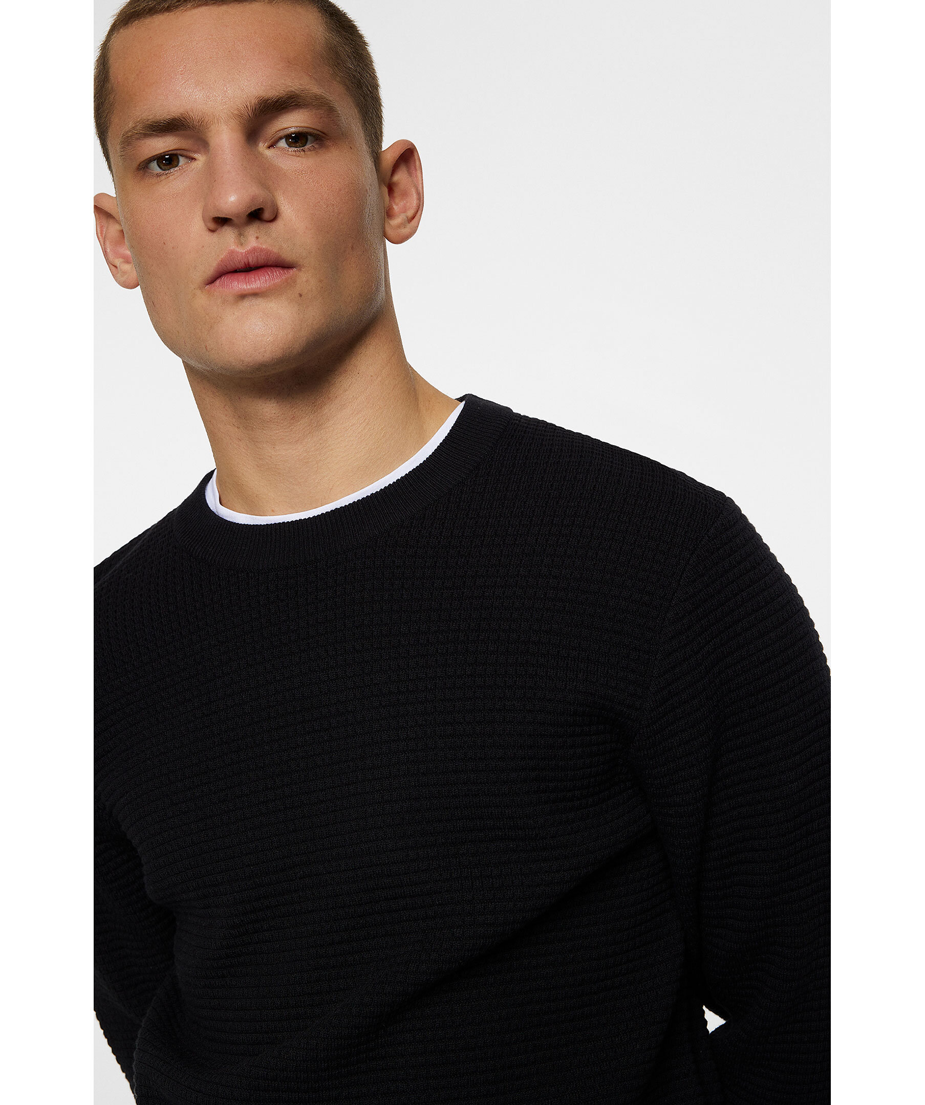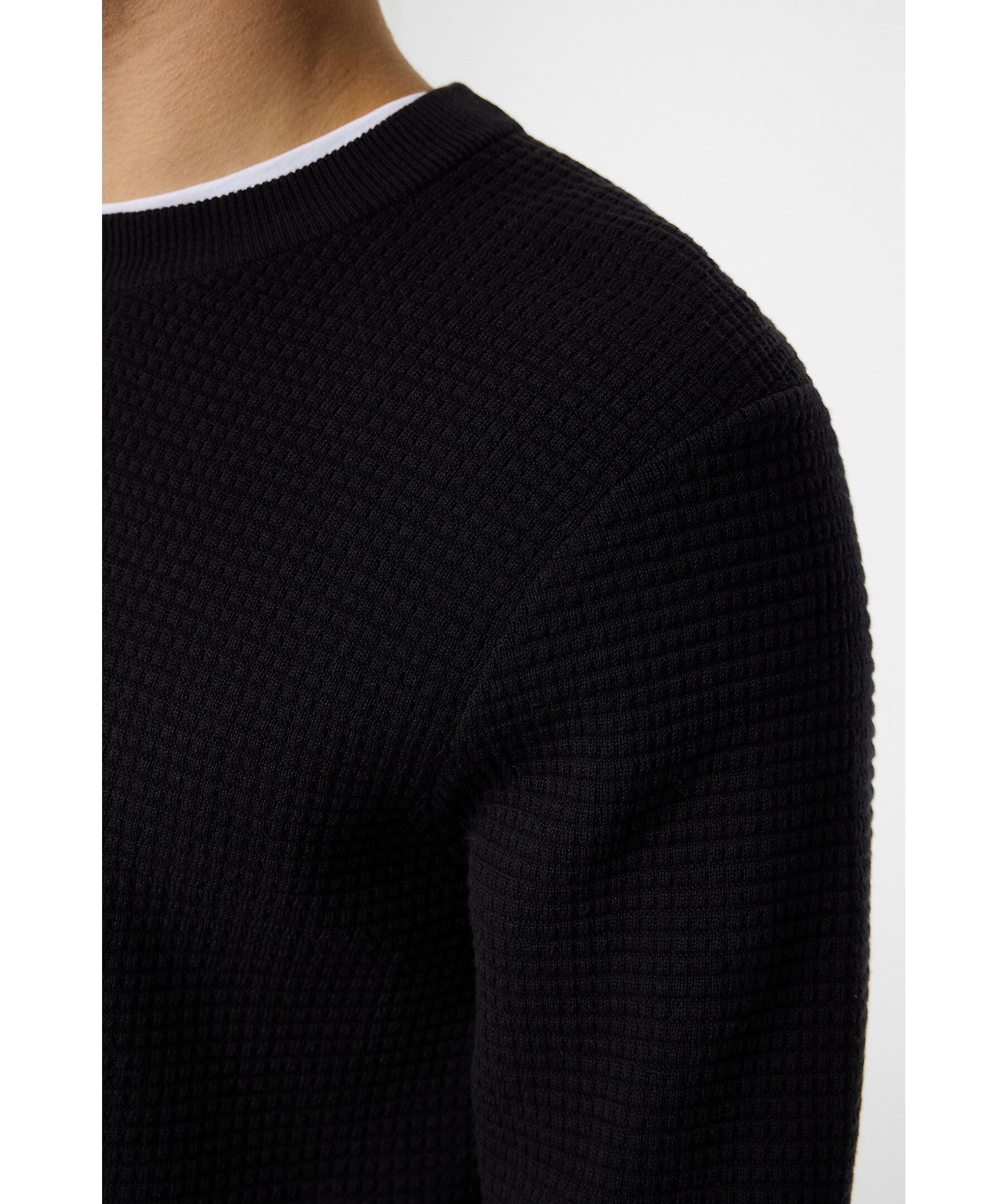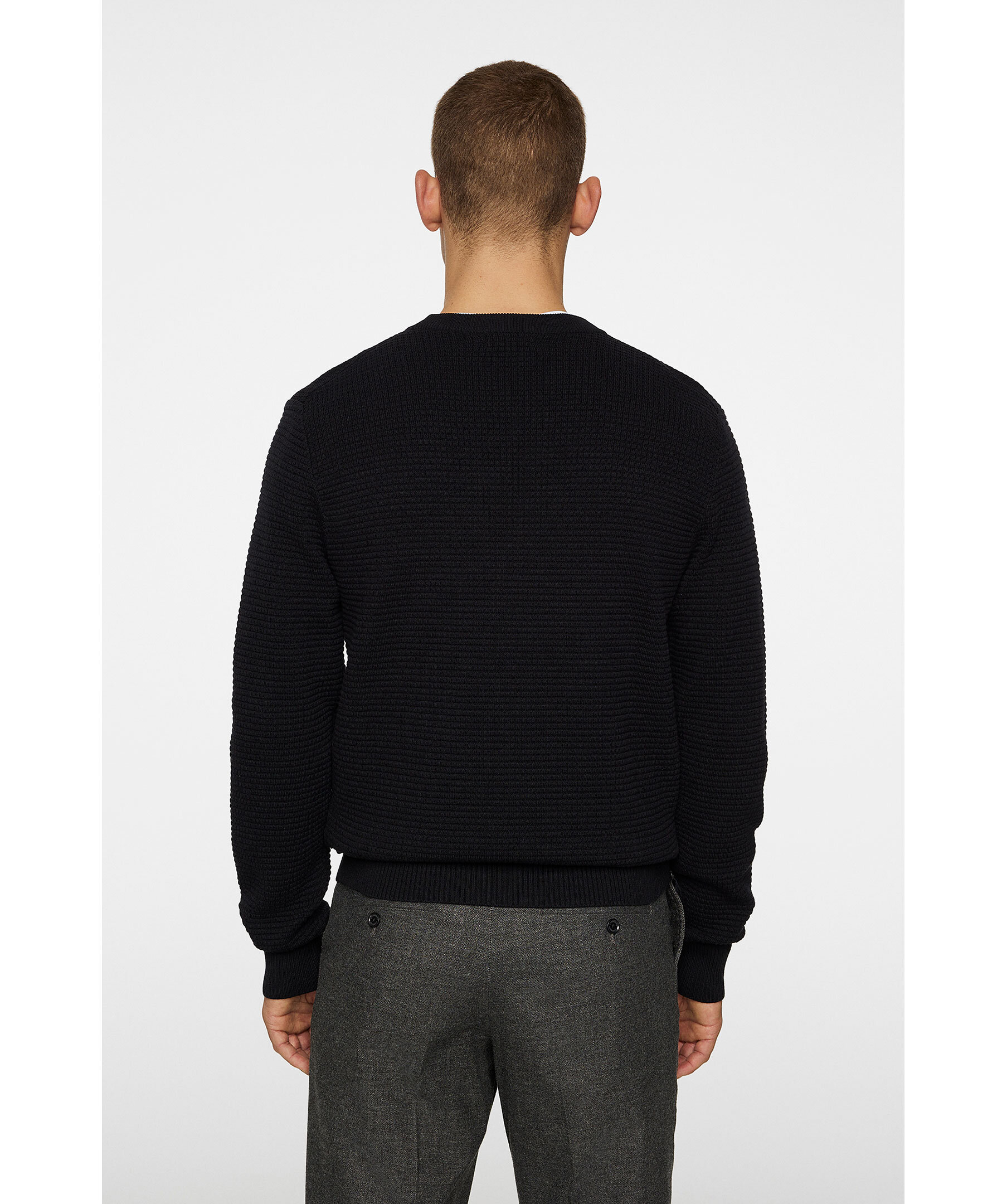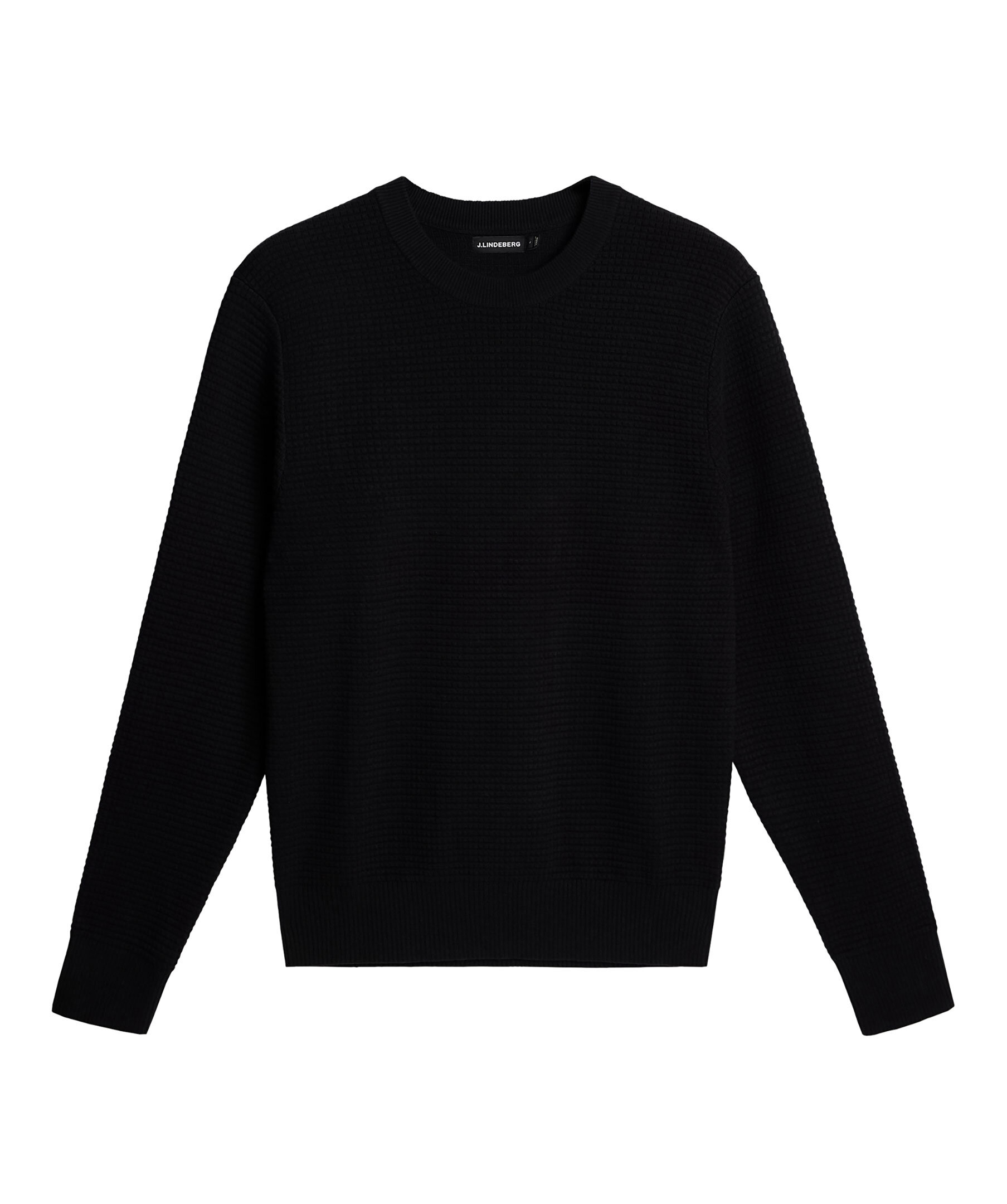 Svart tröja från J.Lindeberg. Den strukturstickade tröjan har ribbstickade muddar och avslut och rundad halsringning. Tillverkad av 100% bomull.