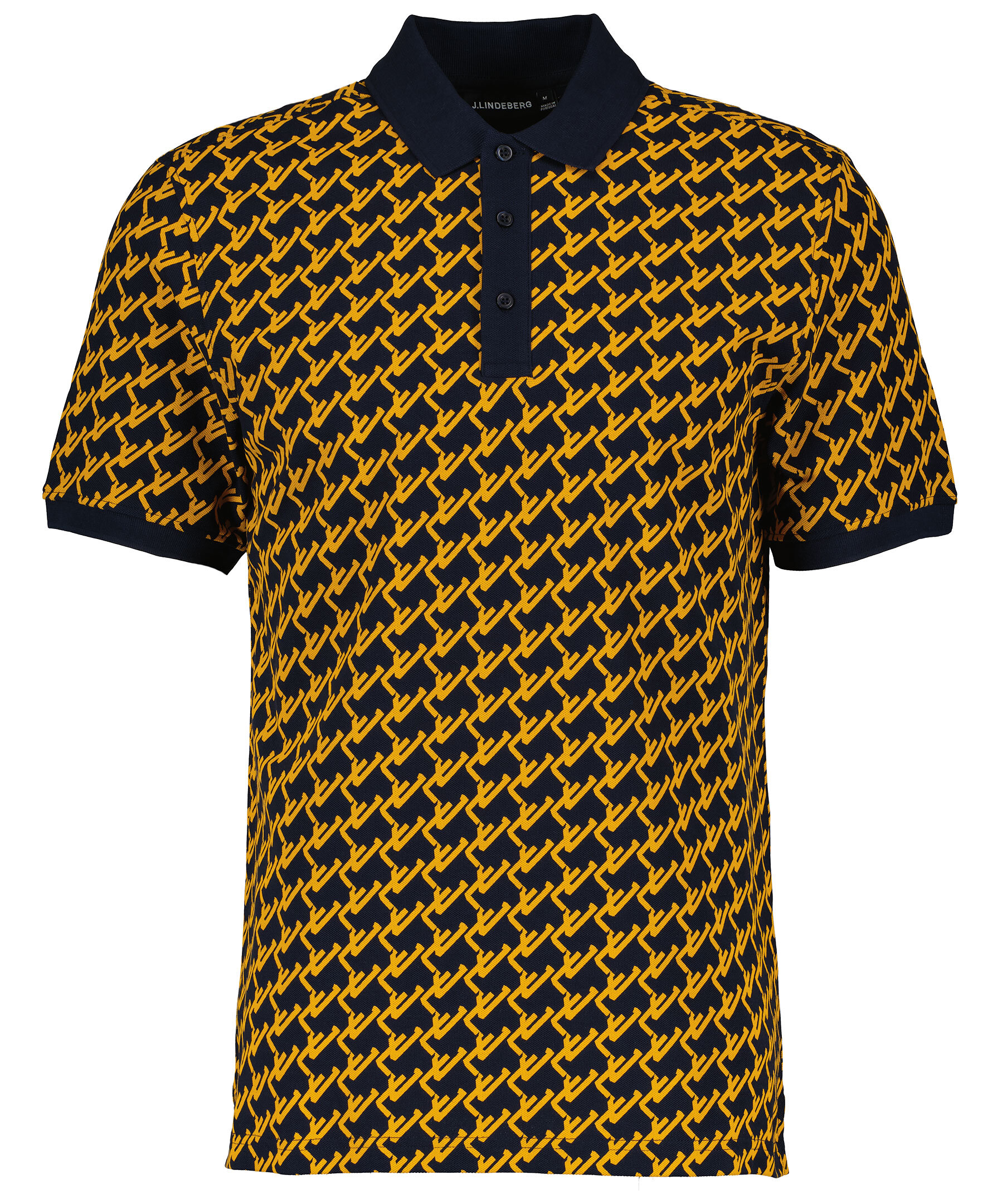 Mörkblå och gul mönstrad piké från J Lindeberg. normal passform. Tillverkad i bomull.