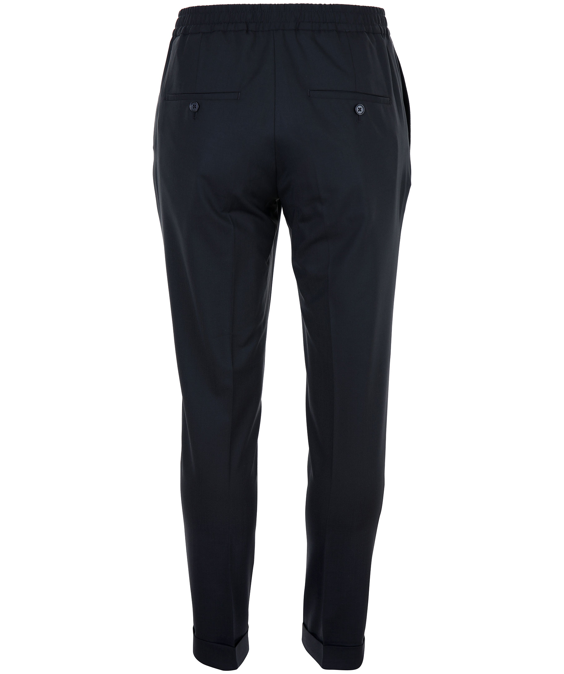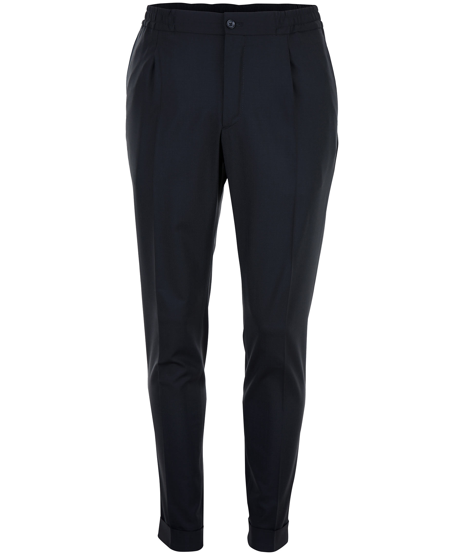 Svarta kostymbyxor i en lösare modell från J-Lindeberg. Tillverkade i polyester och ullblandning. Resår i ryggen och på sidorna och knapp och dragkedja fram. Två snedställda fickor fram samt två bakfickor med knapp. Vikta nedtill och pressveck fram och bak.