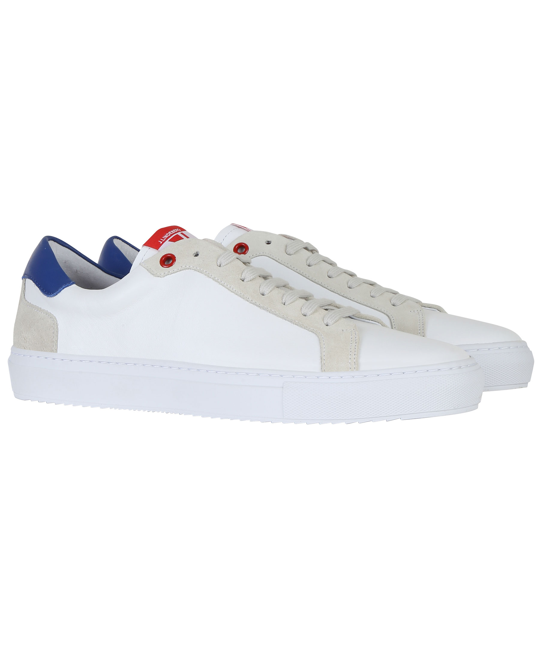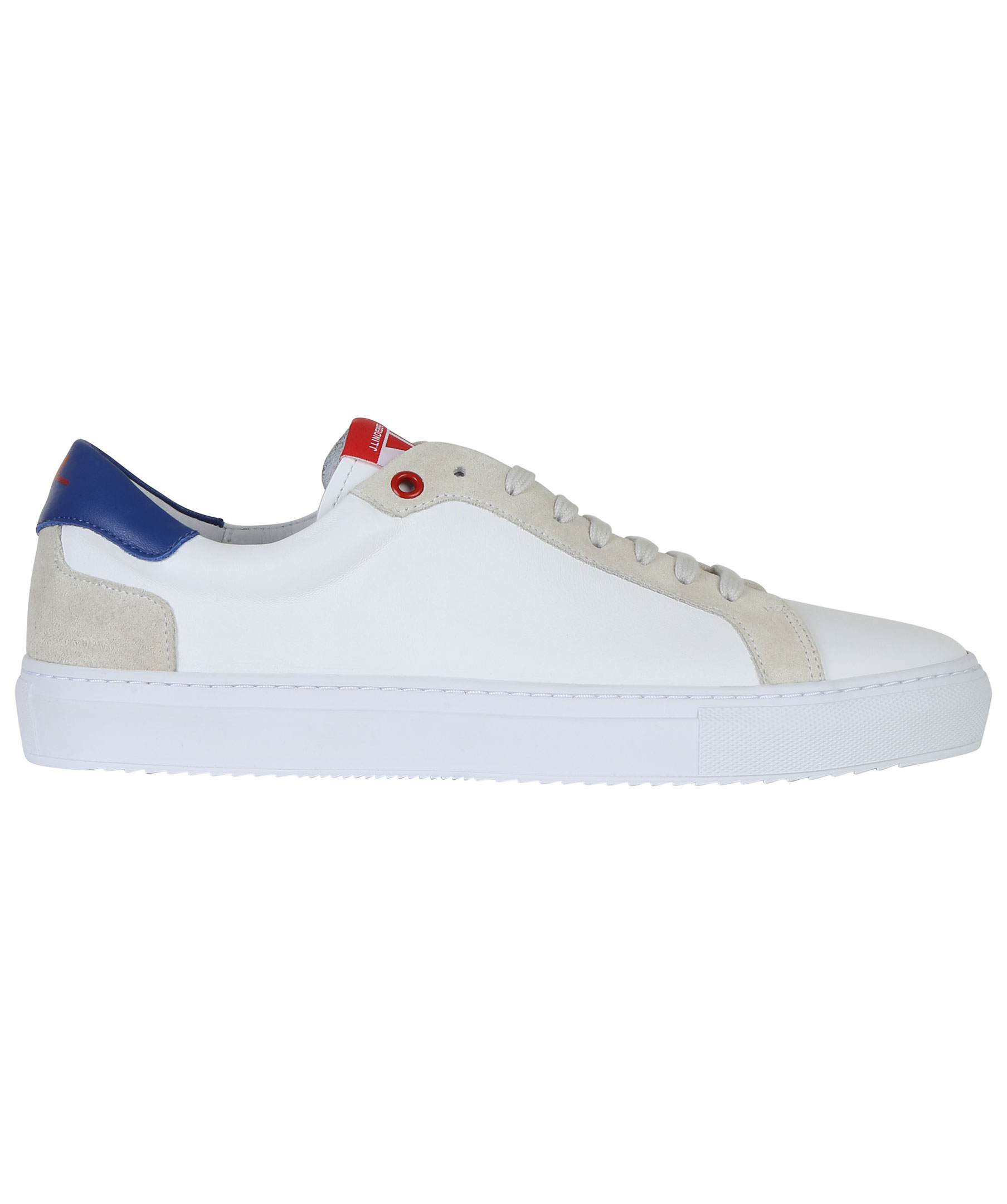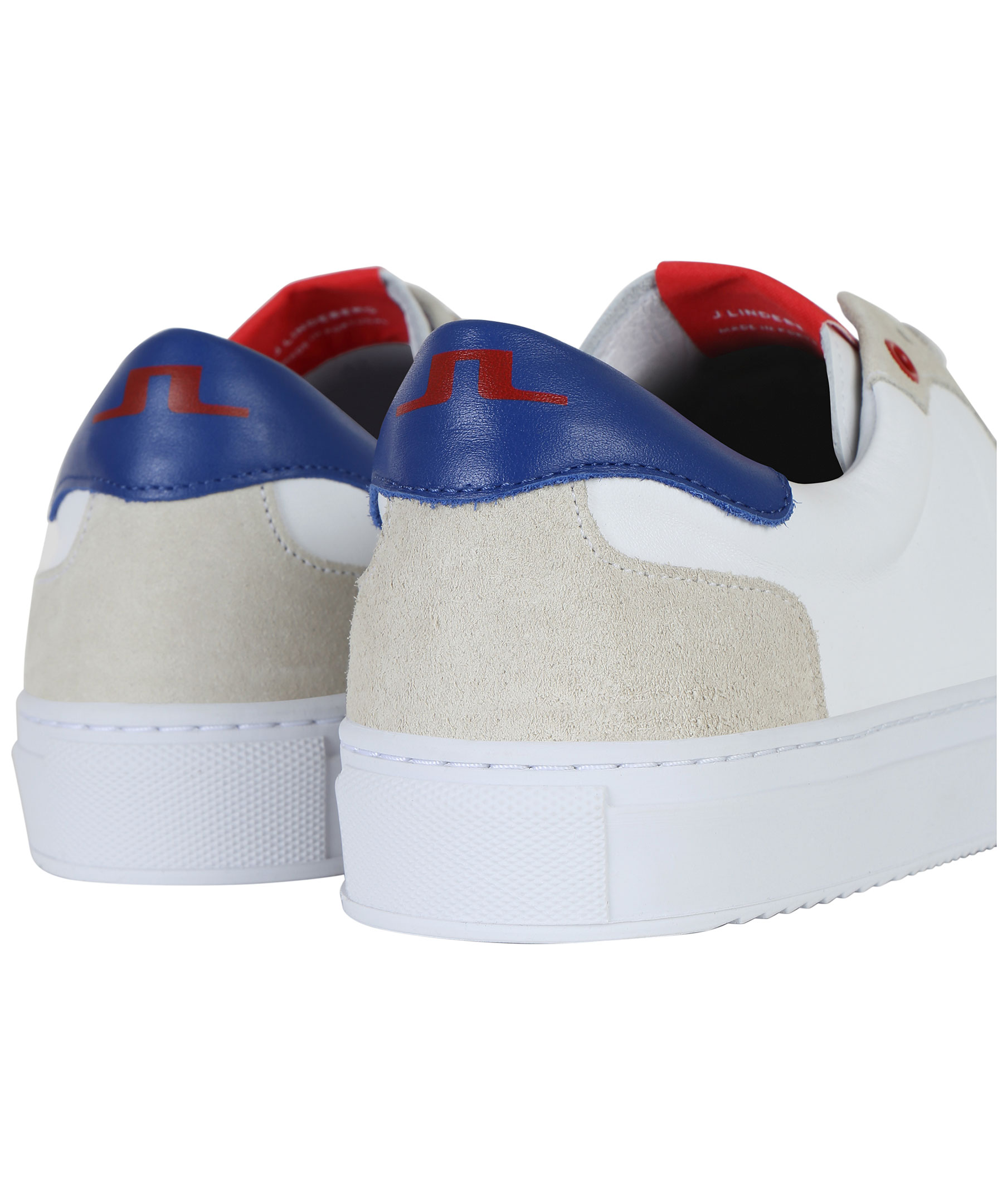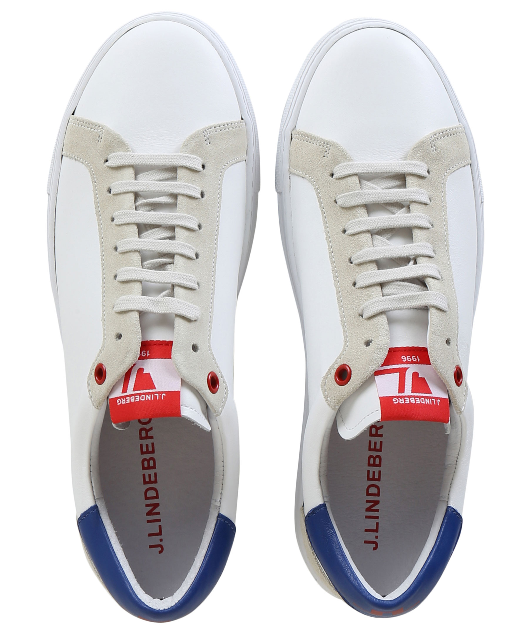 Vita sneakers i Läder från J.Lindeberg. Klassisk textilsnörning, foder och innersula i läder, yttersula i gummi. Kontrastfärgad detalj i mocka vid snörning och häl. Tyg patch med logotyp på plösen samt kontrast färgad logga vid hälen.