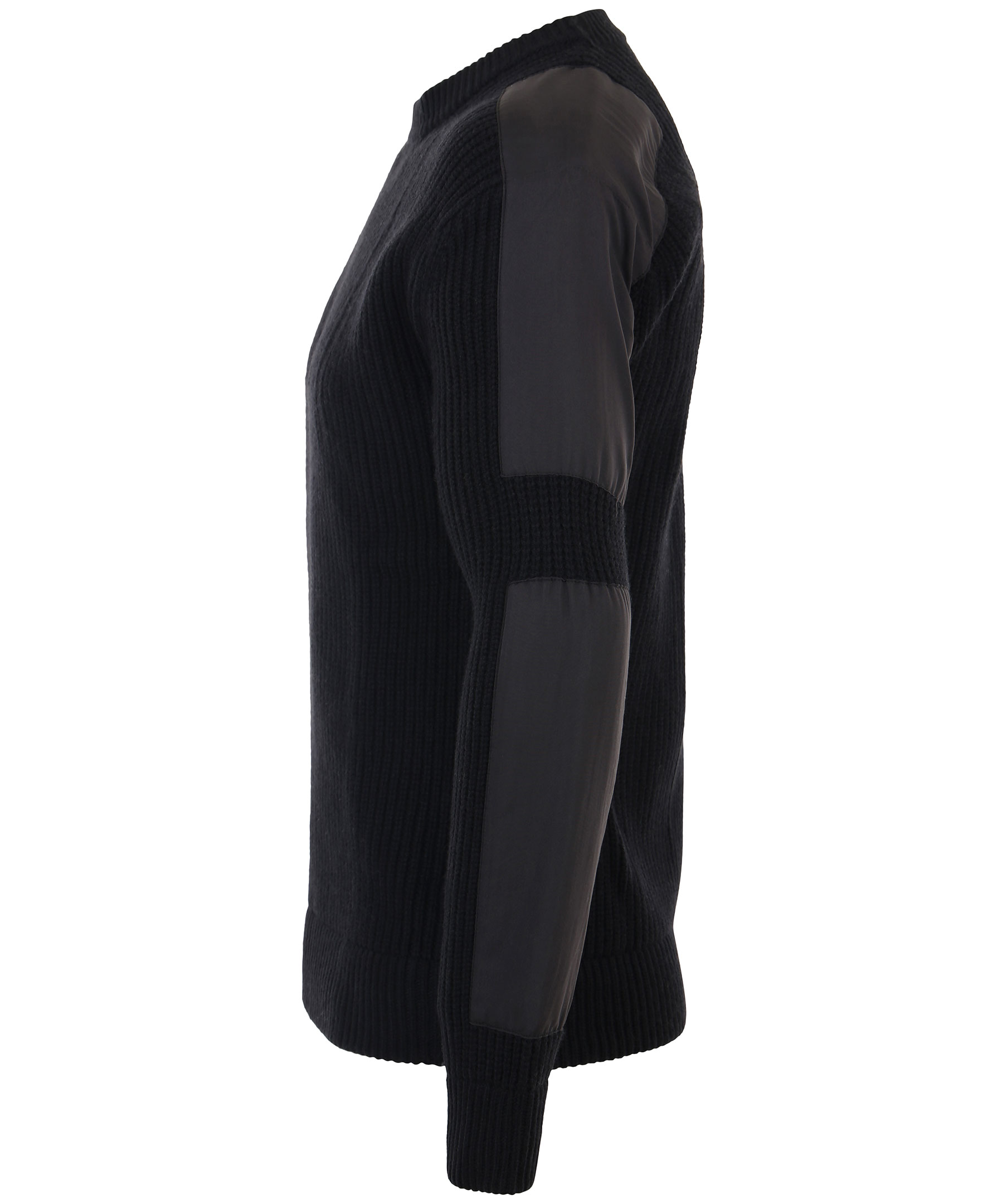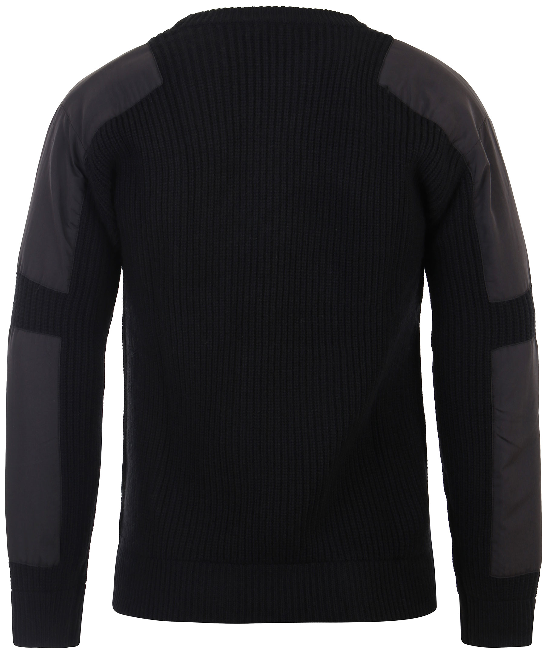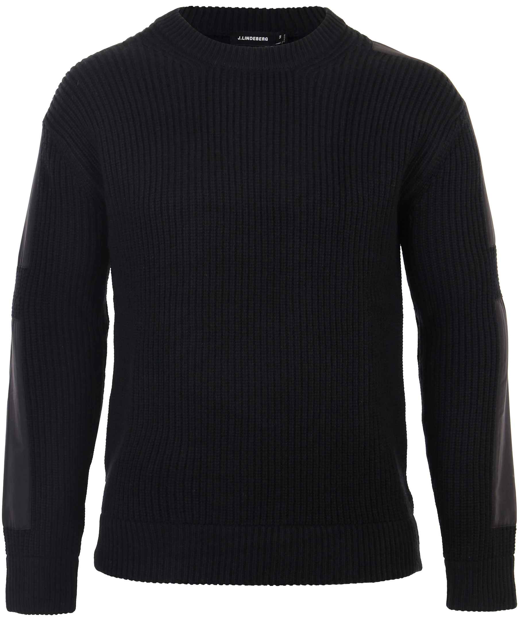 Svart, stickad tröja från J.Lindeberg. Applicerade tygstycken på axlar och ner på armbågarna. Ribbade muddar i den rundade halsringningen, i ärmslut och i plaggslut. Tillverkad i ull och bomullsblandning.