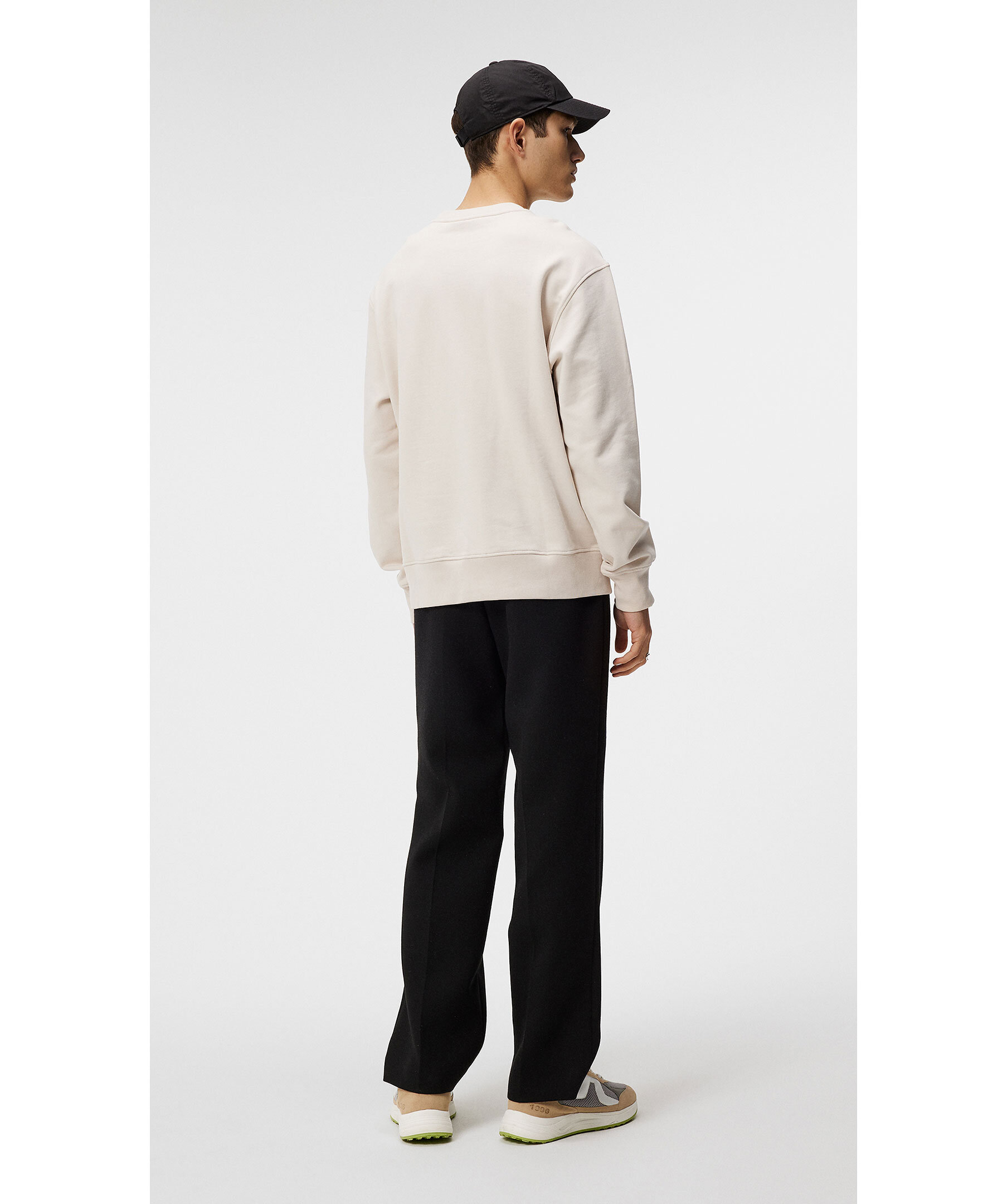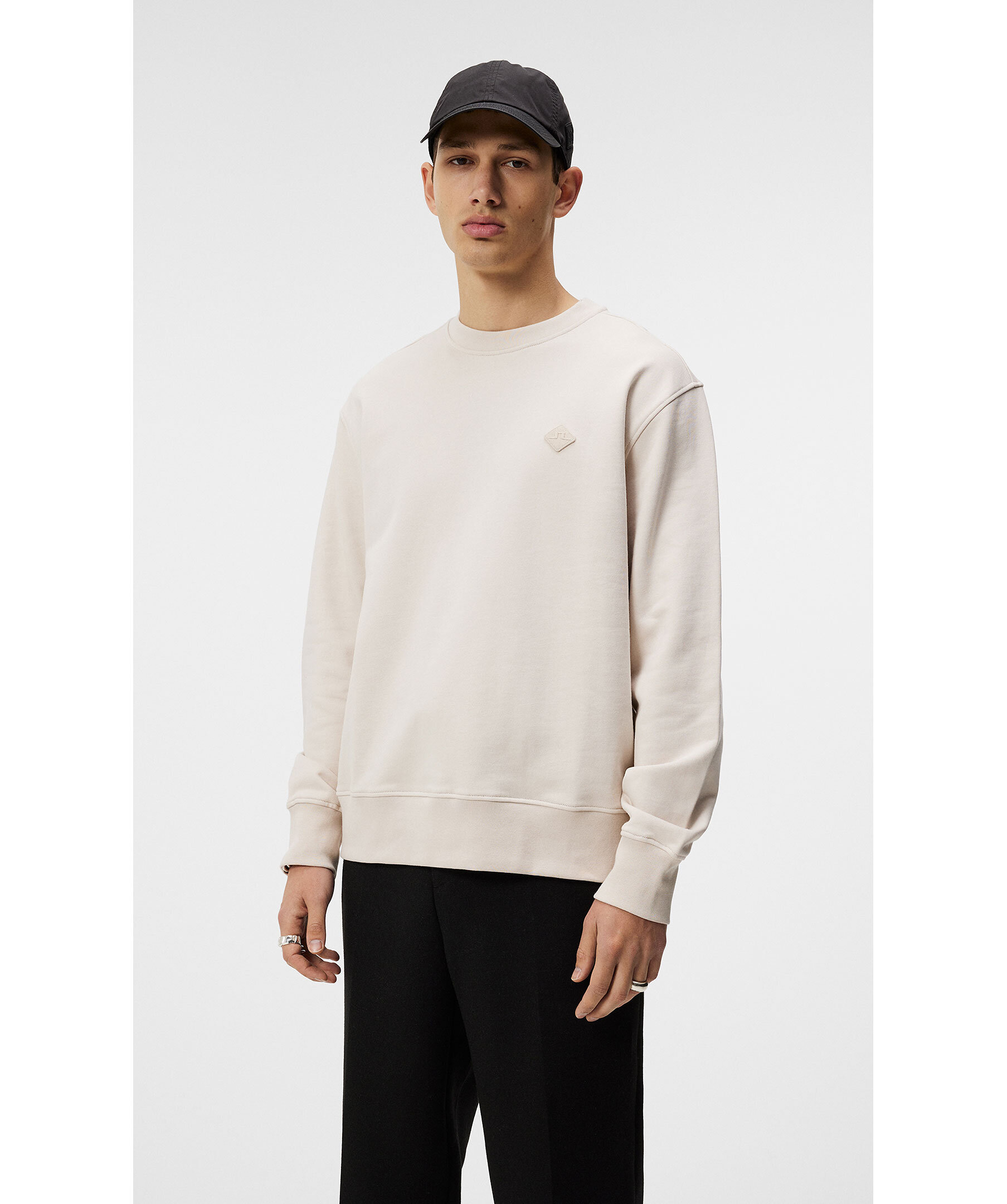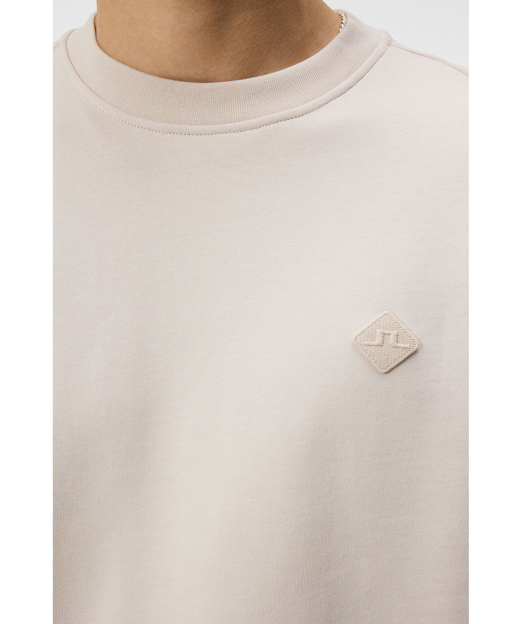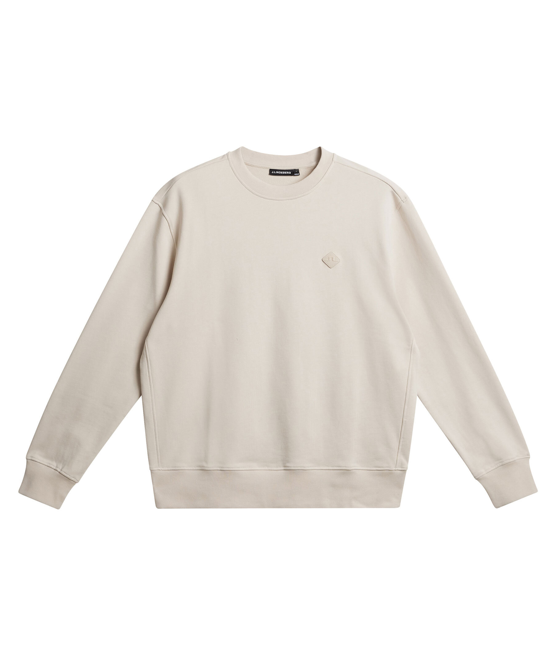 Benvit sweatshirt från J Lindeberg. Rundad halsringning med ribbstickad mudd. Ribbstickade muddar vid ärm-och plaggslut. Broderad patch med logotyp på vänster bröst. Tillverkad i 100% Bomull. Modellen är 187 cm och bär storleken M