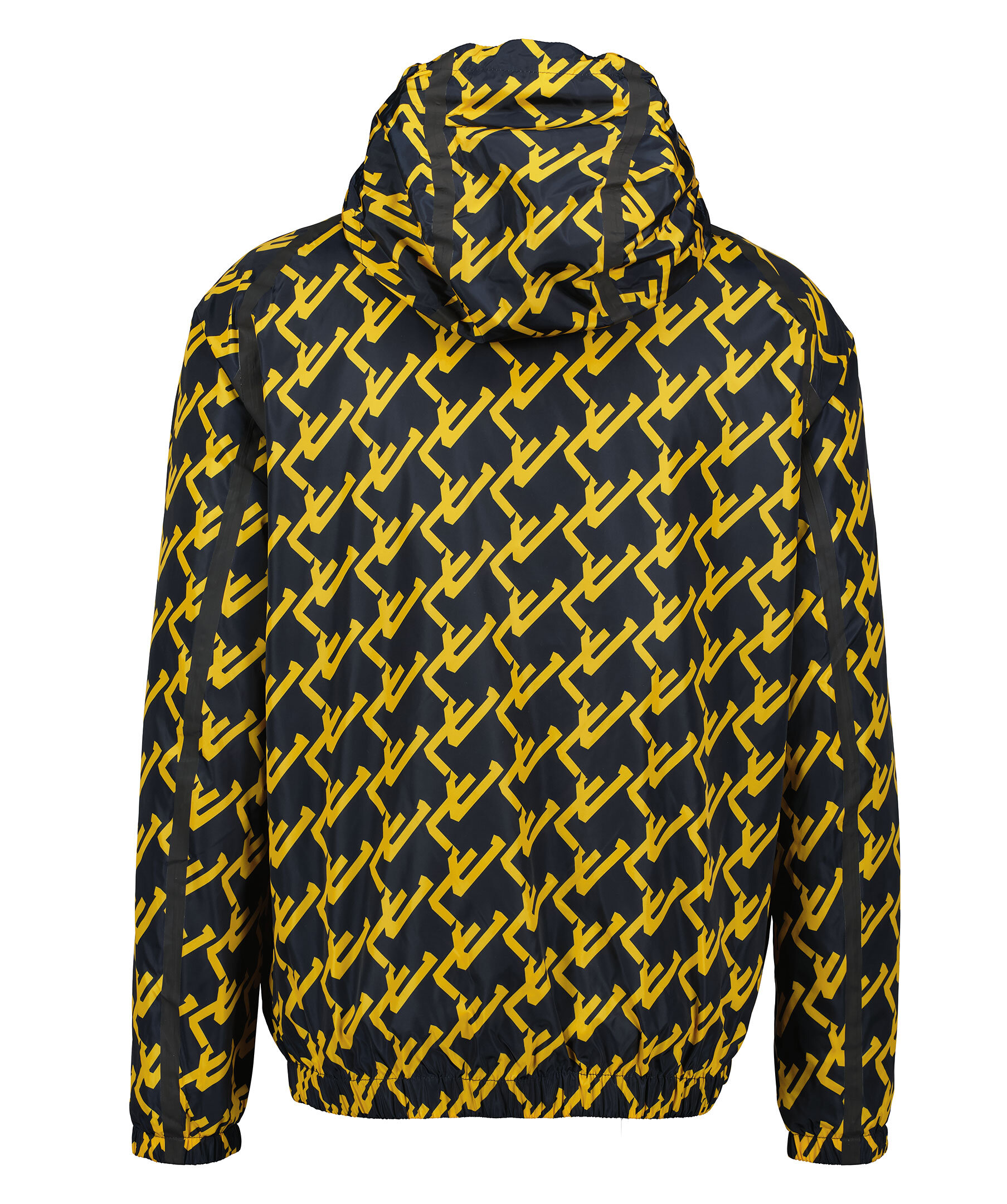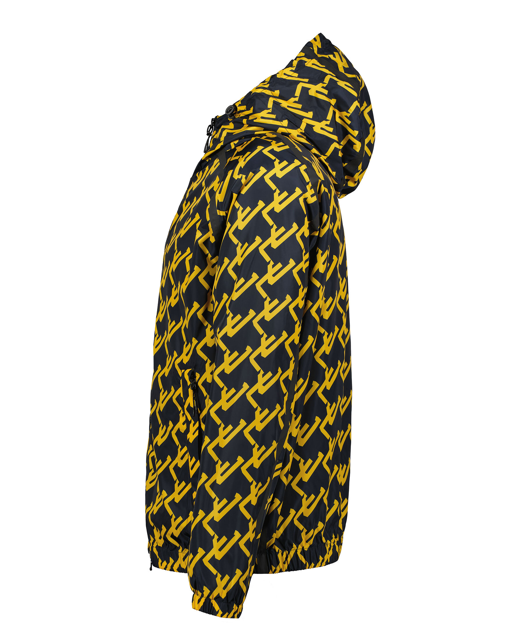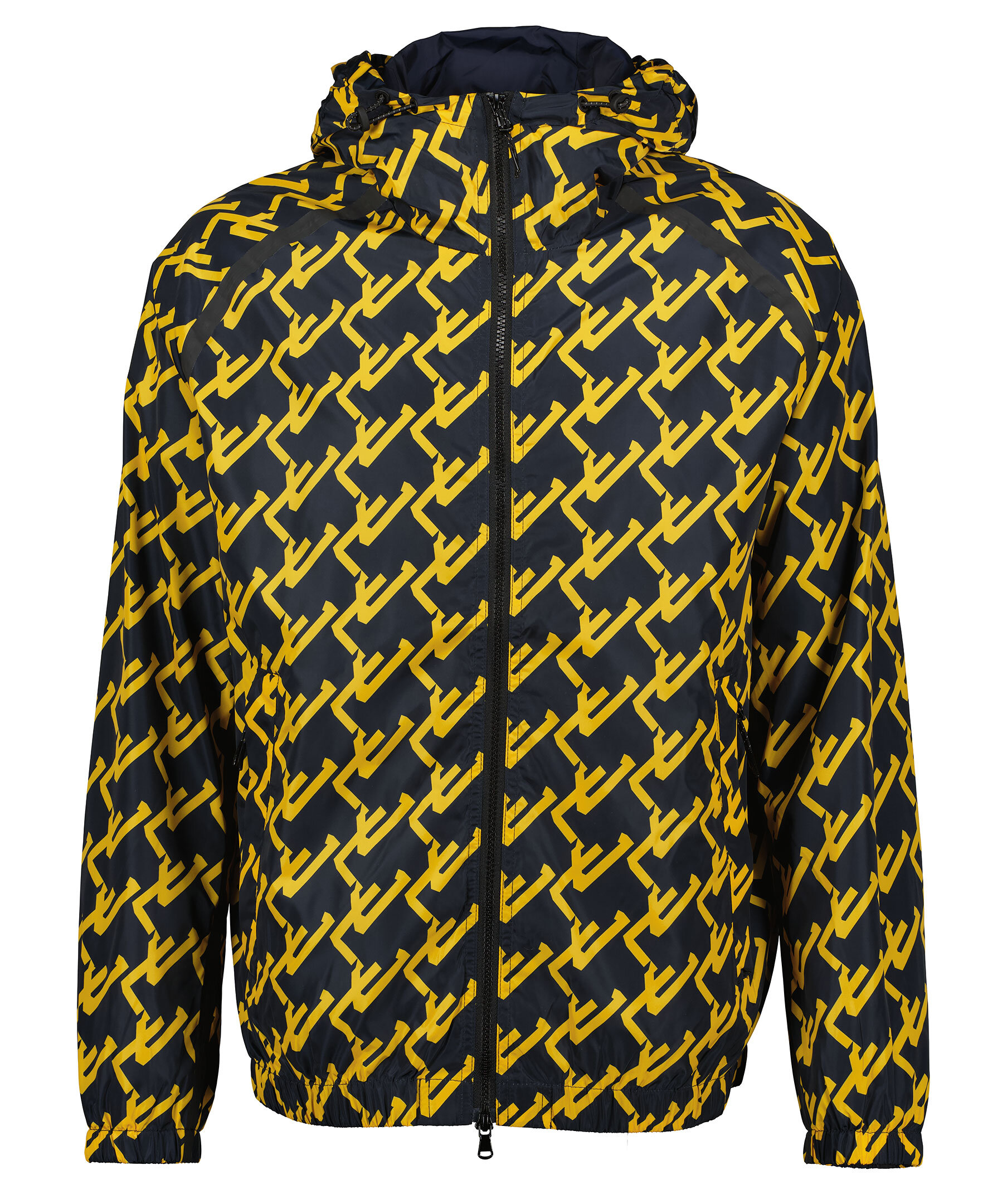 Mörkblå och gul mönstrad jacka från J Lindeberg. Stängs framtill med dragkedja. Dragsko med luva. Tejpade sömmar. resår i ärmslut och plaggslut. Två fickor framtill som stängs med dragkedja.