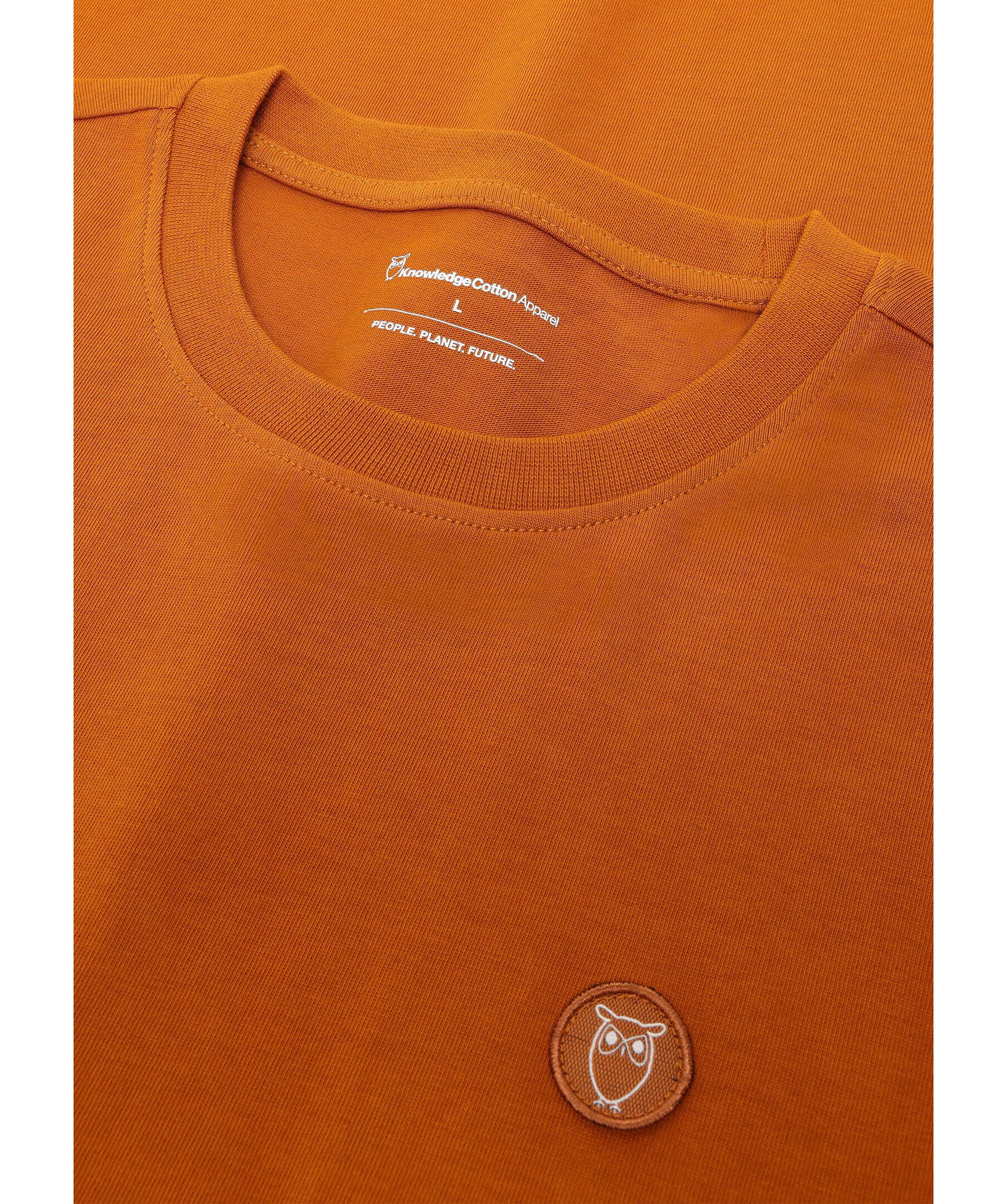 Mörkorange t-shirt från Knowledge Cotton. T-shirten är designad med rund halsringning och en tonal ugglebroderad lapp på bröstet. Tillverkad i mellanvikts bomullsjersey.